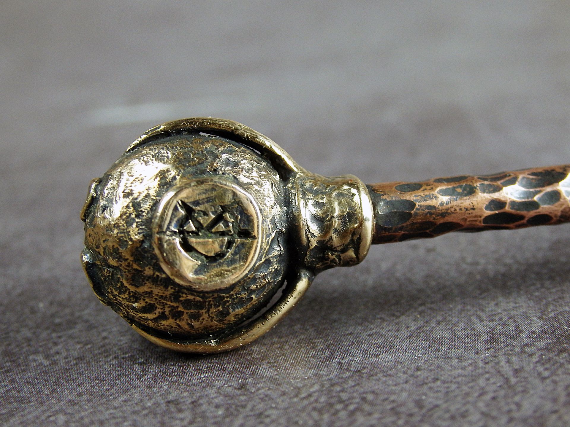 To make this item, a wax model was cut out by hand. Then, using the lost wax method, bronze parts were cast.