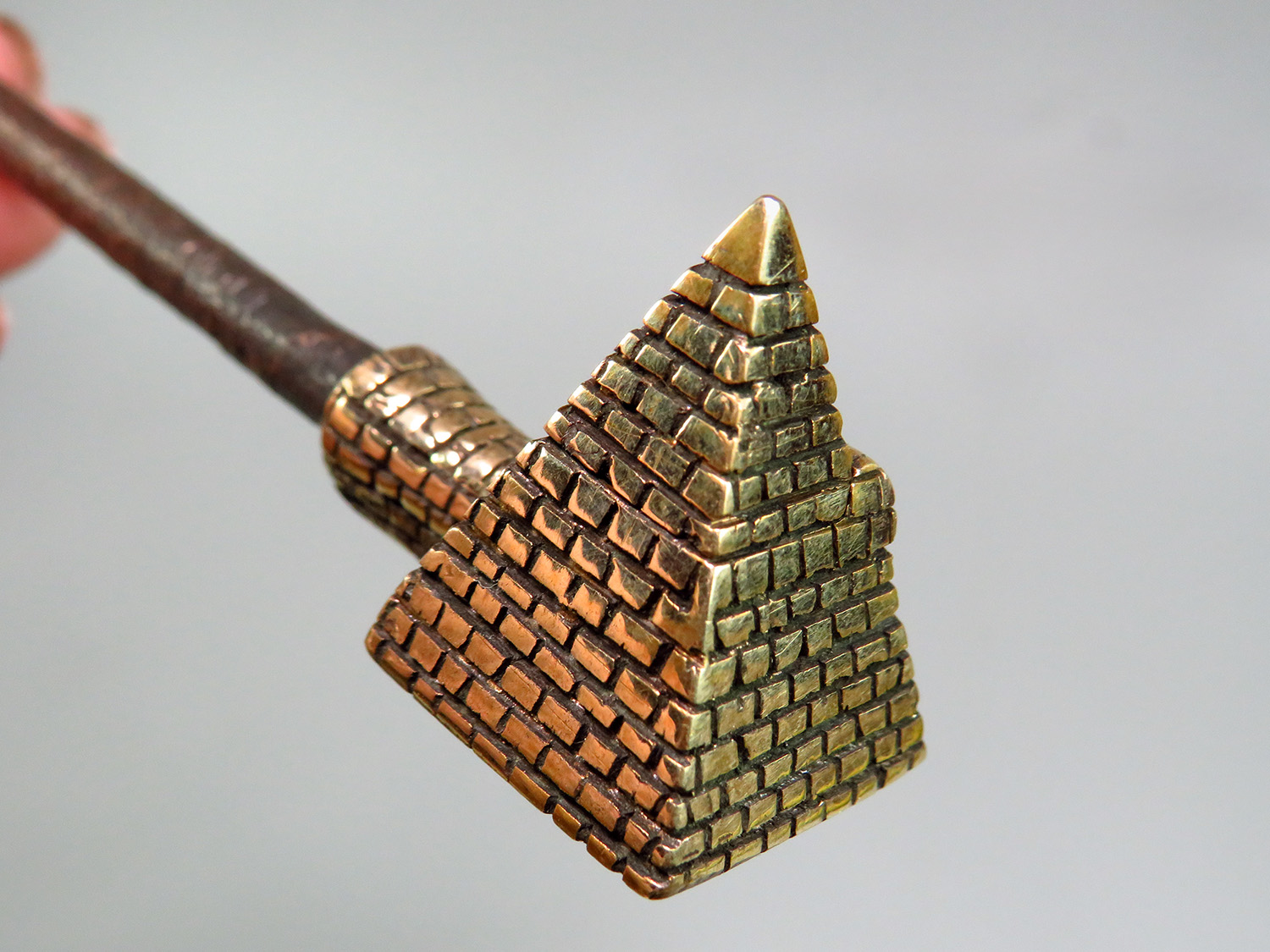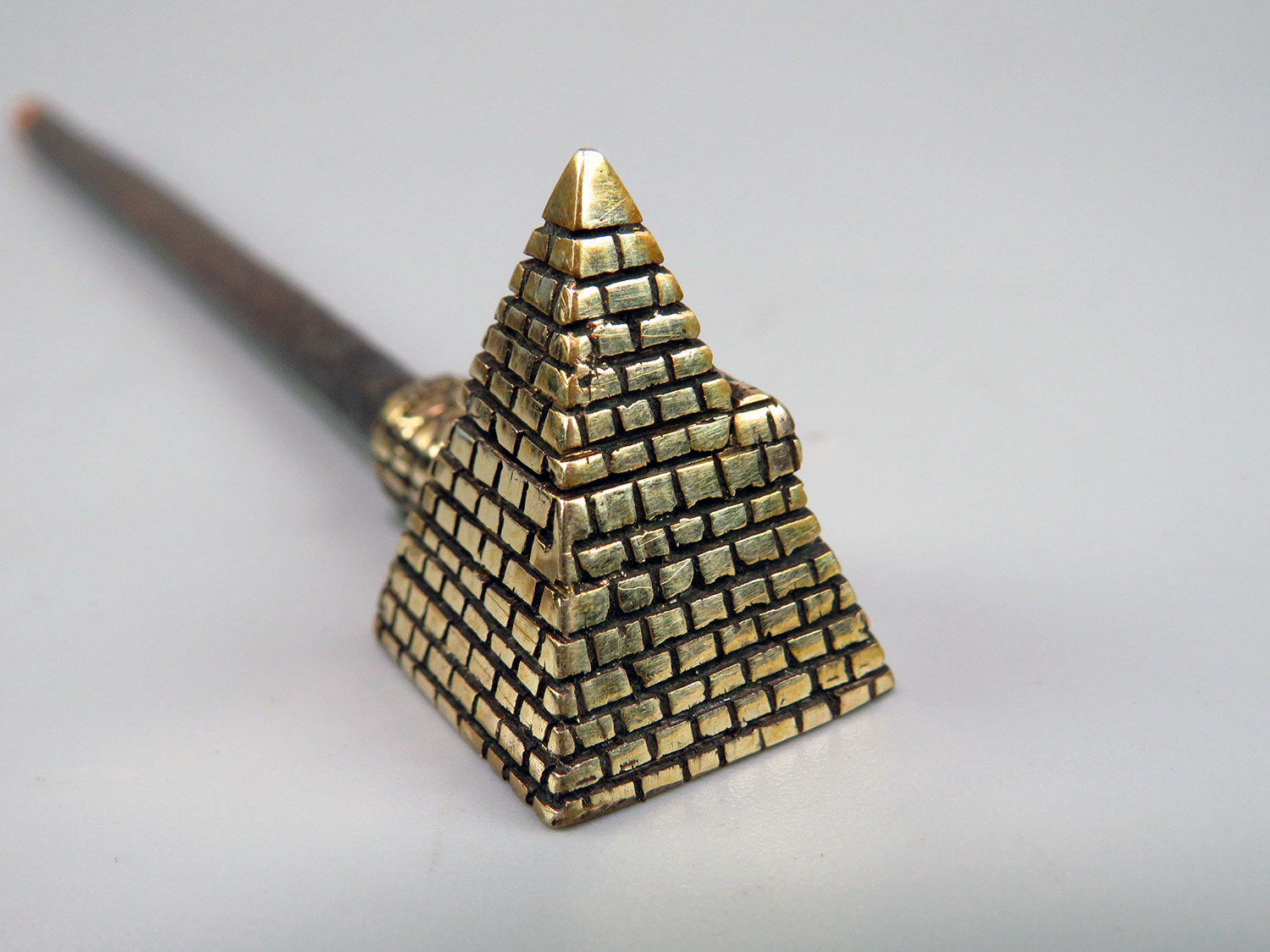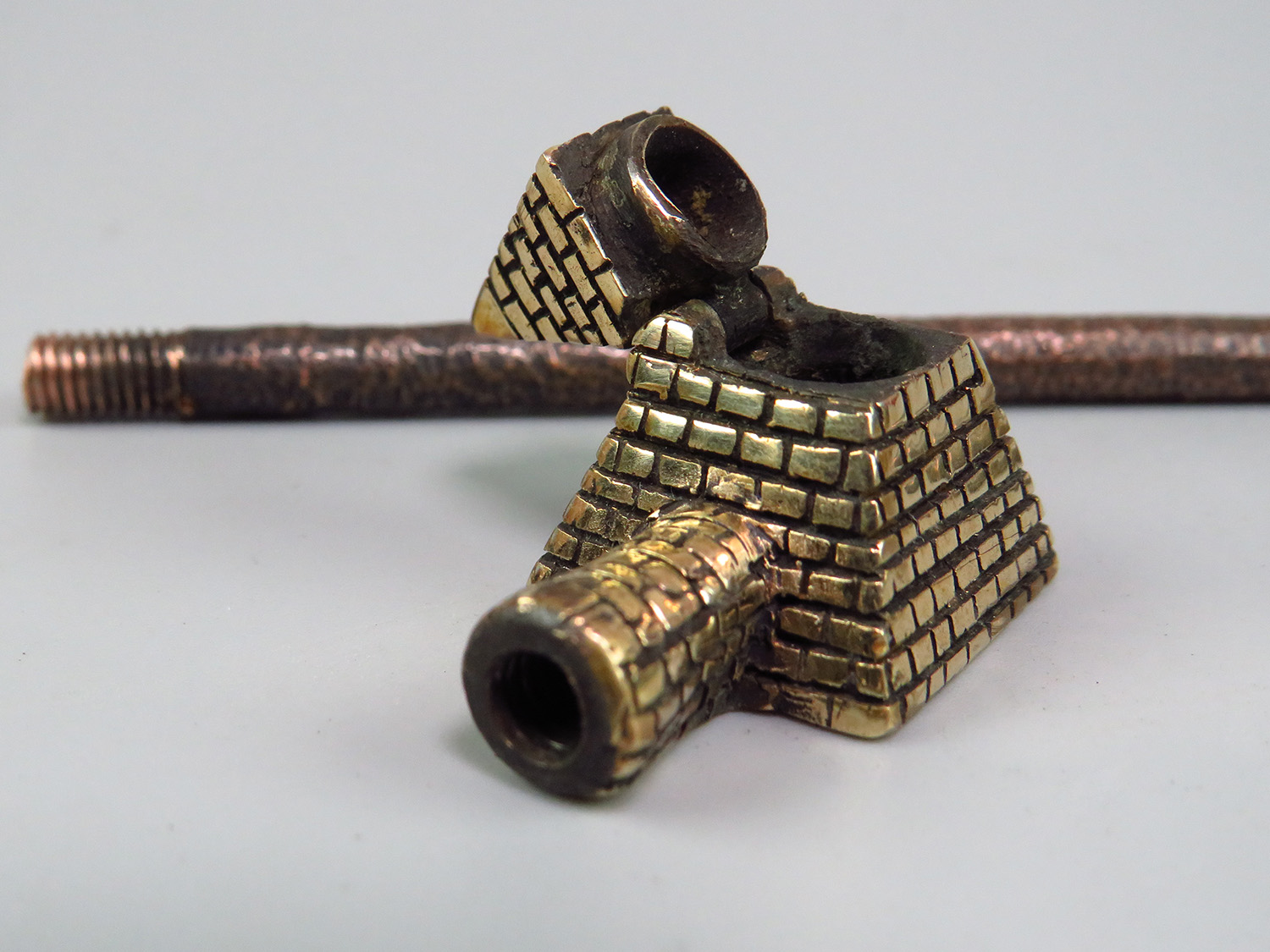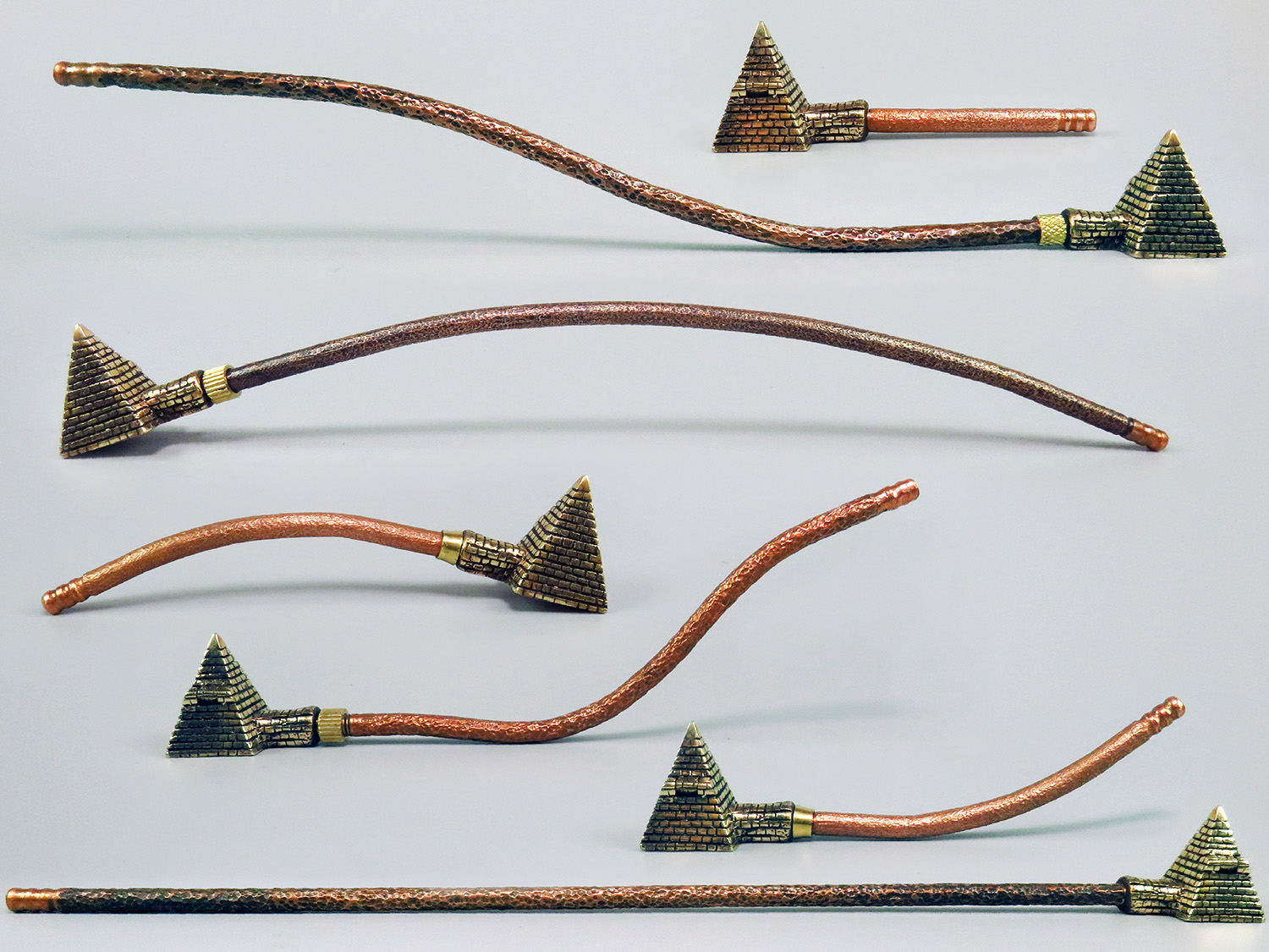 A small bronze pipe in the shape of an Egyptian pyramid. Note that this pipe has a lid that flips to the side. The mouthpiece is made of copper, it is screwed on, can have a length (from 3 to 30 cm) and a shape at the request of the buyer.