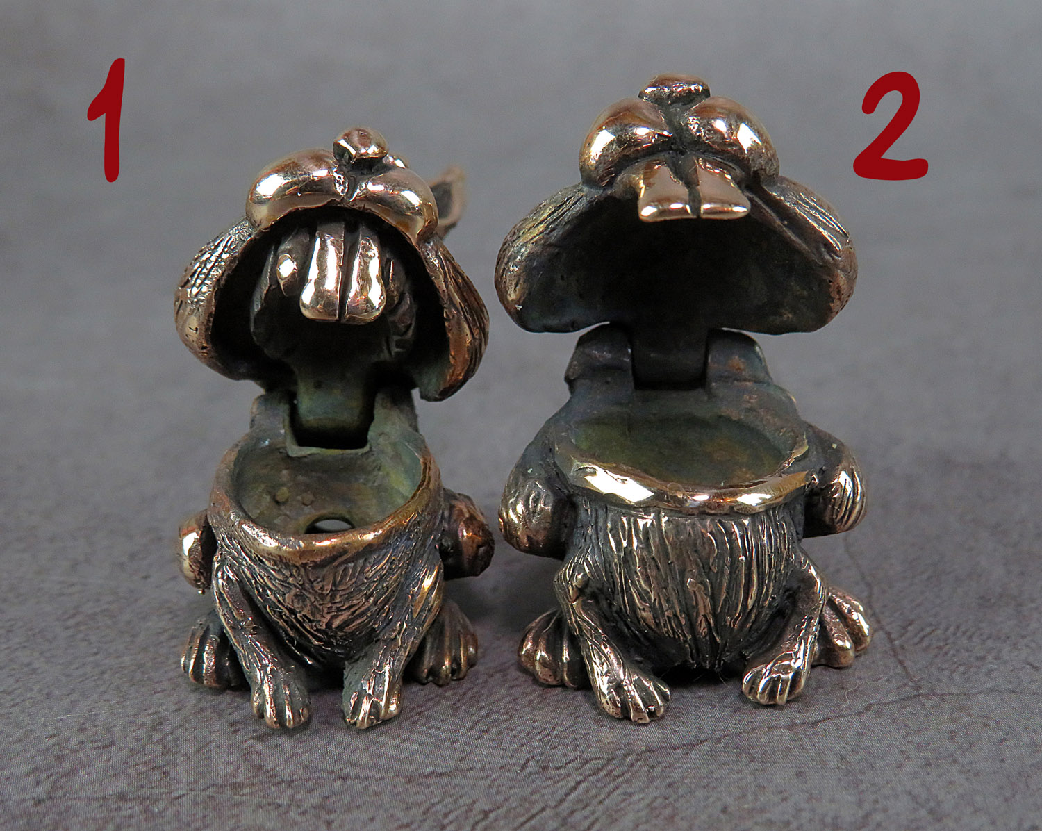 To make this item, a wax model was cut out by hand. Then, using the lost wax method, bronze parts were cast.