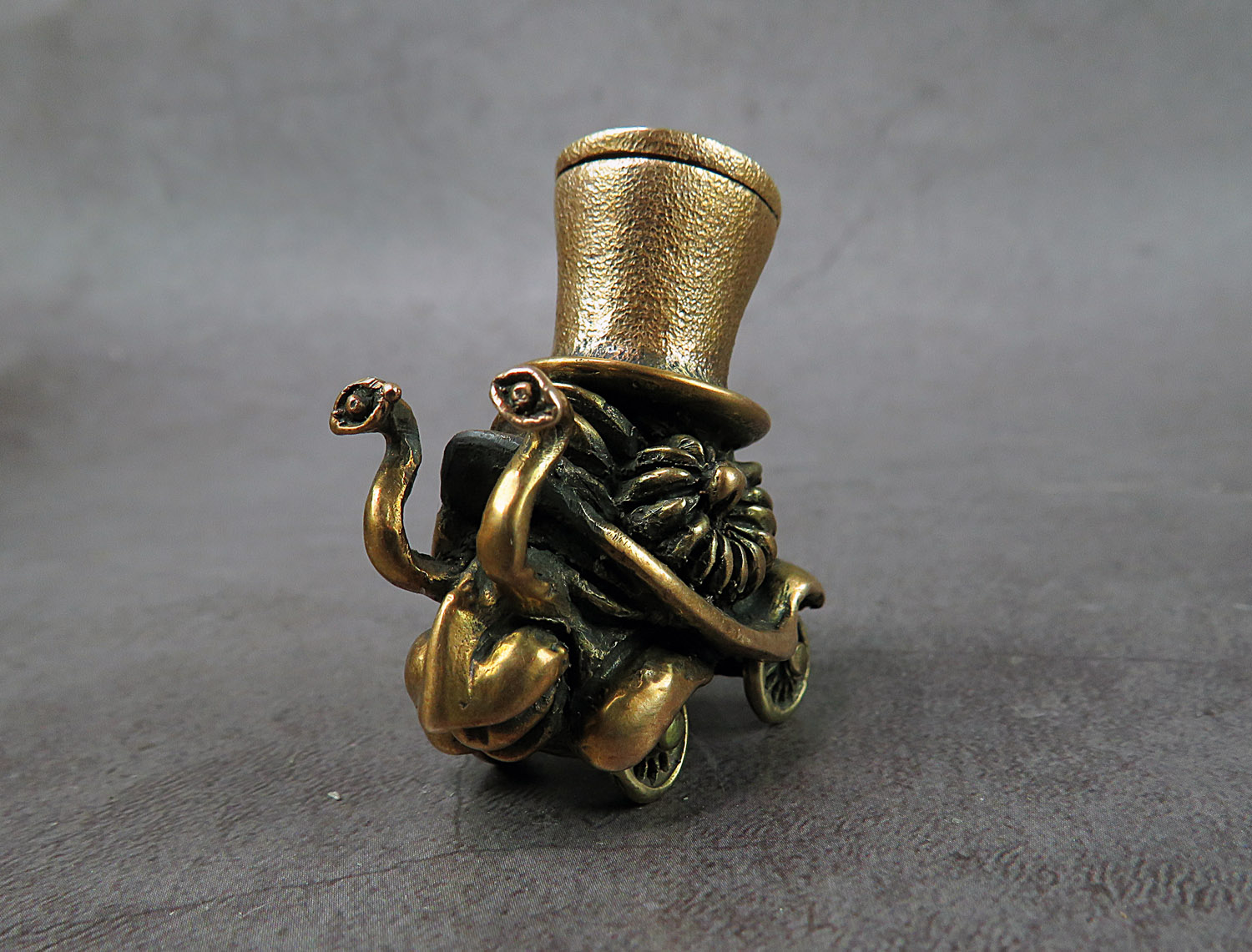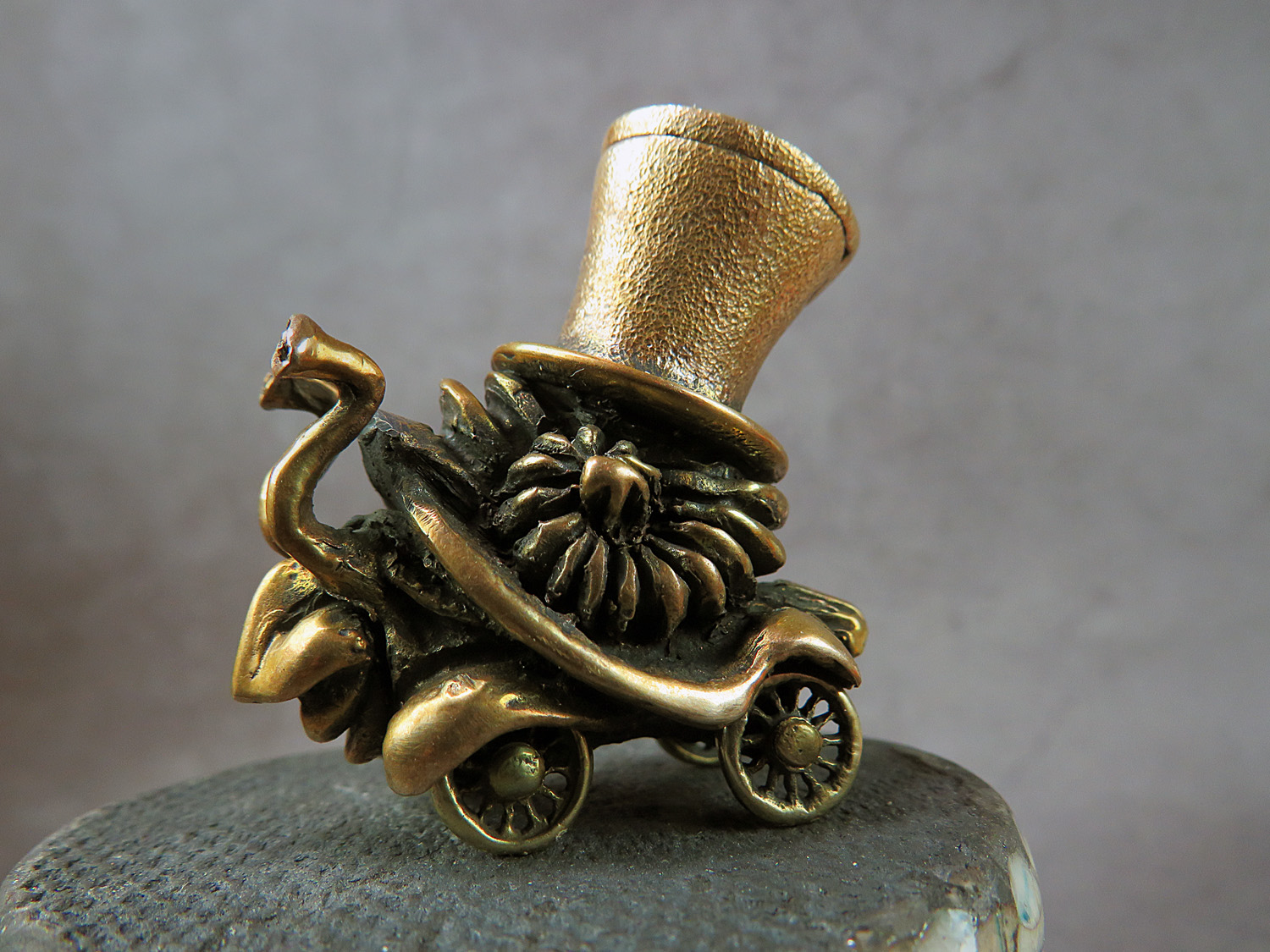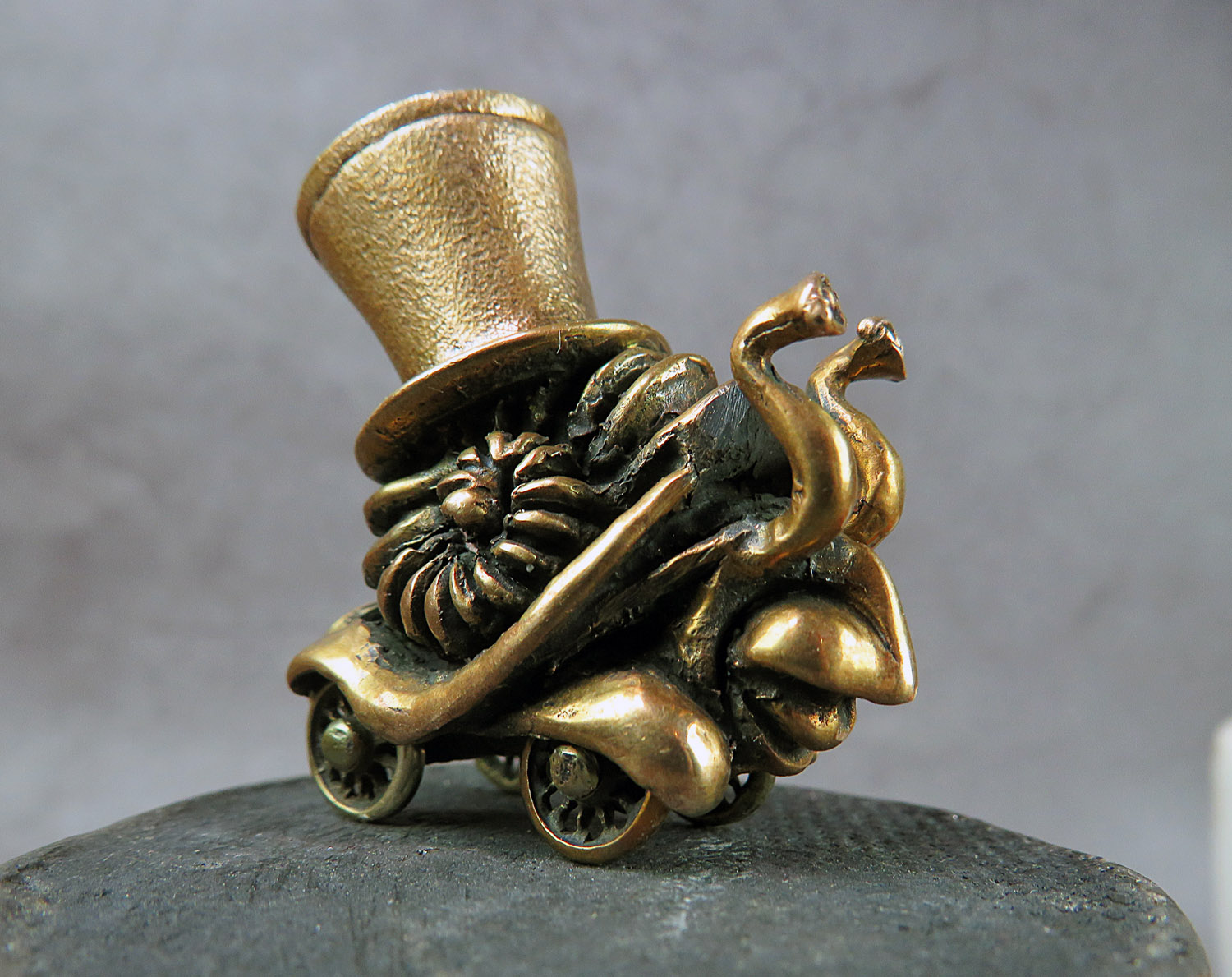 A funny tiny moving bronze snail in a cylinder and on wheels, a postmodern symbol of our time.