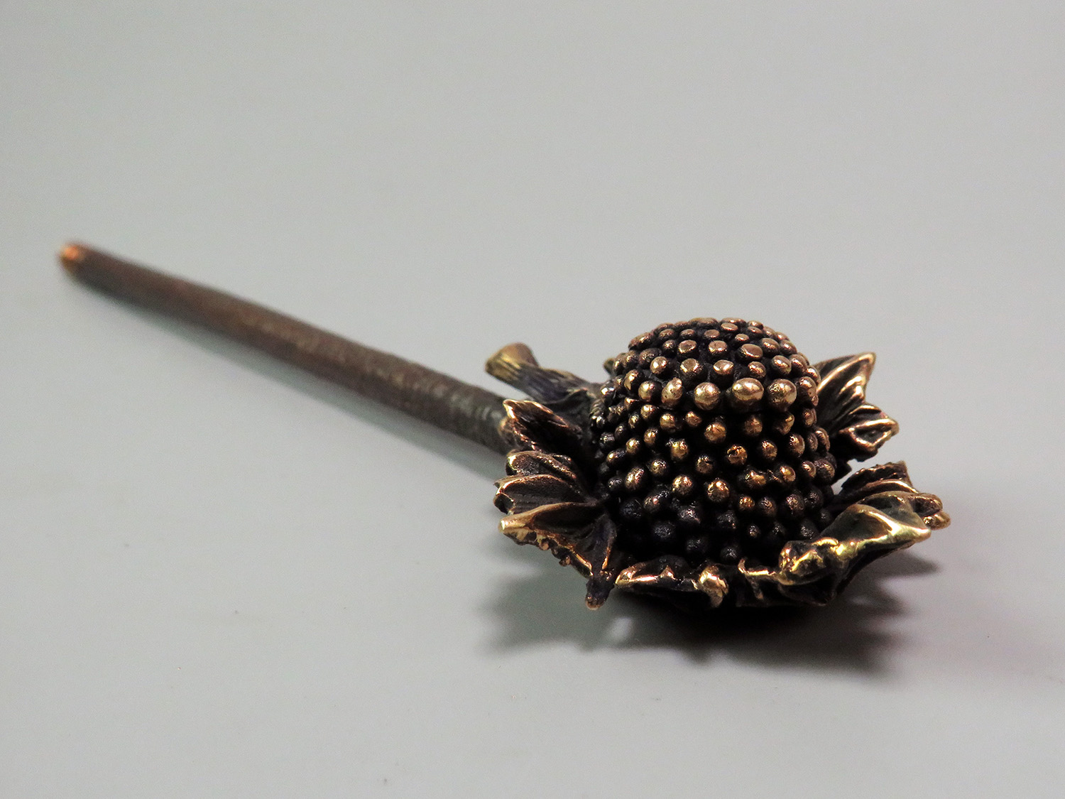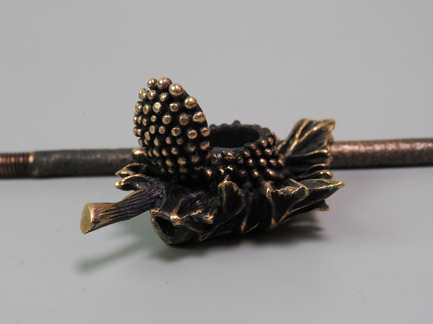 A bronze pipe shaped like a berry resting on a leaf, evoking warm summers and carefree holidays.