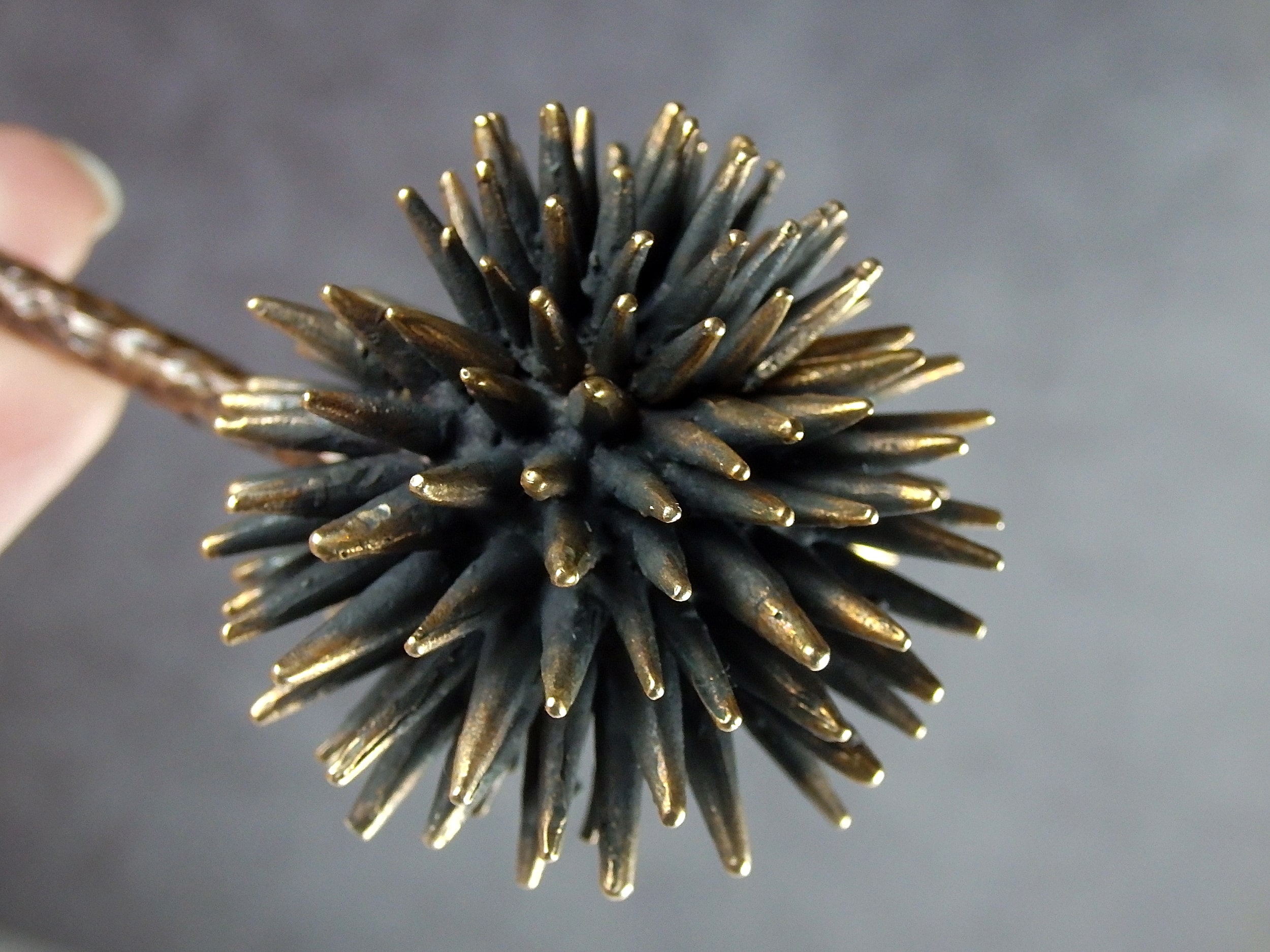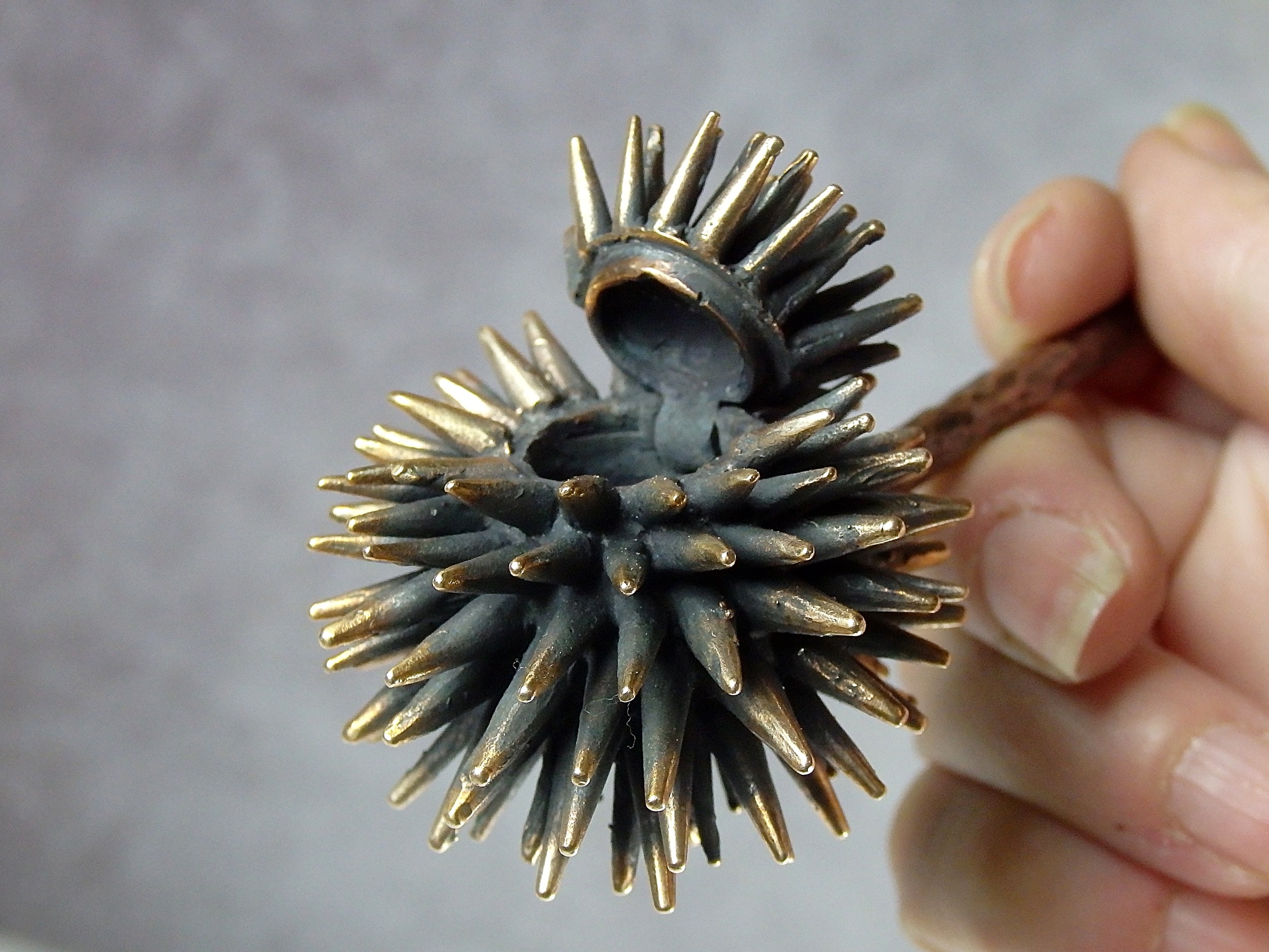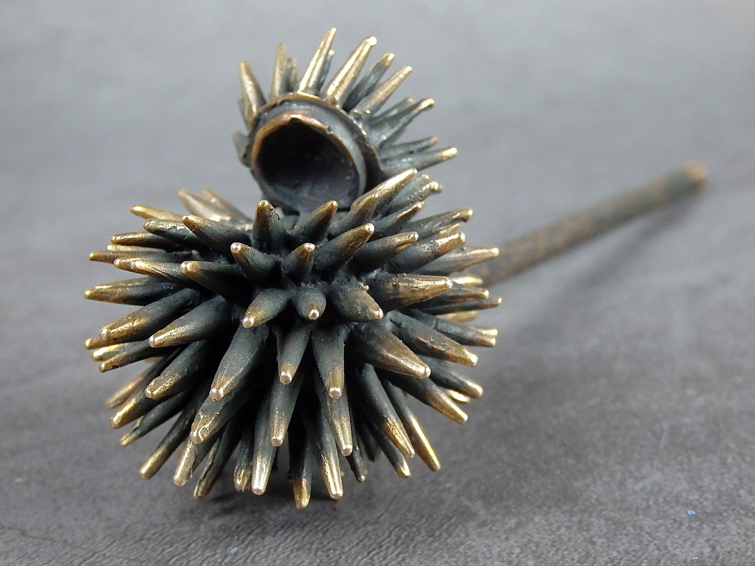 Bronze smoking pipe with a bowl in the form of a sea urchin. The mouthpiece is made of copper, it is screwed on, can have a length (from 3 to 30 cm) and a shape at the request of the buyer. The pipe is working, not decorative, the model is tested by the master.