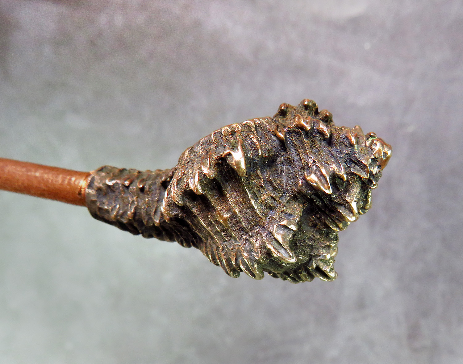 To make this item, a wax model was cut out by hand. Then, using the lost wax method, bronze parts were cast.