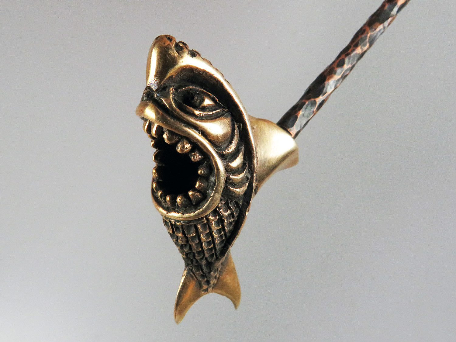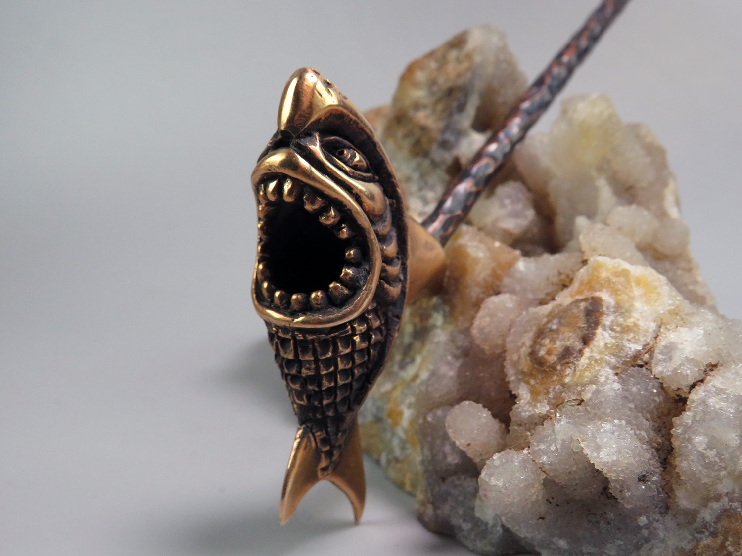 A small bronze pipe with a bowl shaped like a shark with its jaws wide open. It will appeal to those who love speed, brutality, and, of course, the sea.