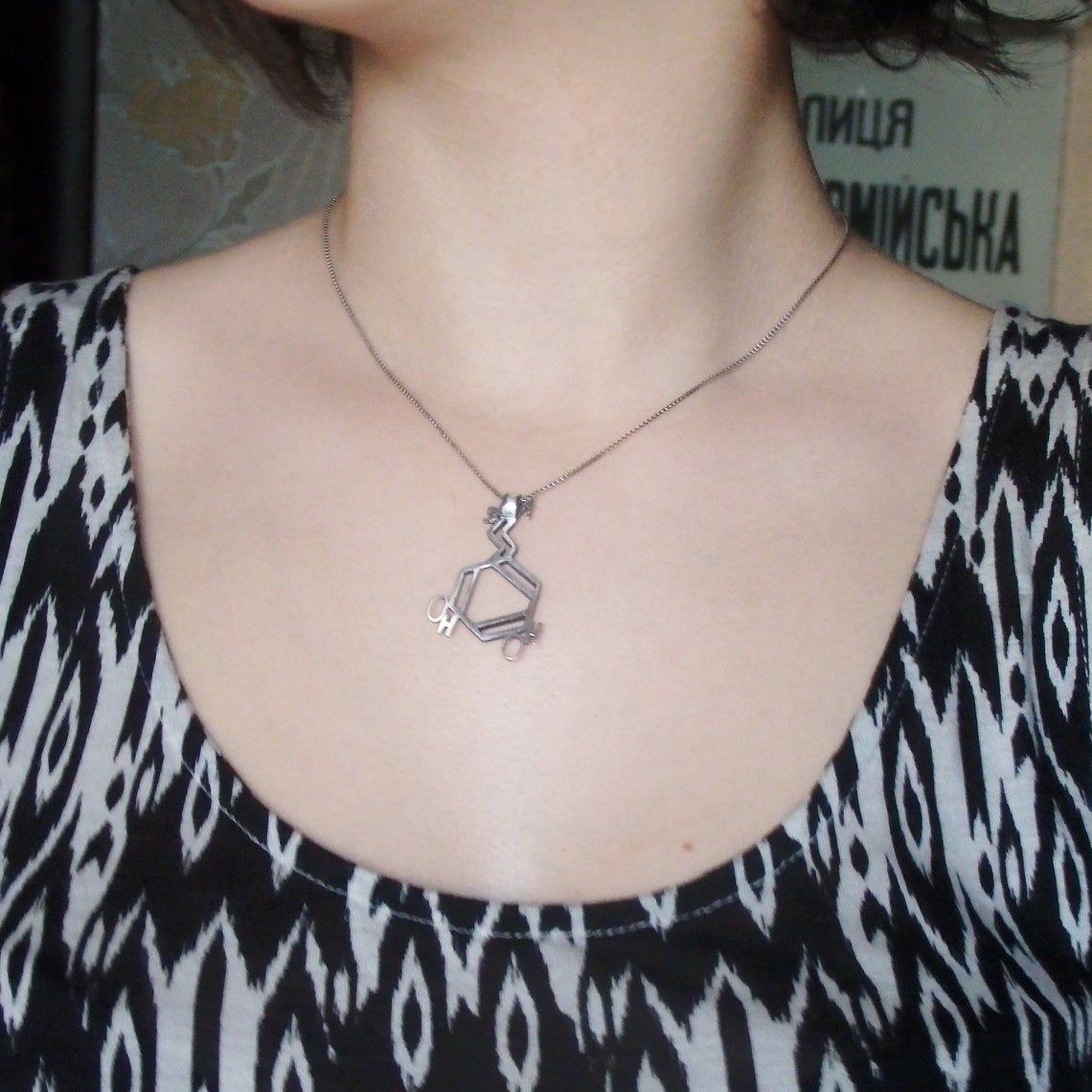 Our silver pendant in the form of a dopamine molecule is the material embodiment of pure chemical joy. This is a universal gift, as it is multifaceted and gender neutral. Having presented this decoration to a friend or a loved one, you literally give him vivacity and enthusiasm, and if you decorate yourself with this pendant, you will always carry this emotion with you. And even in the nervous hard days this small silver jewelry will cheer up its owner.