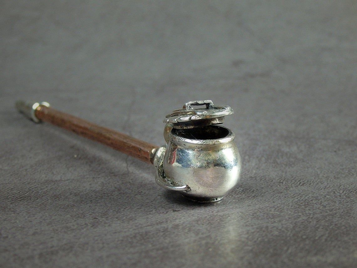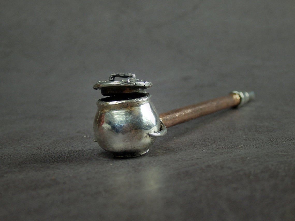 Handmade silver smoking pipe with a bowl in the shape of a pot with a lid. The mouthpiece is made of copper and silver, screwed on, can have a length (from 3 to 30 cm) and a shape at the request of the buyer. The pipe is working, not decorative, the model is tested by the master. Note! When choosing a mouthpiece, keep in mind that this pipe can stand on a plane only with straight mouthpiece.