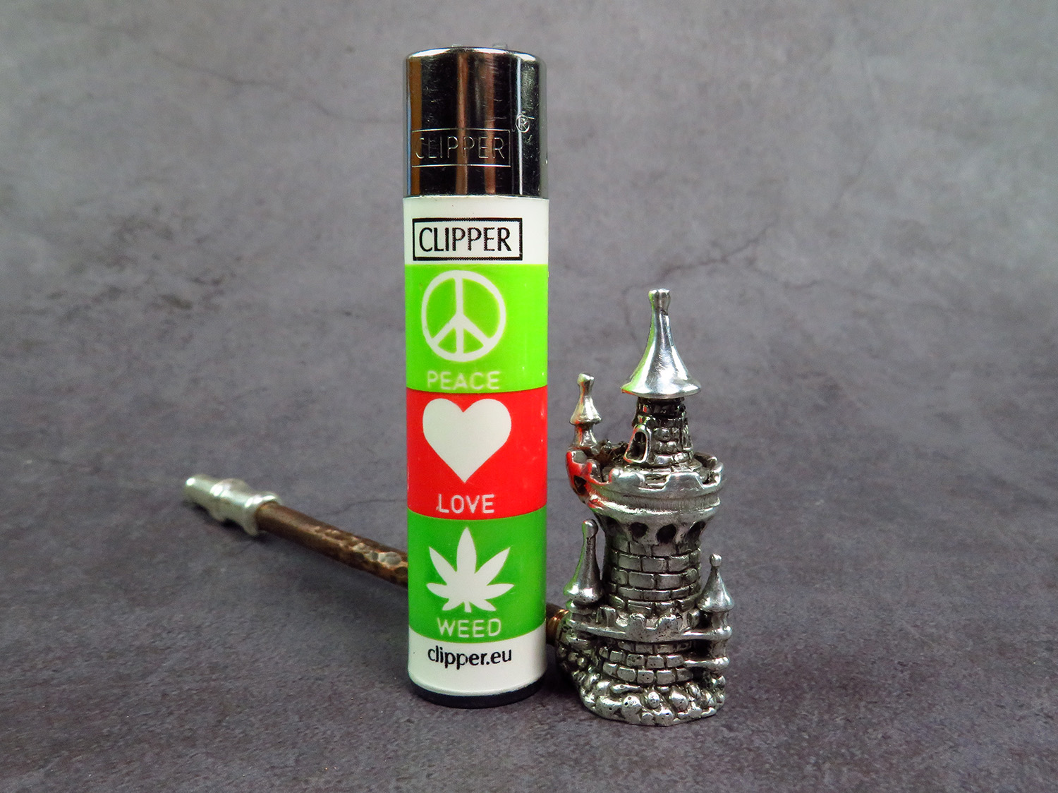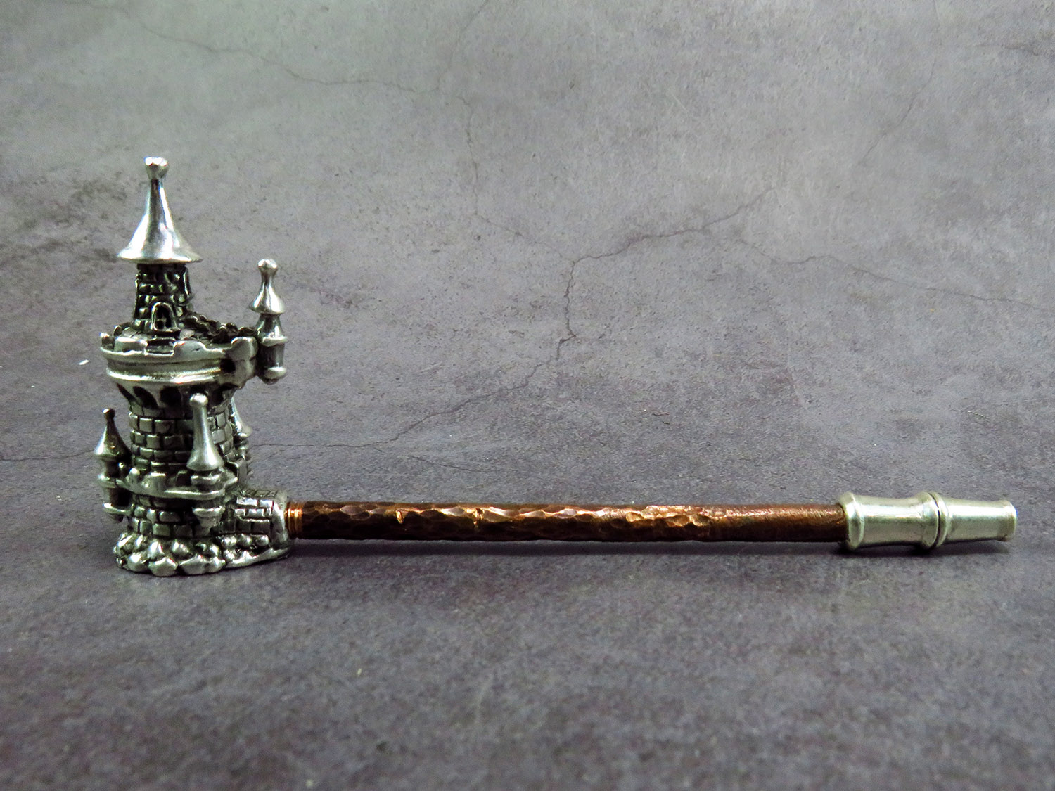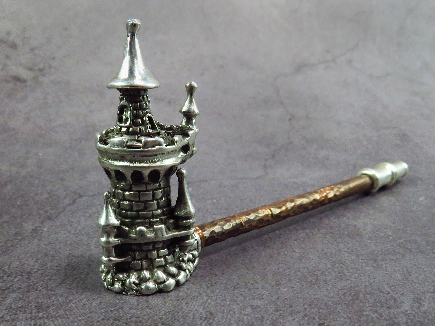 Handmade silver smoking pipe in the shape of watchtower with roof - lid.
