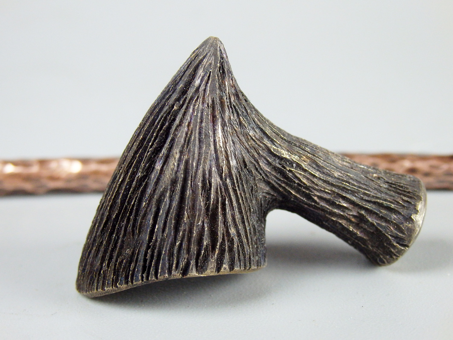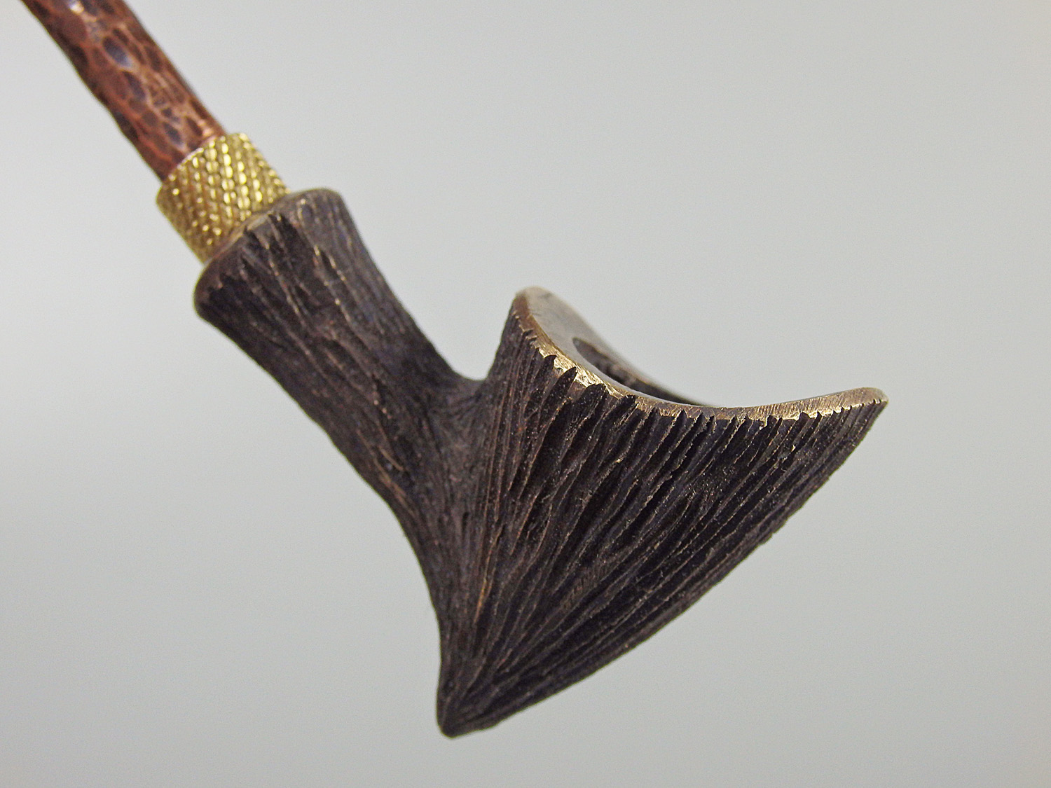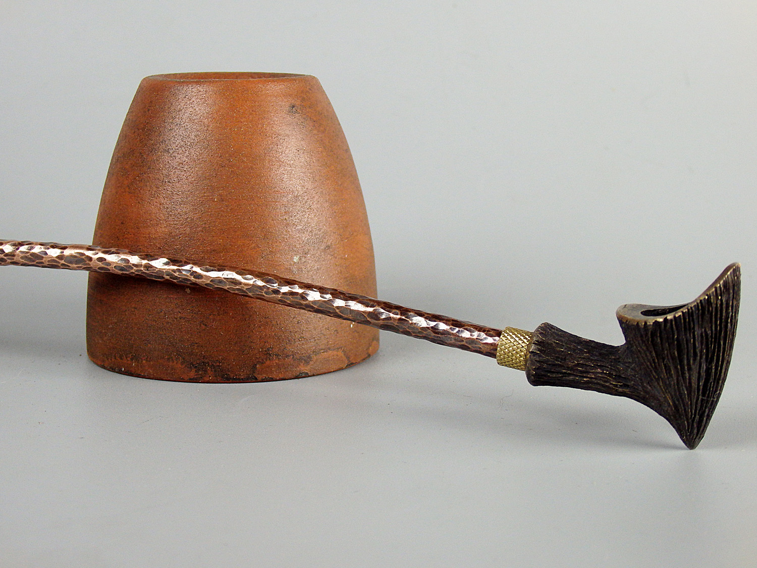 A small bronze pipe with a beveled edge and wood texture. The mouthpiece is made of copper, it is screwed on, can have a length (from 5 to 30 cm) and a shape at the request of the buyer. The pipe is working, not decorative, the model is tested by the master.