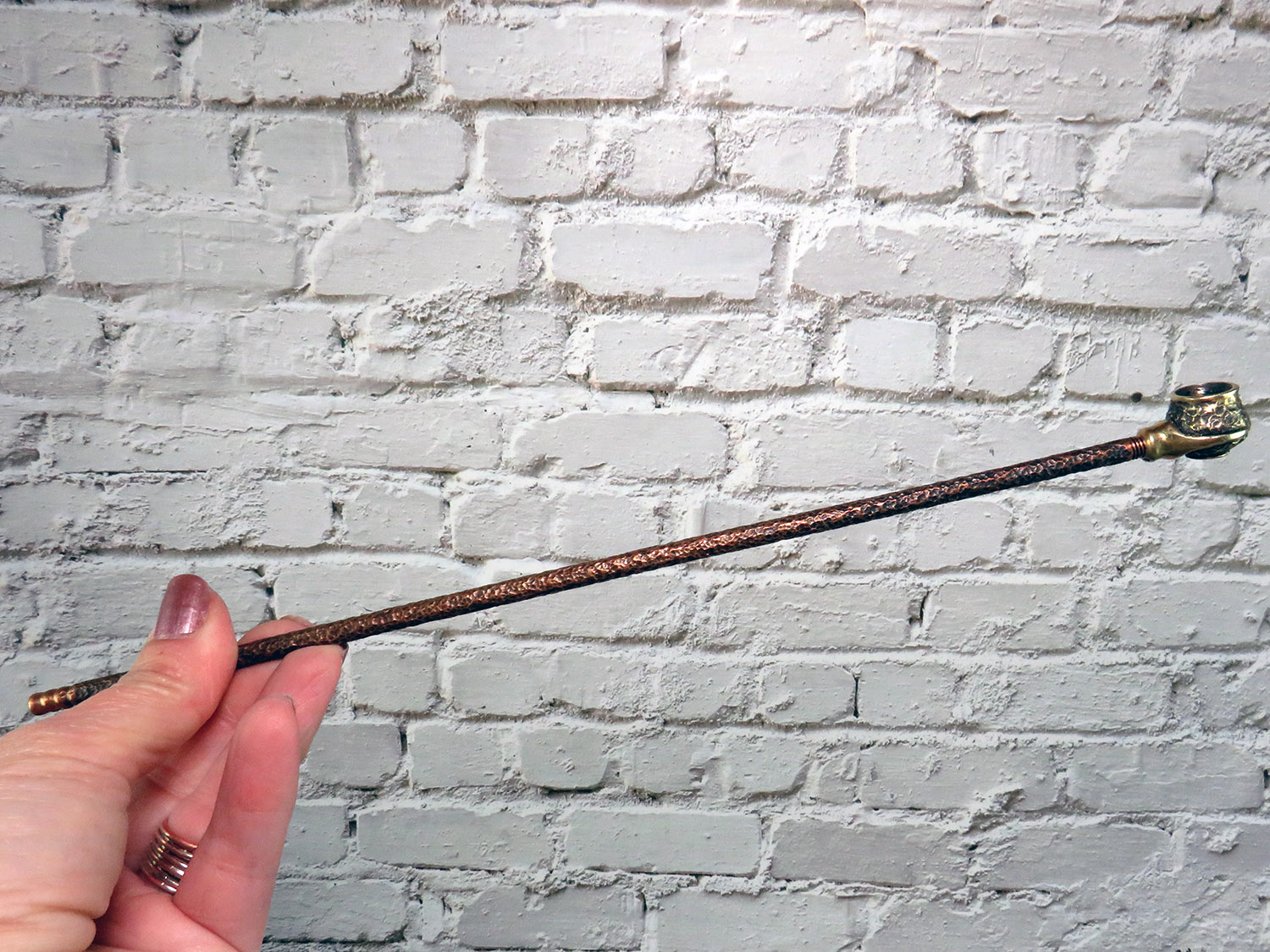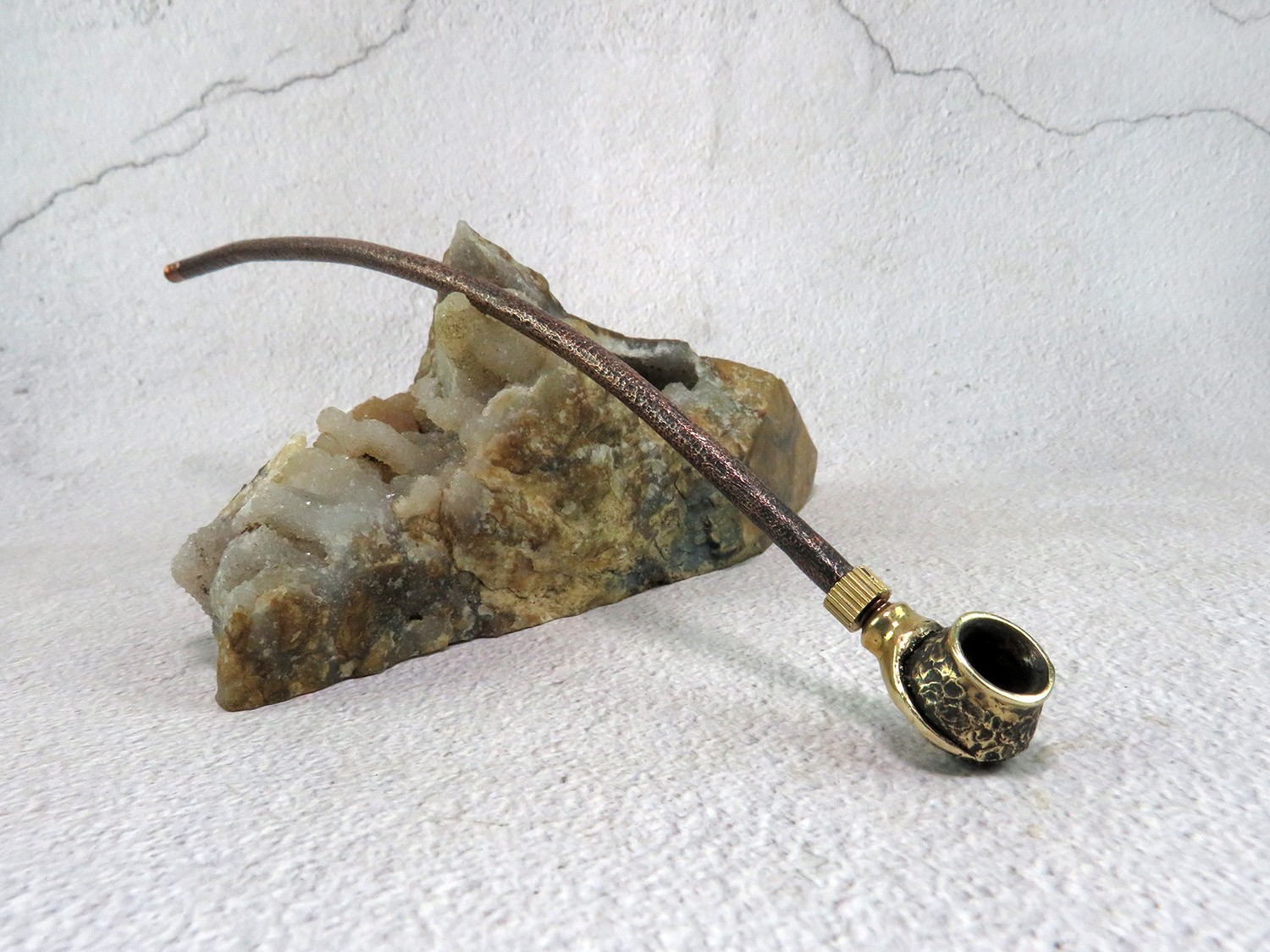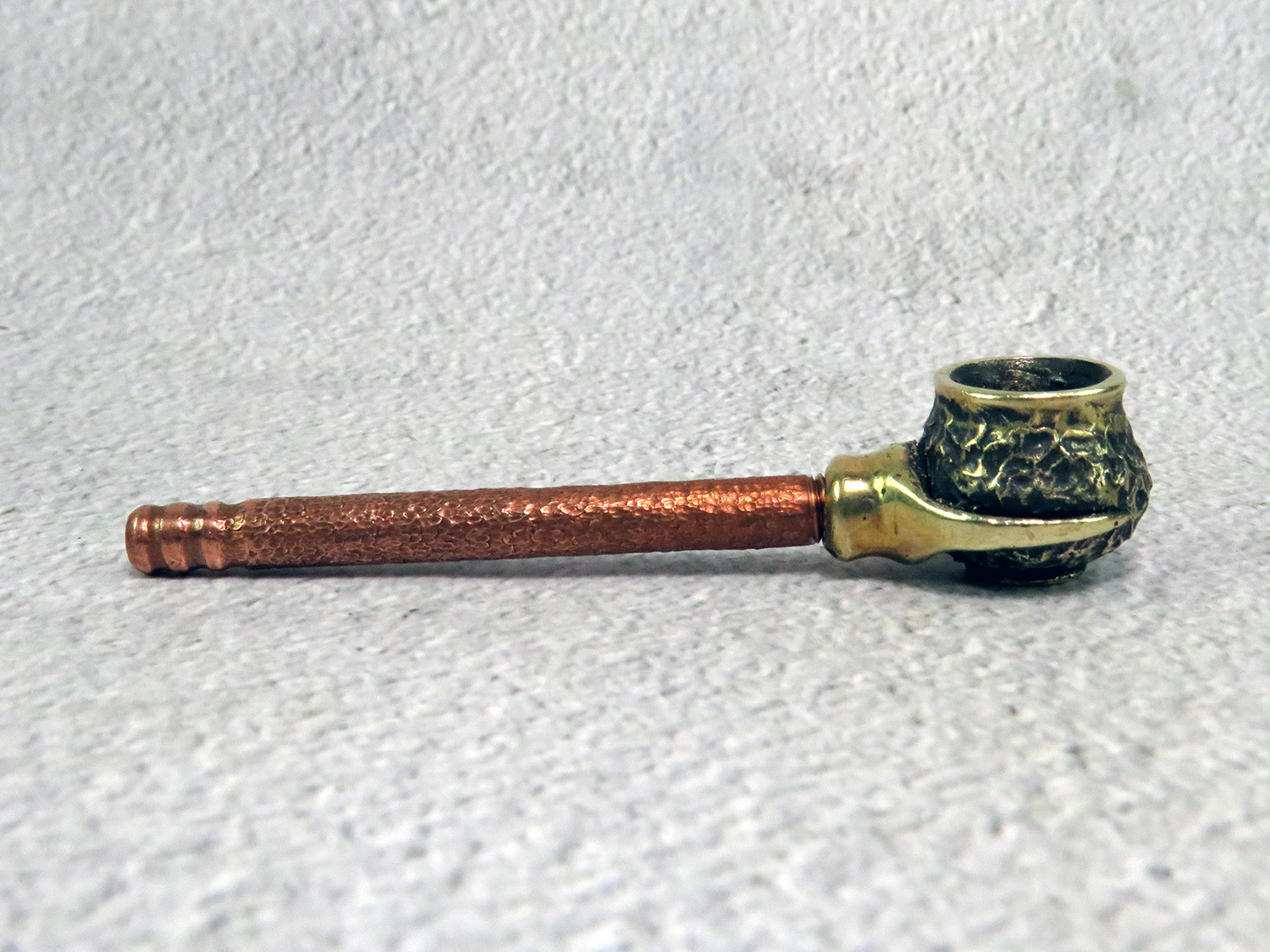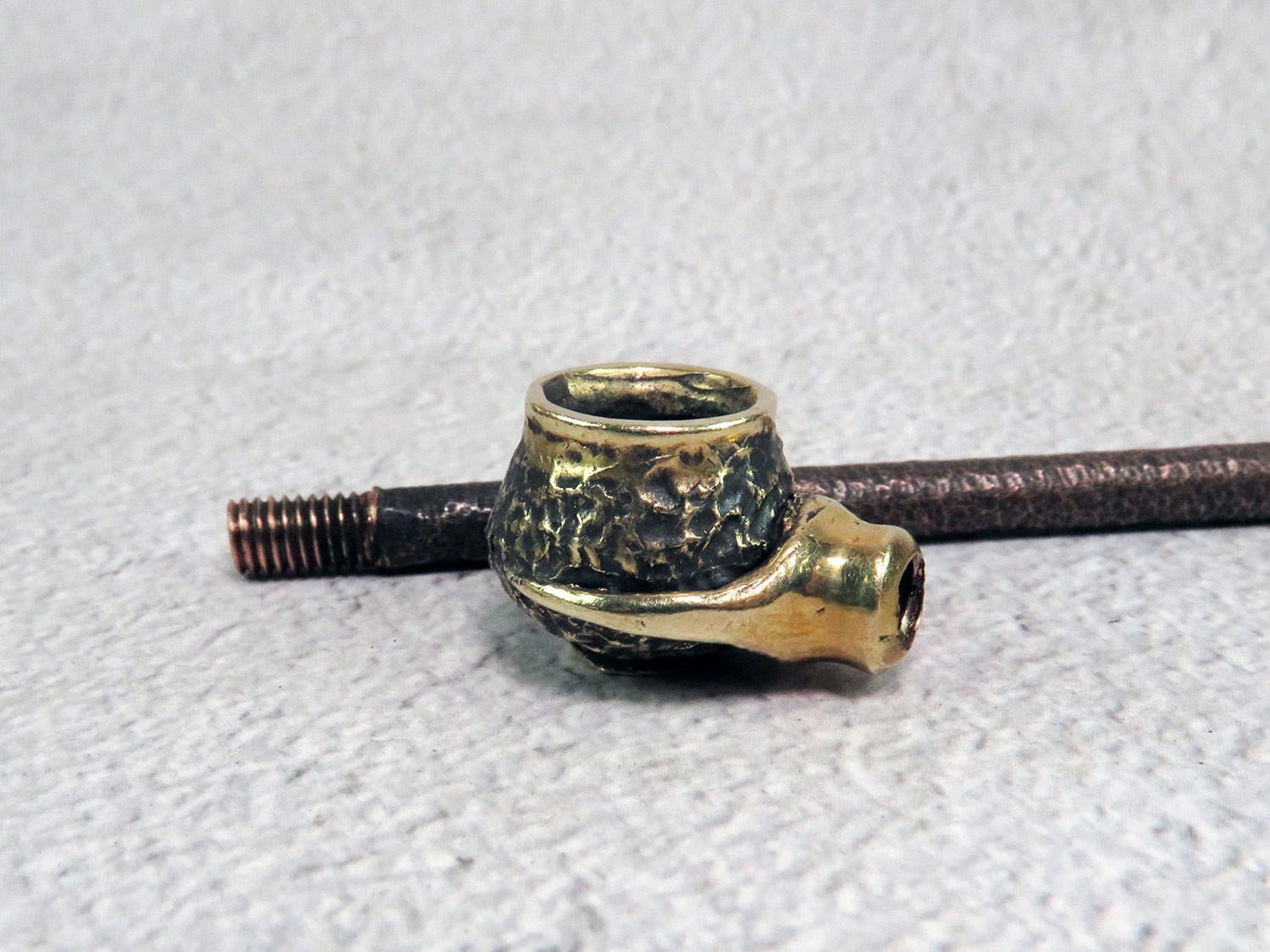 Simple small bronze pipe with a bowl in the shape pot with grip. The mouthpiece is made of copper, it is screwed on, can have a length (from 3 to 30 cm) and a shape at the request of the buyer.
