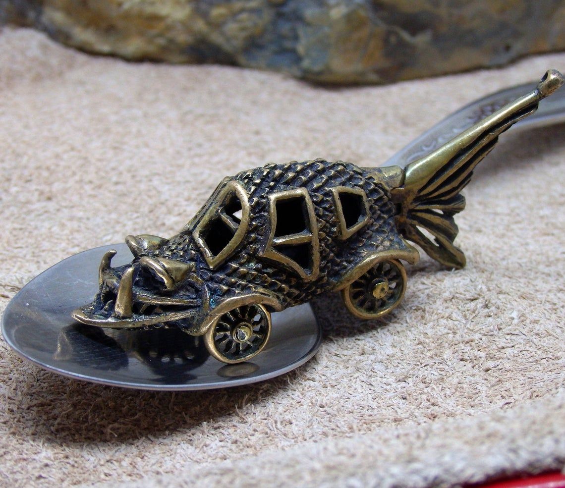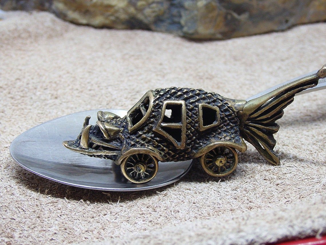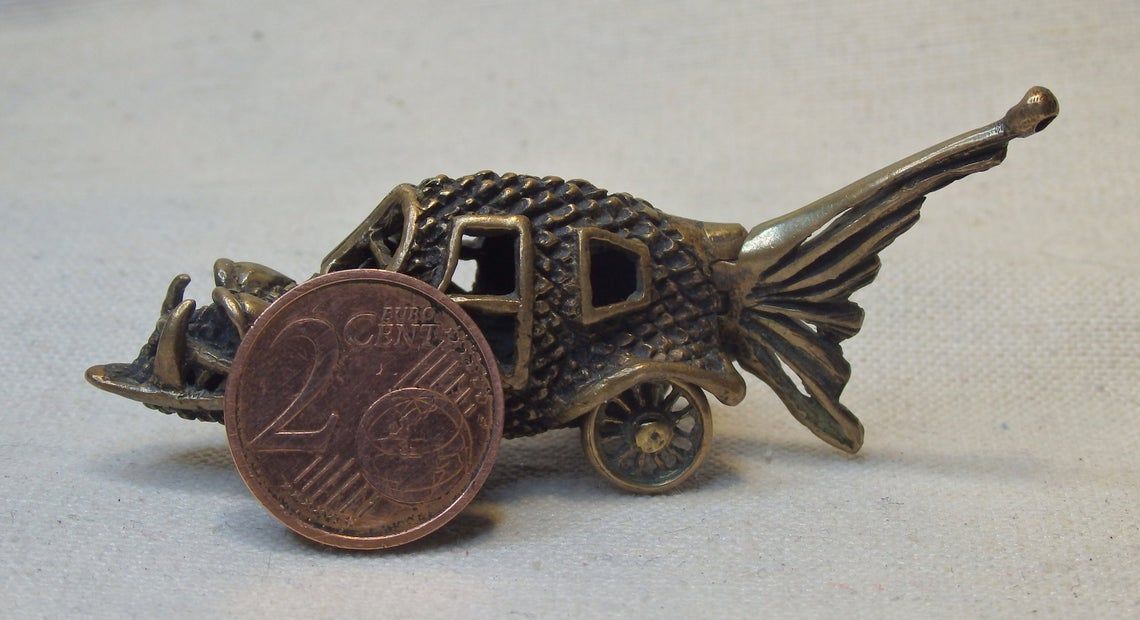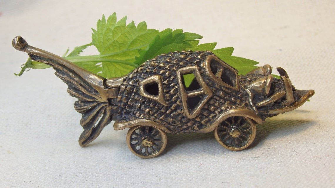 Small bronze souvenir toy. Fish-bus, miniature fish minivan - little funny bronze machine with a predatory fanged snout. The fish has real wheels and a moving fishtail. This toy can be rolled on the table or just admire.
