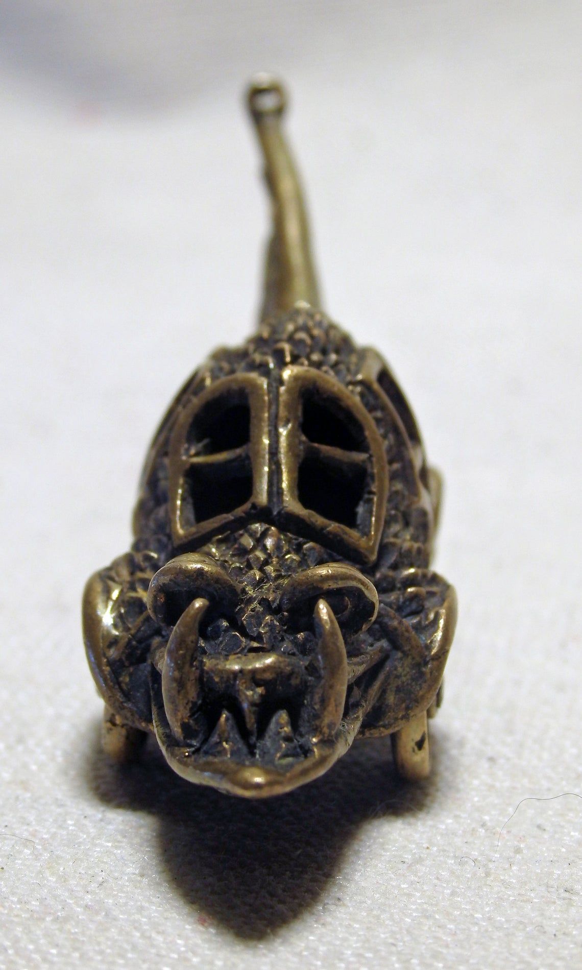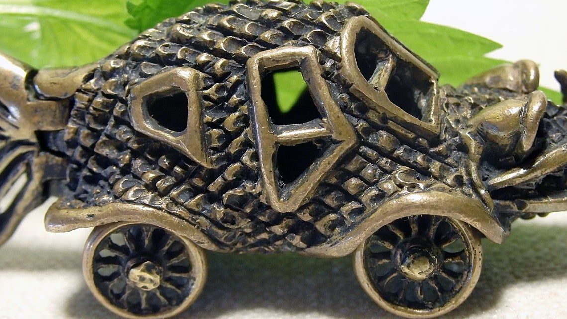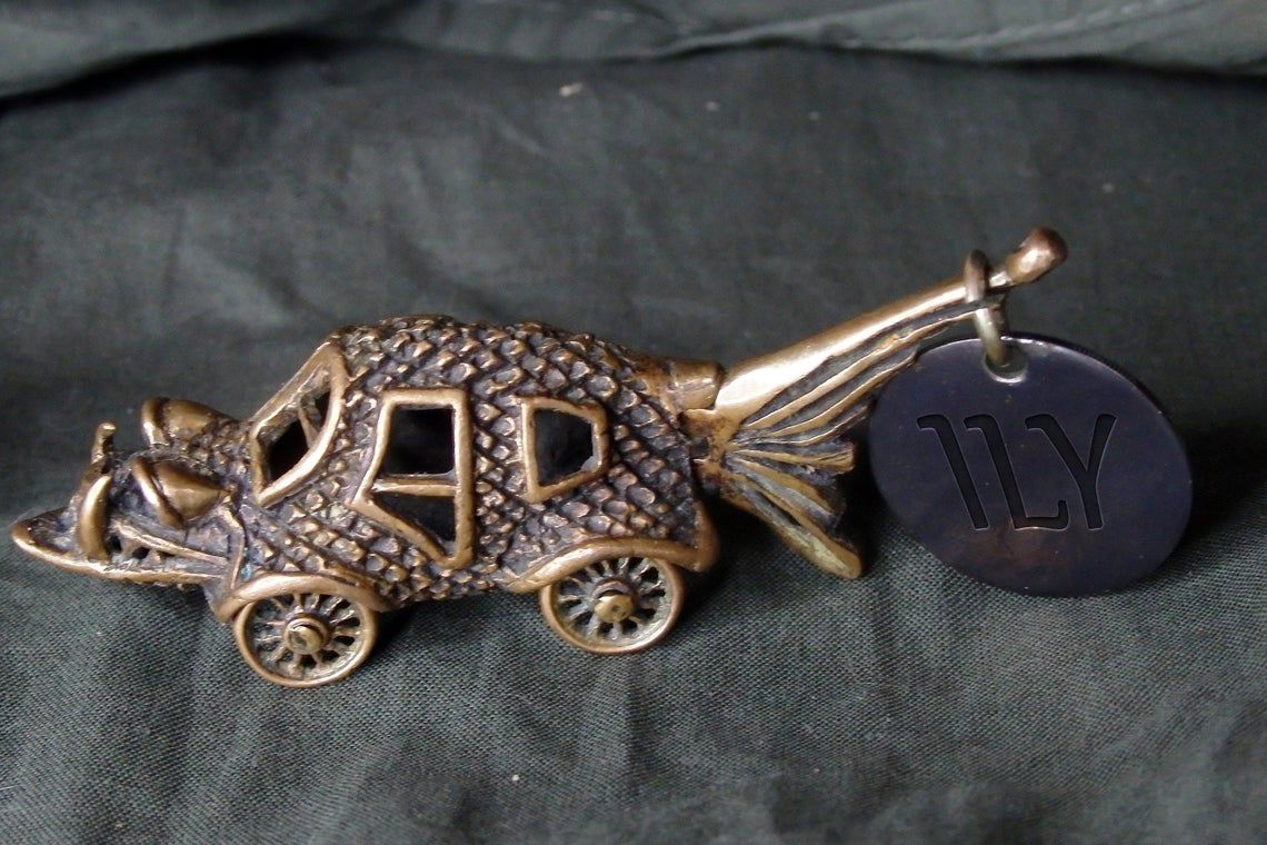 Small bronze souvenir toy. Fish-bus, miniature fish minivan - little funny bronze machine with a predatory fanged snout. The fish has real wheels and a moving fishtail. This toy can be rolled on the table or just admire.