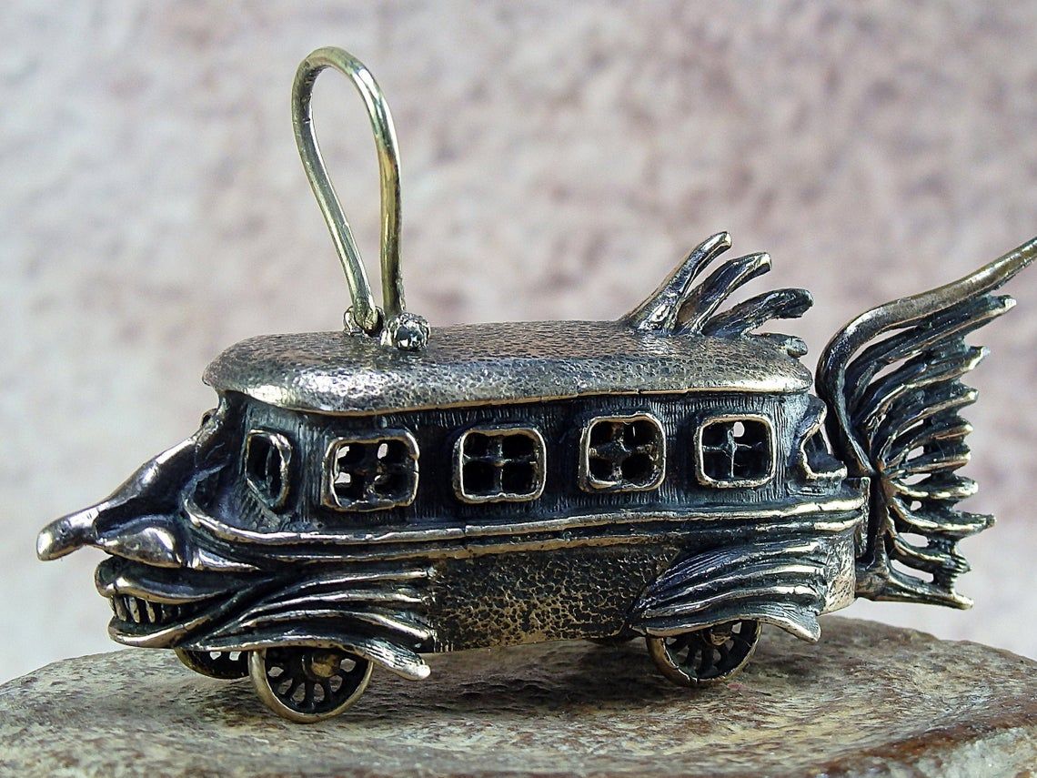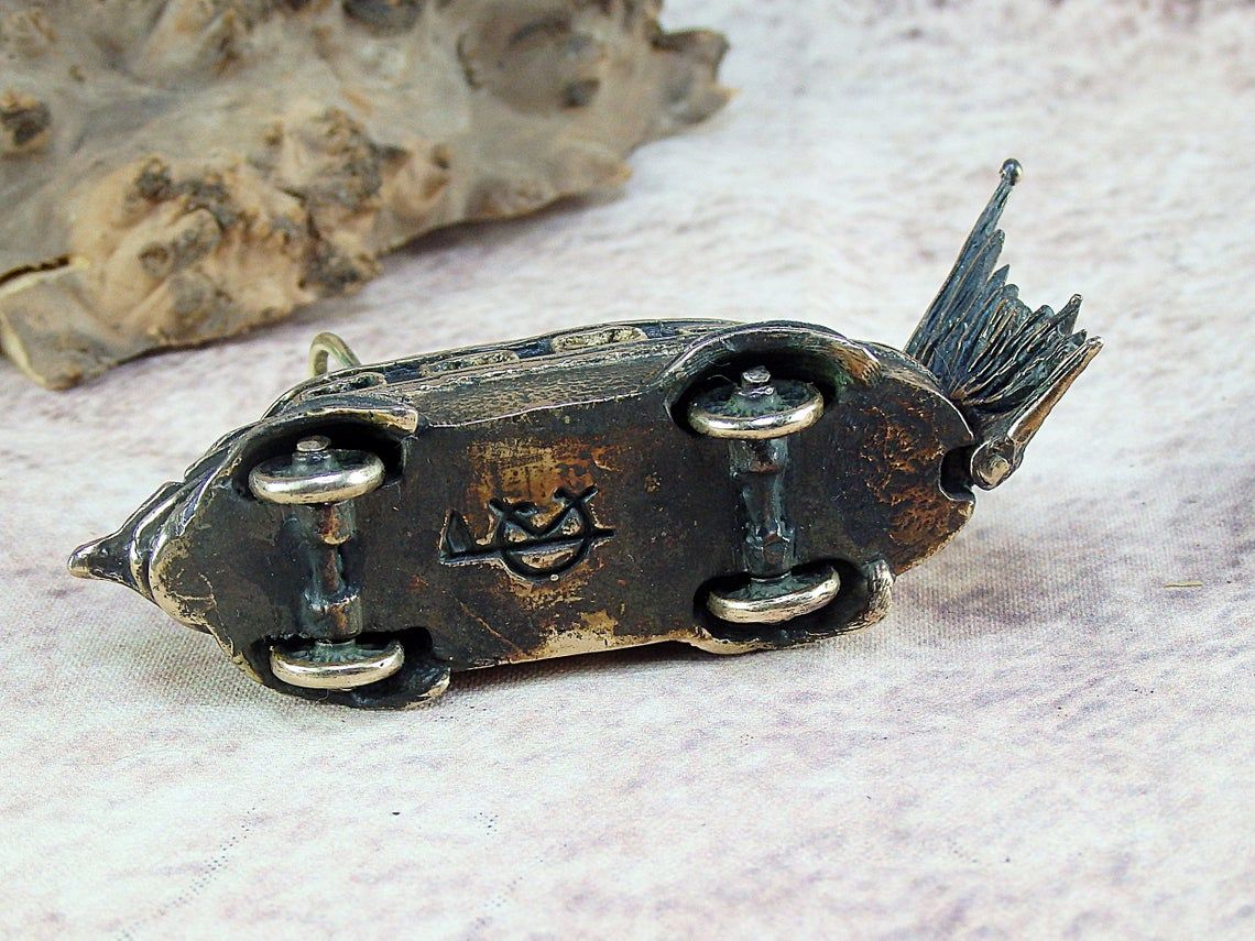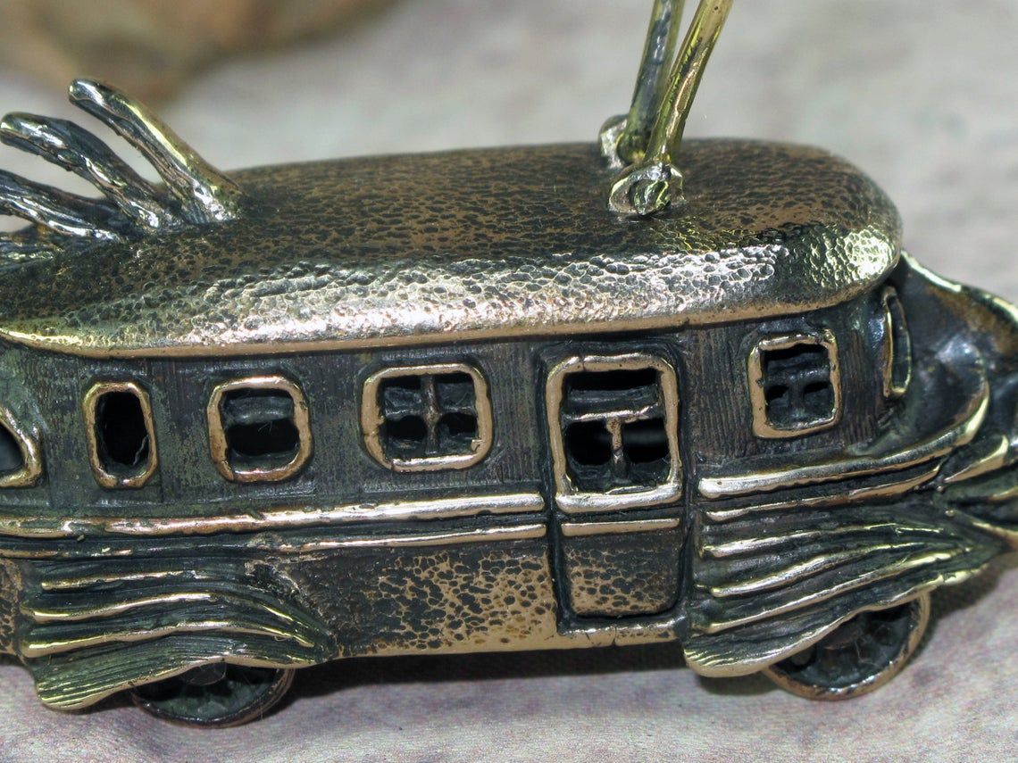 Small bronze souvenir toy. Fish-tram, miniature fish transport - a small fun bronze machine with a sly human face. The tram has real wheels and a moving fishtail. This toy can be rolled on the table or just admire.