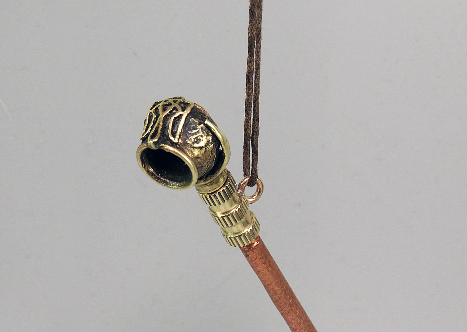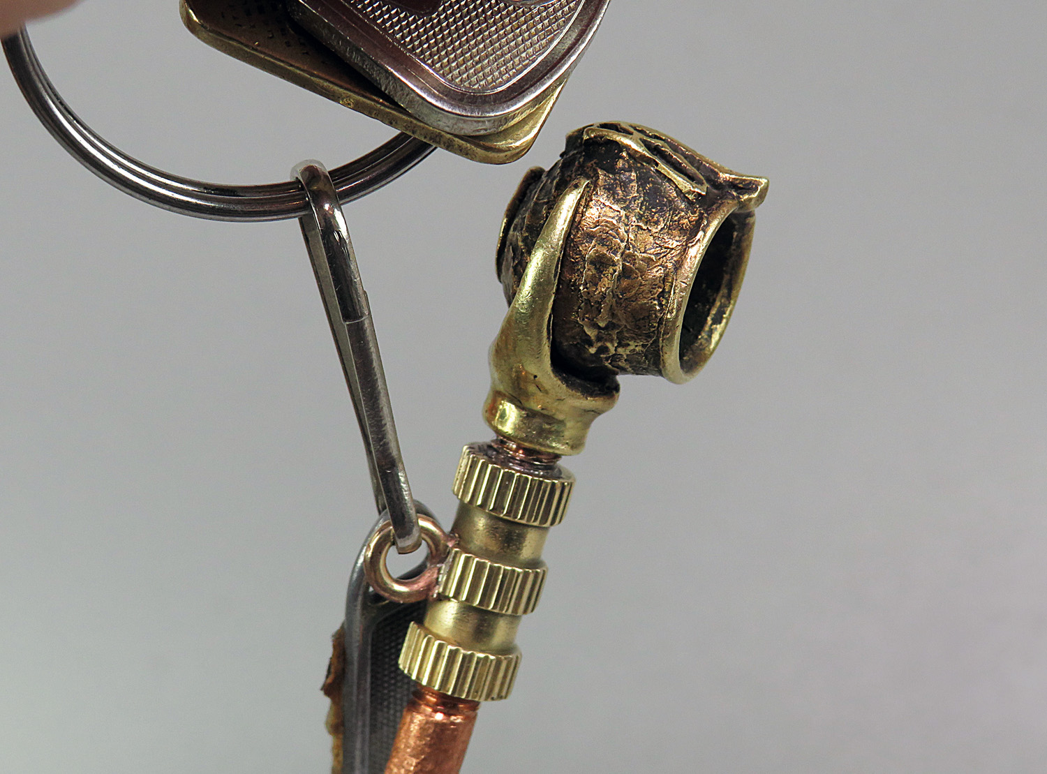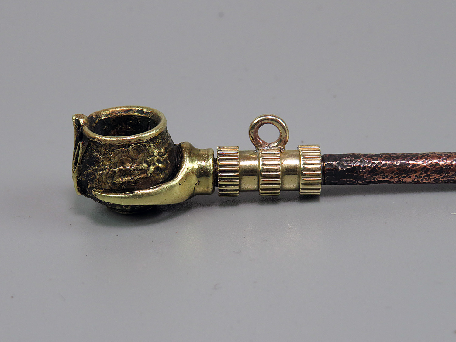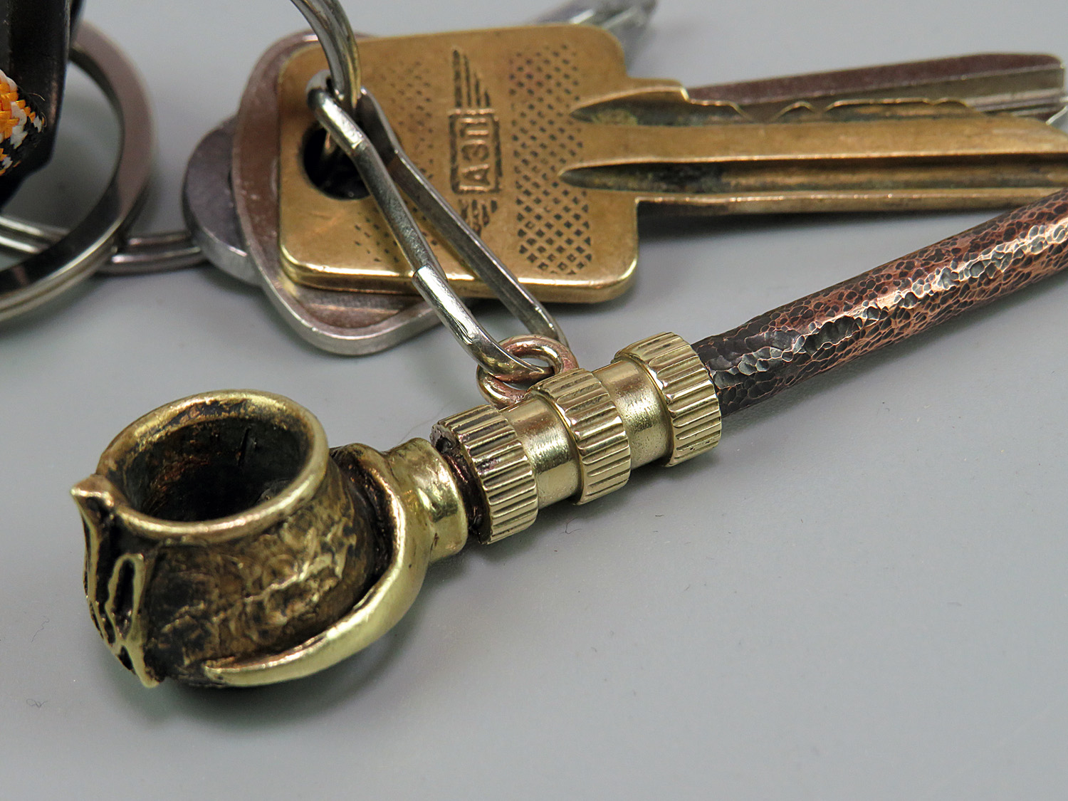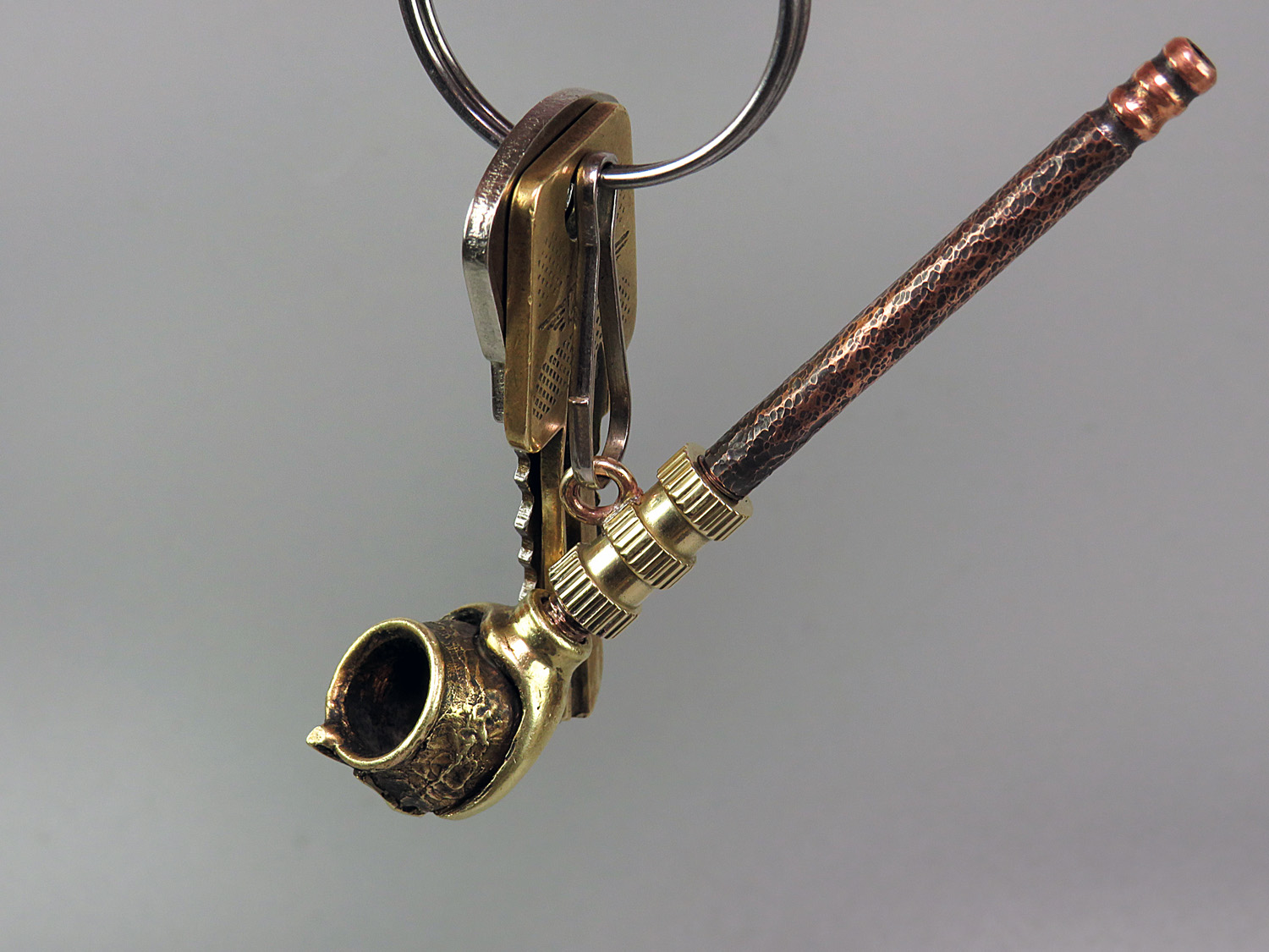 Smoking pipe adapter with ring. With it, the pipe can be suspended on a chain or carabiner. The adapter is threaded on both sides and fits between the pipe and the mouthpiece.