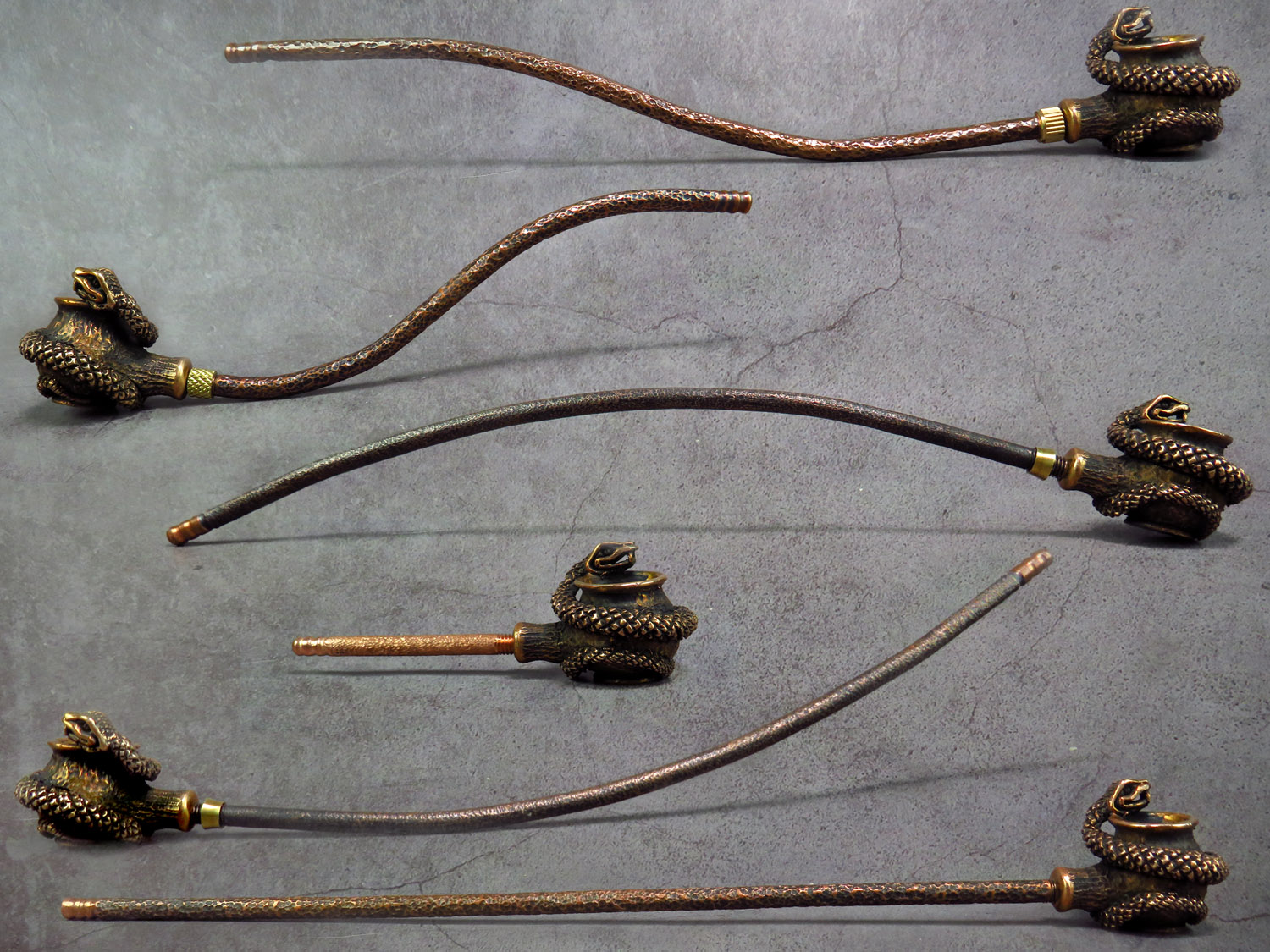 The mouthpiece is made of copper, it is screwed on, can have a length (from 3 to 30 cm) and a shape at the request of the buyer. The pipe is working, not decorative, the model is tested by the master.