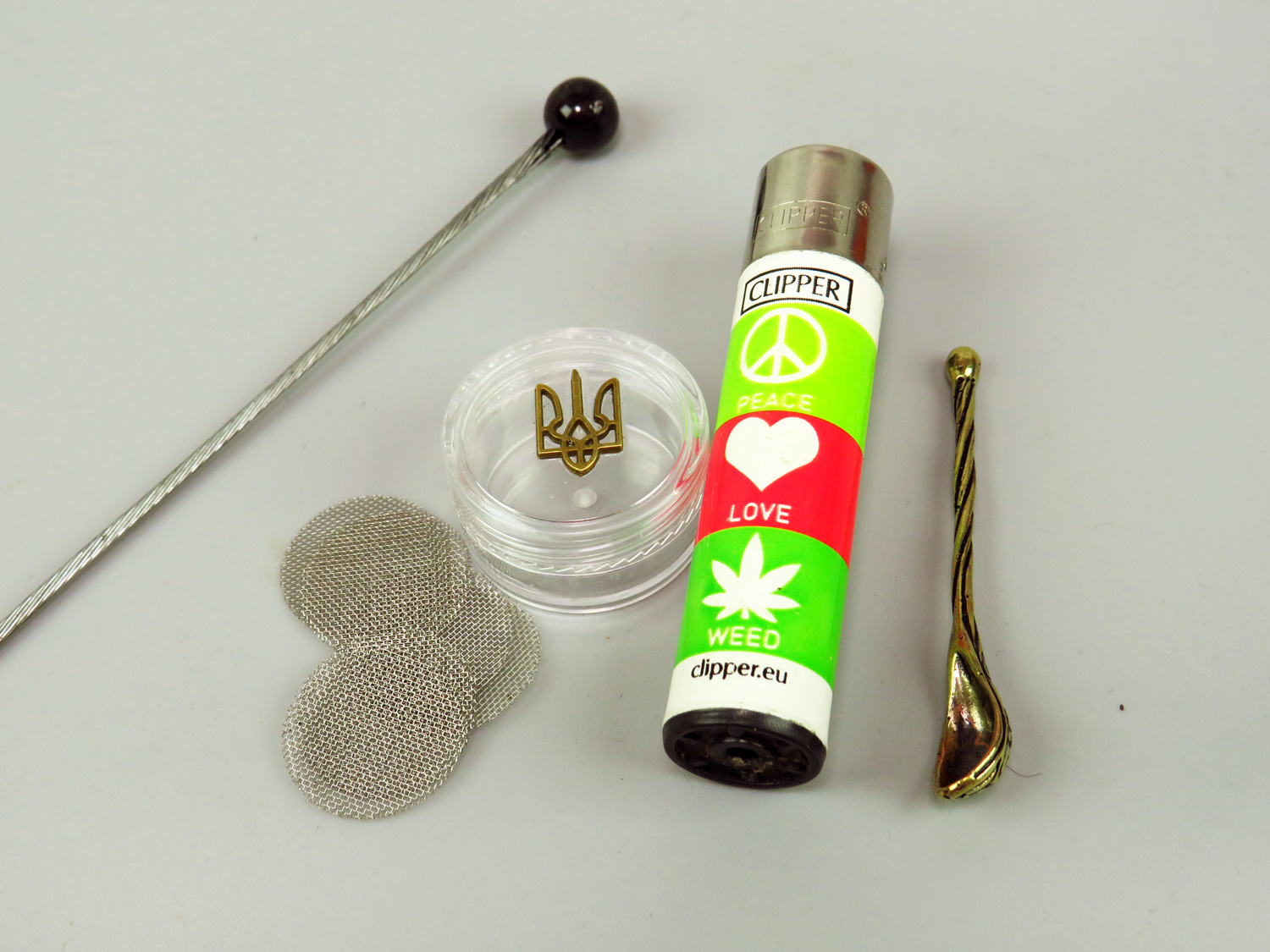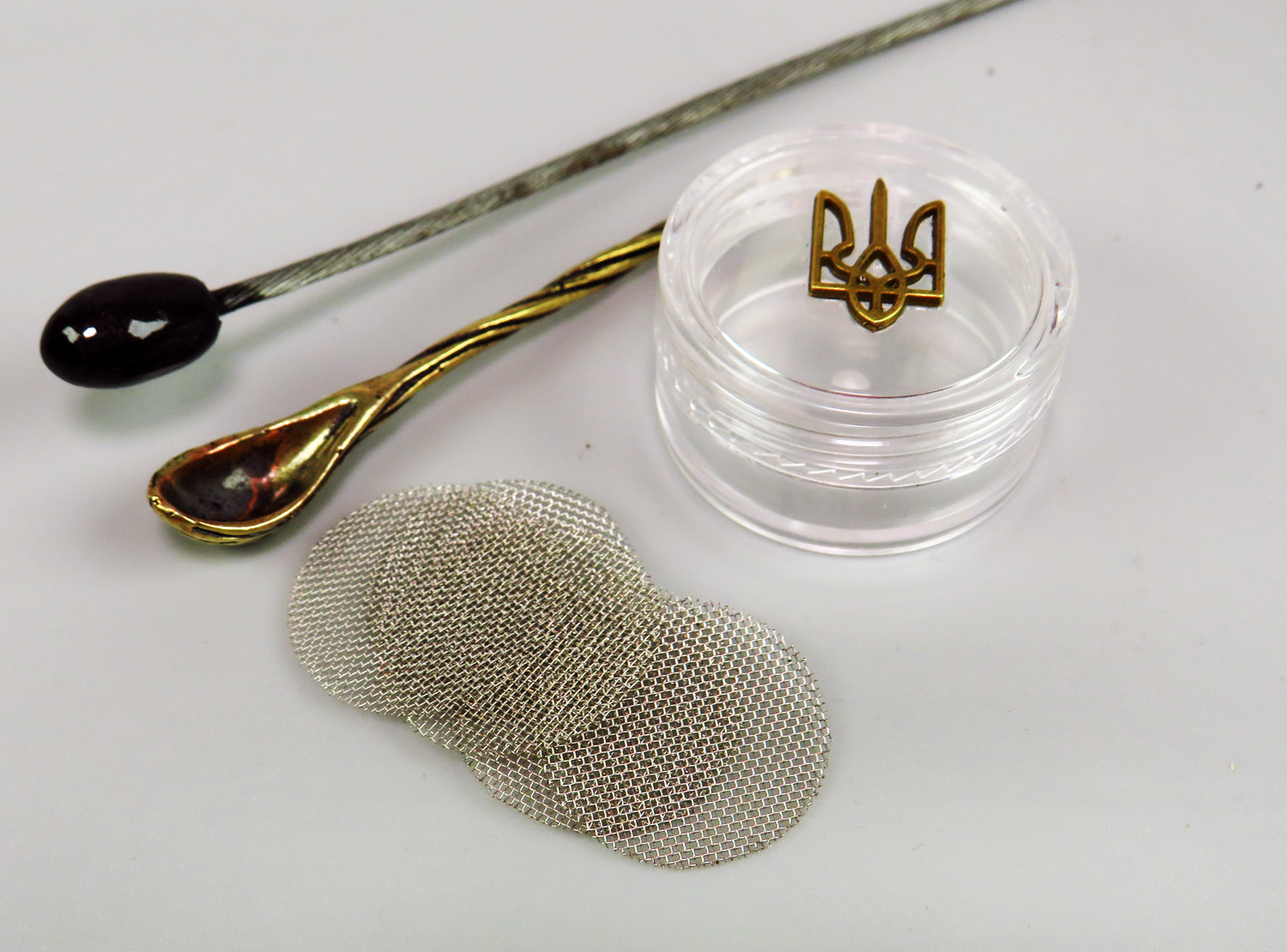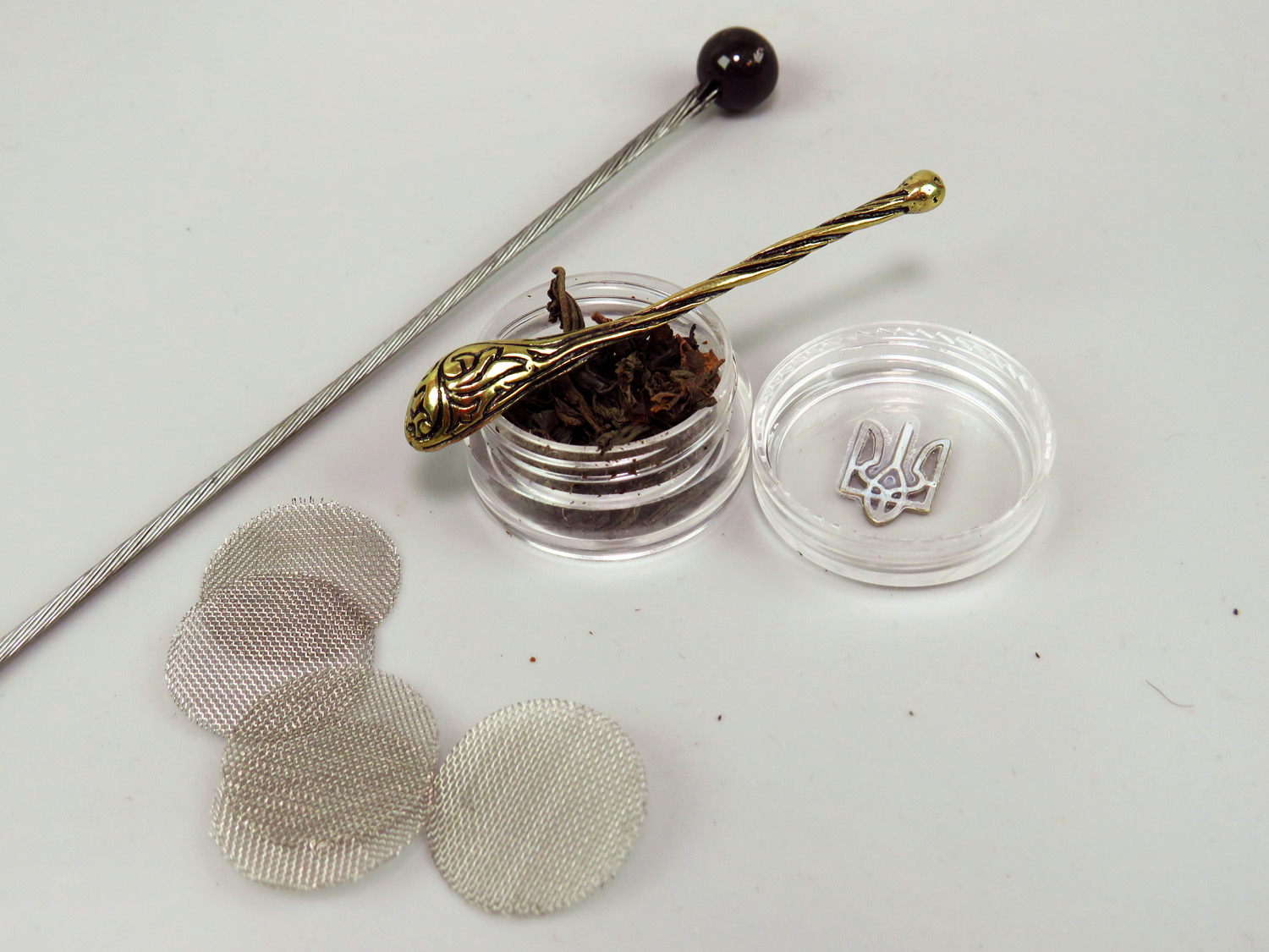 A set of spare pipe accessories consists of a cleaning rod (made of rope and bead), a miniature bronze spoon, 5 nets and a plastic container with the coat of arms of Ukraine.