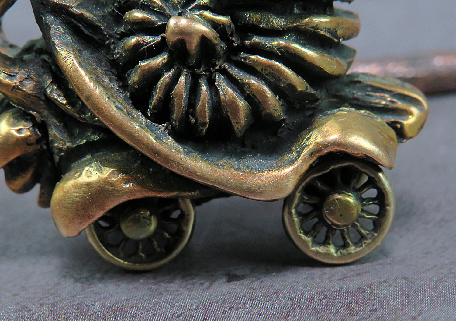 To make this item, a wax model was cut out by hand. Then, using the lost wax method, bronze parts were cast.