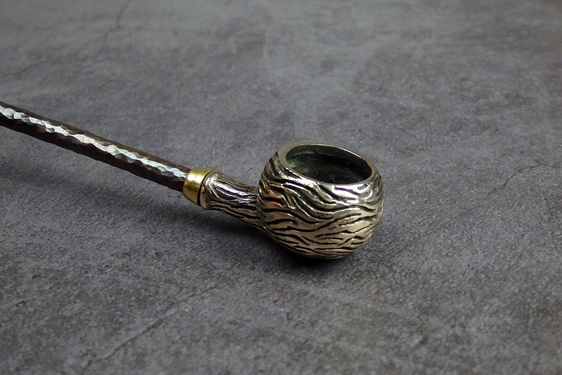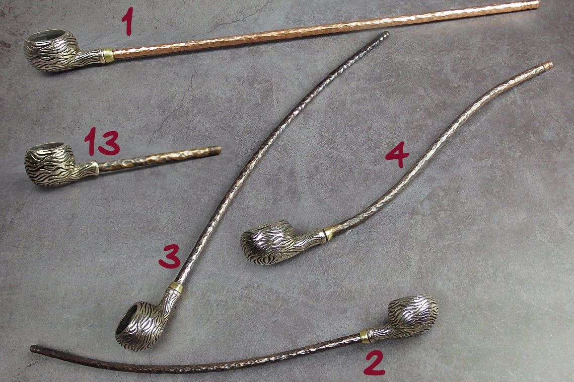 Freehand churchwarden bronze pipe with a round bowl-sphere. The mouthpiece is made of copper, it is screwed on, can have a length (from 5 to 30 cm) and a shape at the request of the buyer. The pipe is working, not decorative, the model is tested by the master.