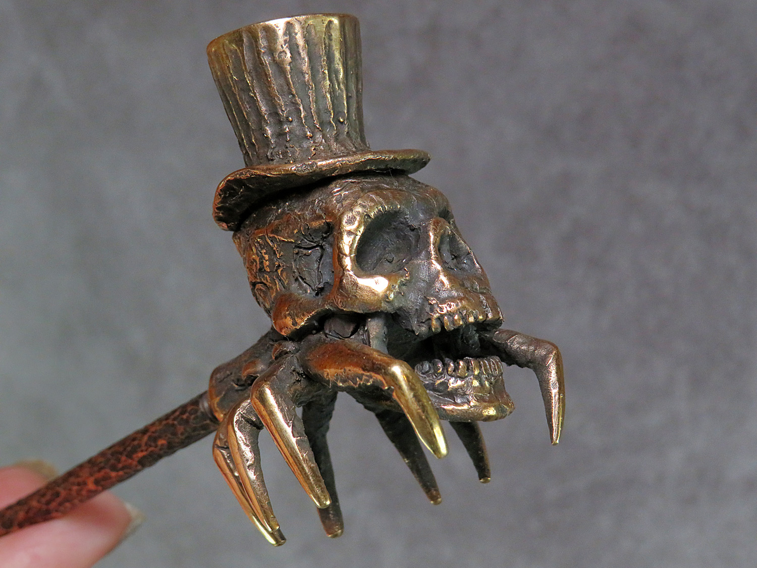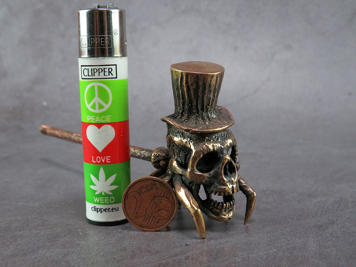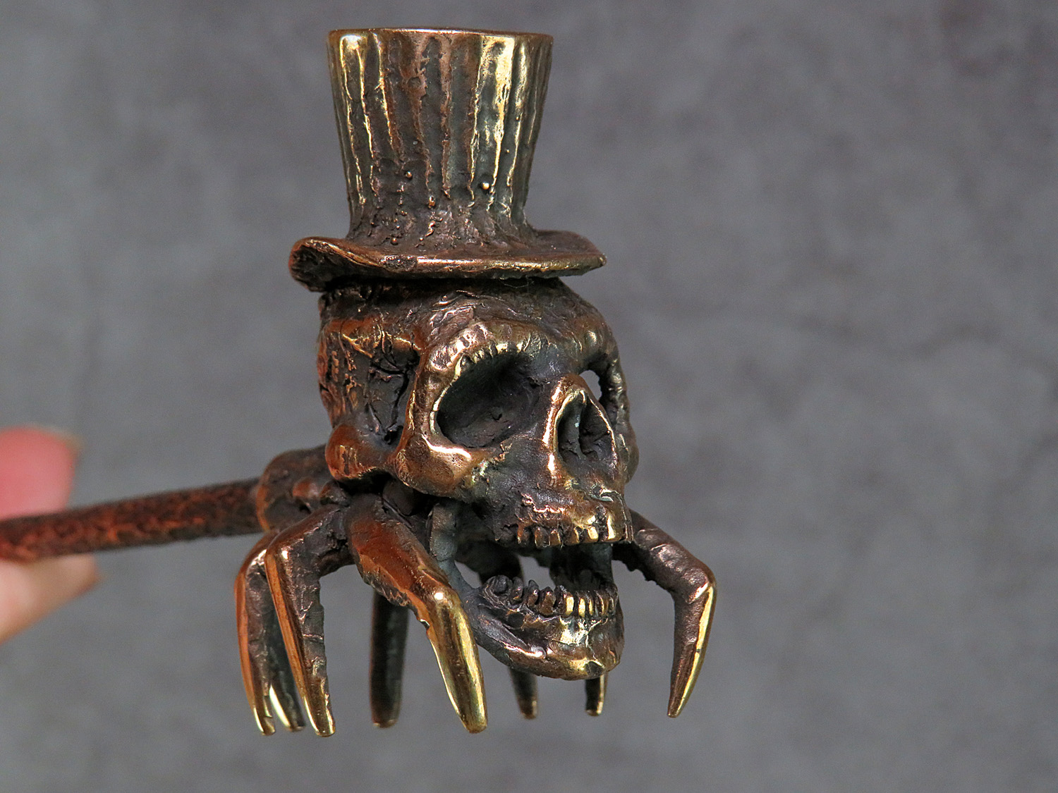 Bronze smoking pipe with a bowl in the shape surrealistic skull on spider legs. The skull has an opening hat-lid and a movable lower jaw, so this is not only a smoking accessory, but also a wonderful souvenir. The mouthpiece is made of copper, it is screwed on, can have a length (from 3 to 30 cm) and a shape at the request of the buyer. The pipe is working, not decorative, the model is tested by the master.