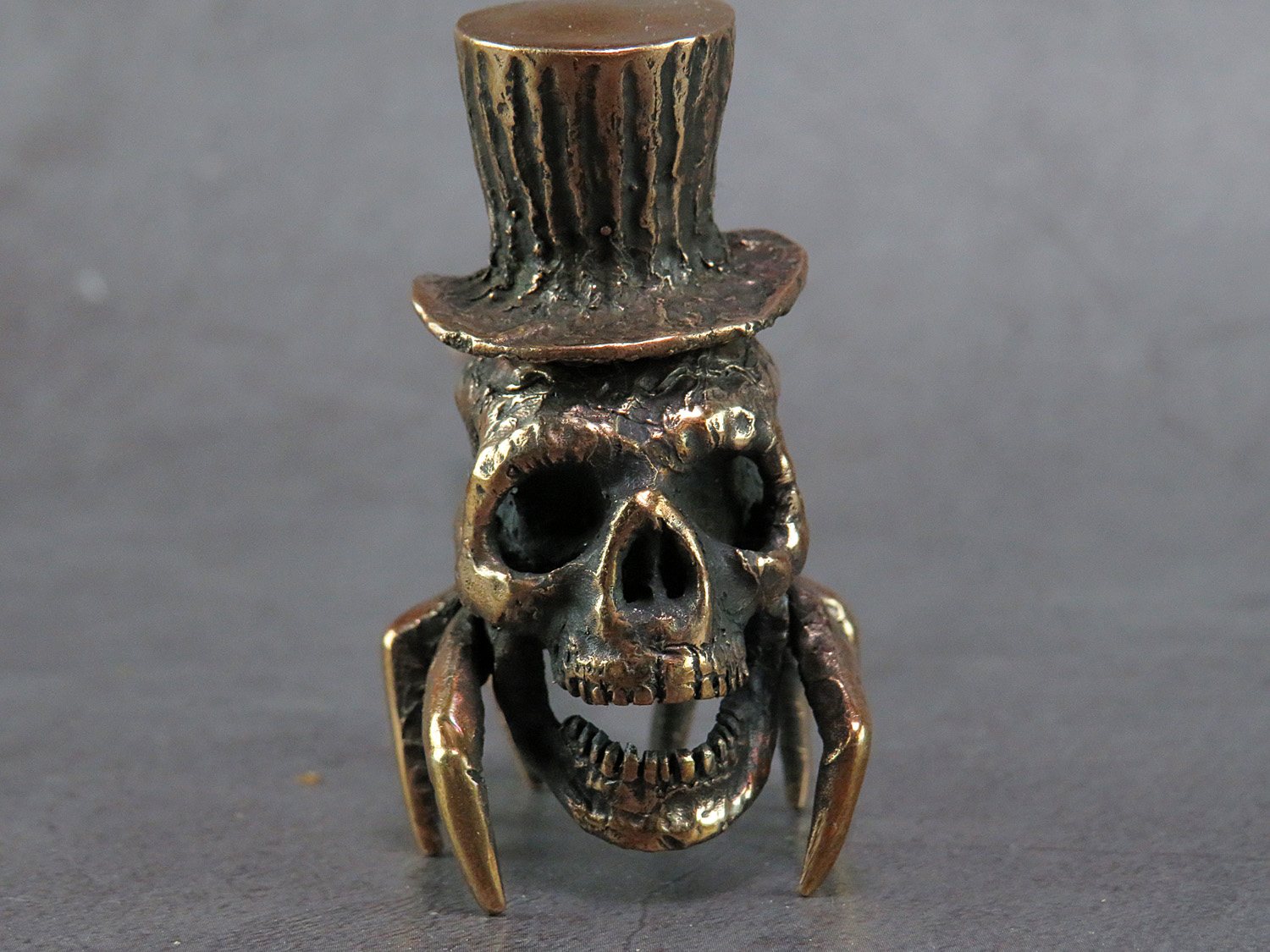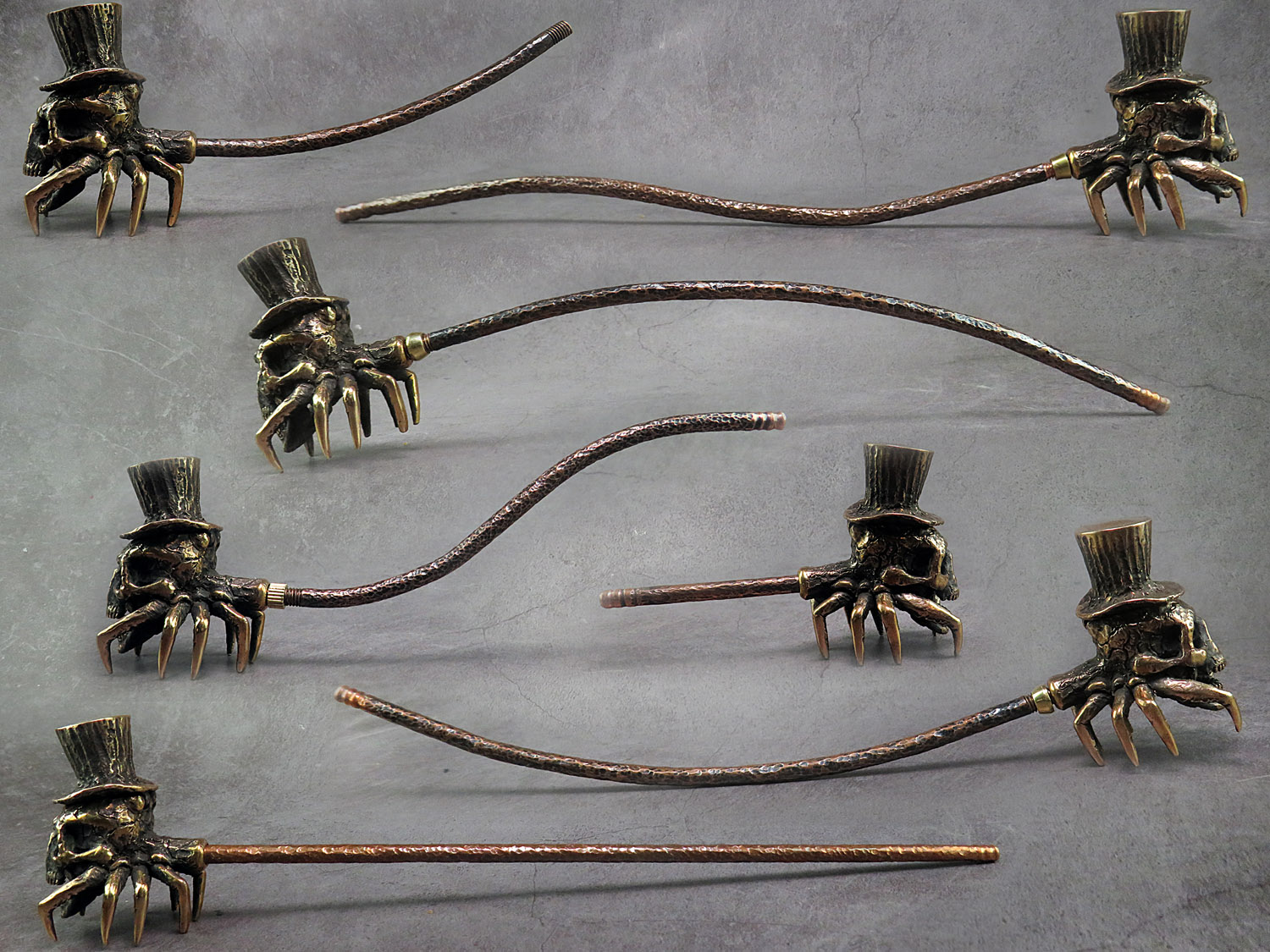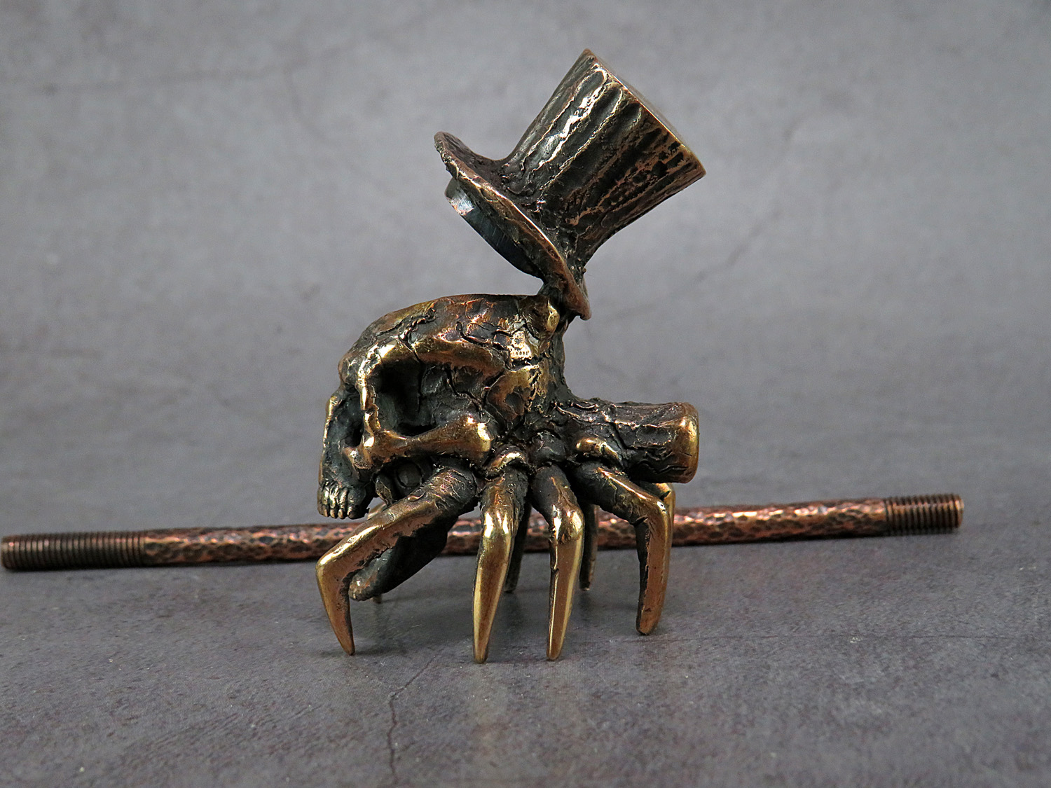 Bronze smoking pipe with a bowl in the shape surrealistic skull on spider legs. The skull has an opening hat-lid and a movable lower jaw, so this is not only a smoking accessory, but also a wonderful souvenir. The mouthpiece is made of copper, it is screwed on, can have a length (from 3 to 30 cm) and a shape at the request of the buyer. The pipe is working, not decorative, the model is tested by the master.