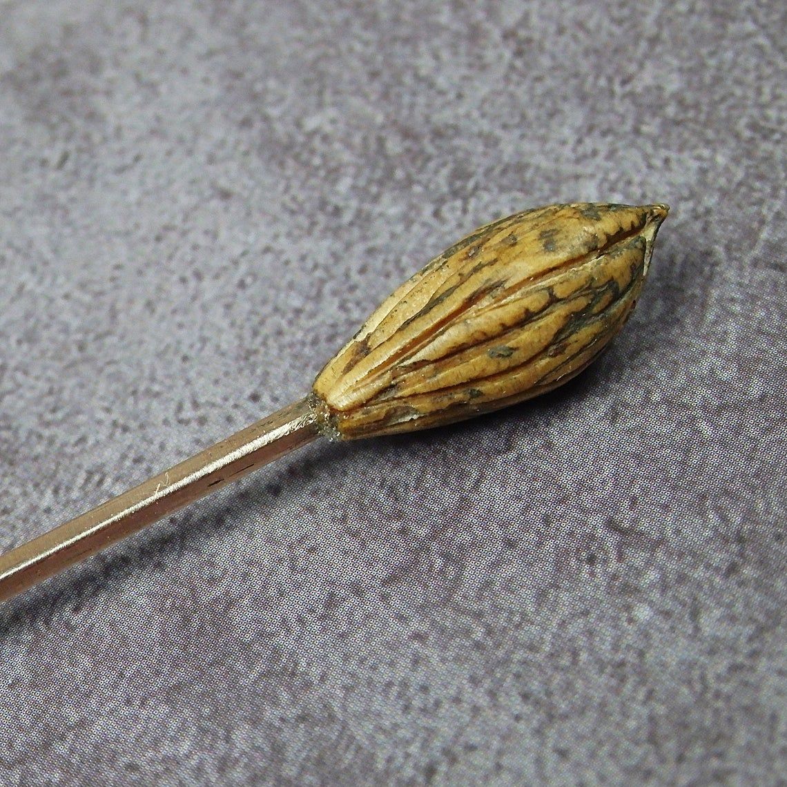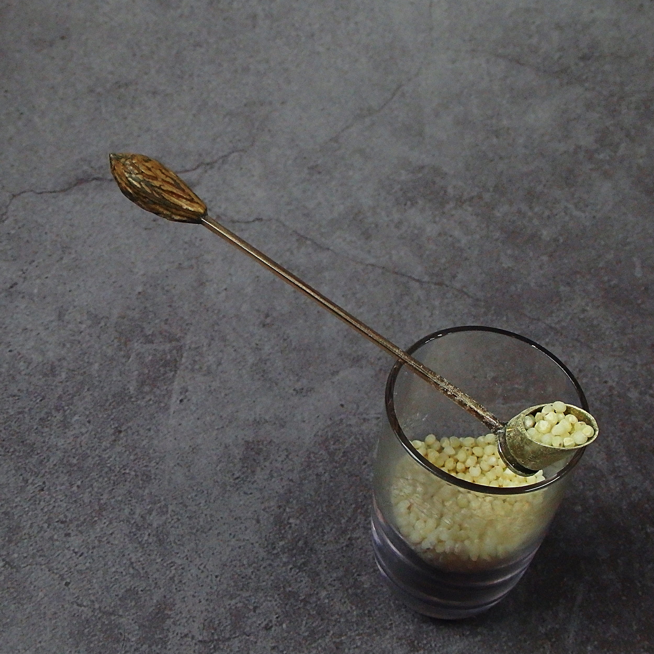 An original small souvenir spoon made from a cartridge case (from a luger) brass rod and an olive pit.