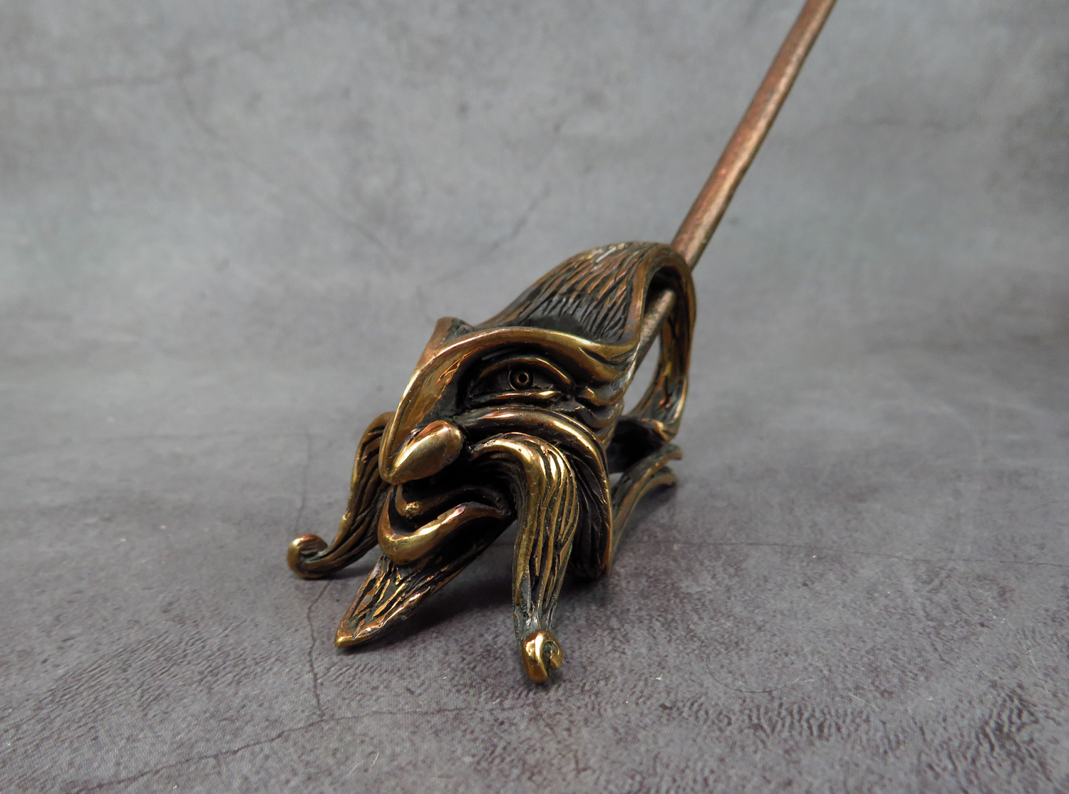 To make this item, a wax model was cut out by hand. Then, using the lost wax method, bronze parts were cast.