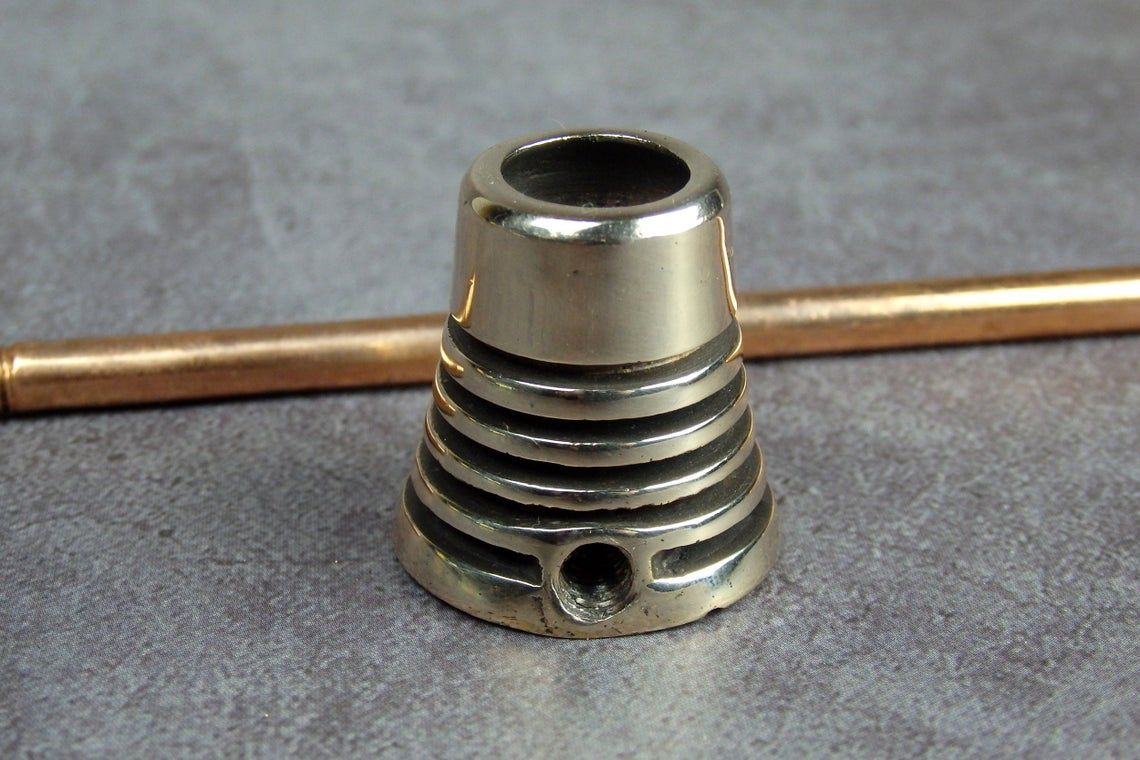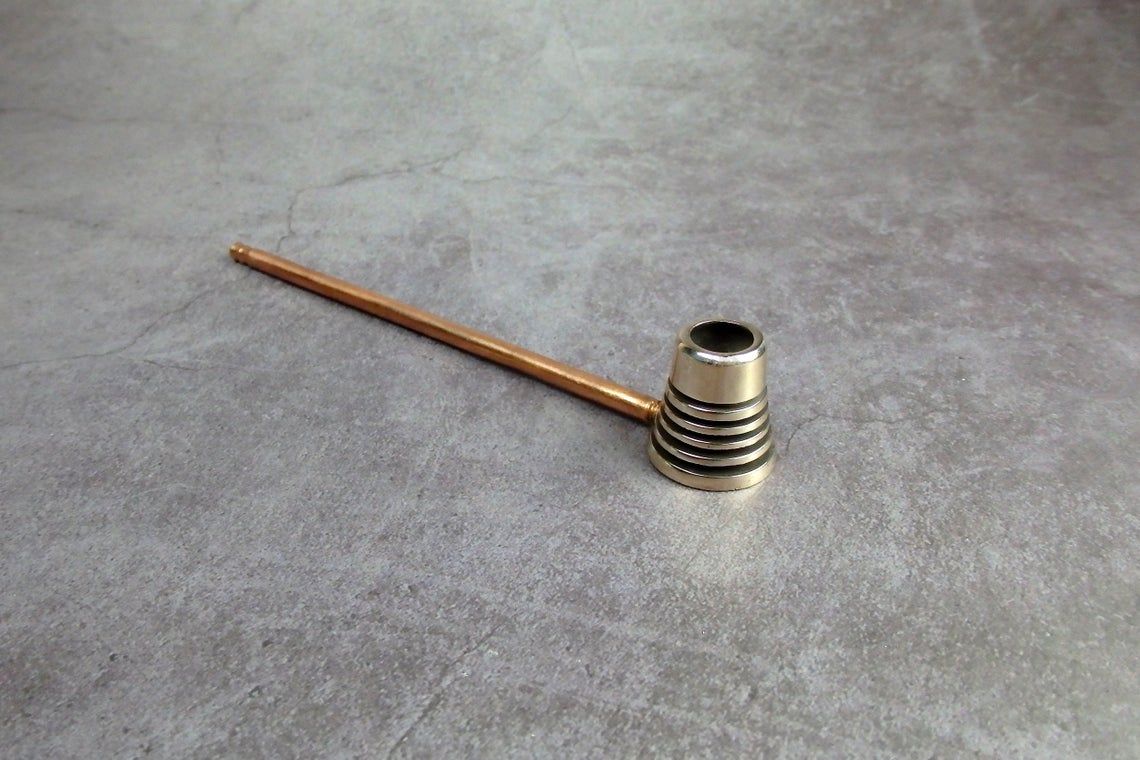 Bowl of pipe made of polished bronze, mouthpiece made of copper, it is screwed on, can have a length (from 3 to 30 cm) and a shape at the request of the buyer. The pipe is working, not decorative, the model is tested by the master.