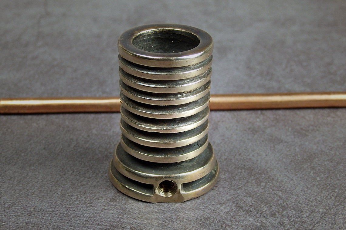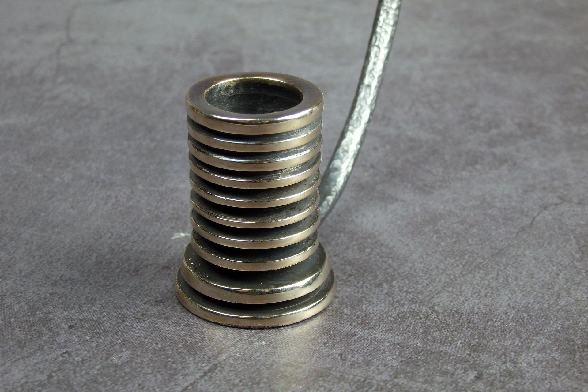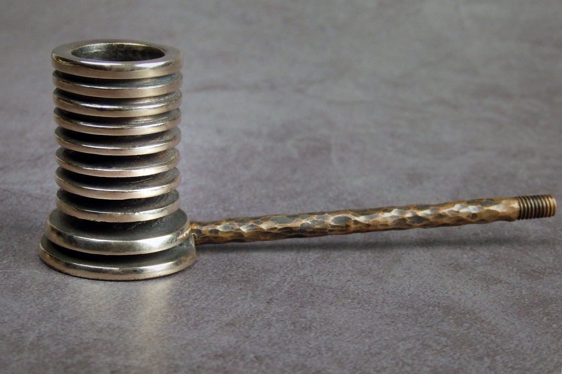 Bowl of pipe made of polished bronze, mouthpiece made of copper, it is screwed on, can have a length (from 3 to 30 cm) and a shape at the request of the buyer. The pipe is working, not decorative, the model is tested by the master.