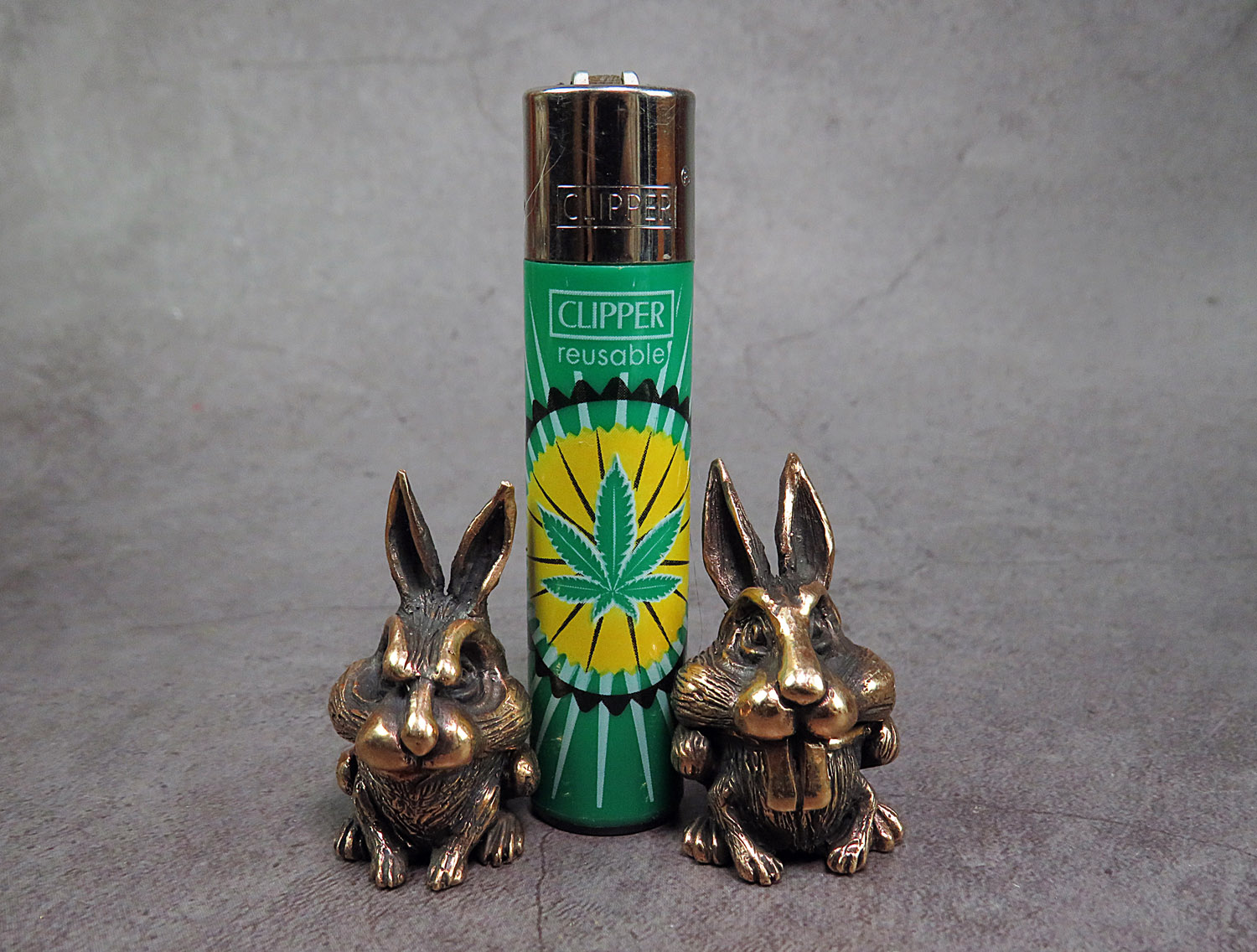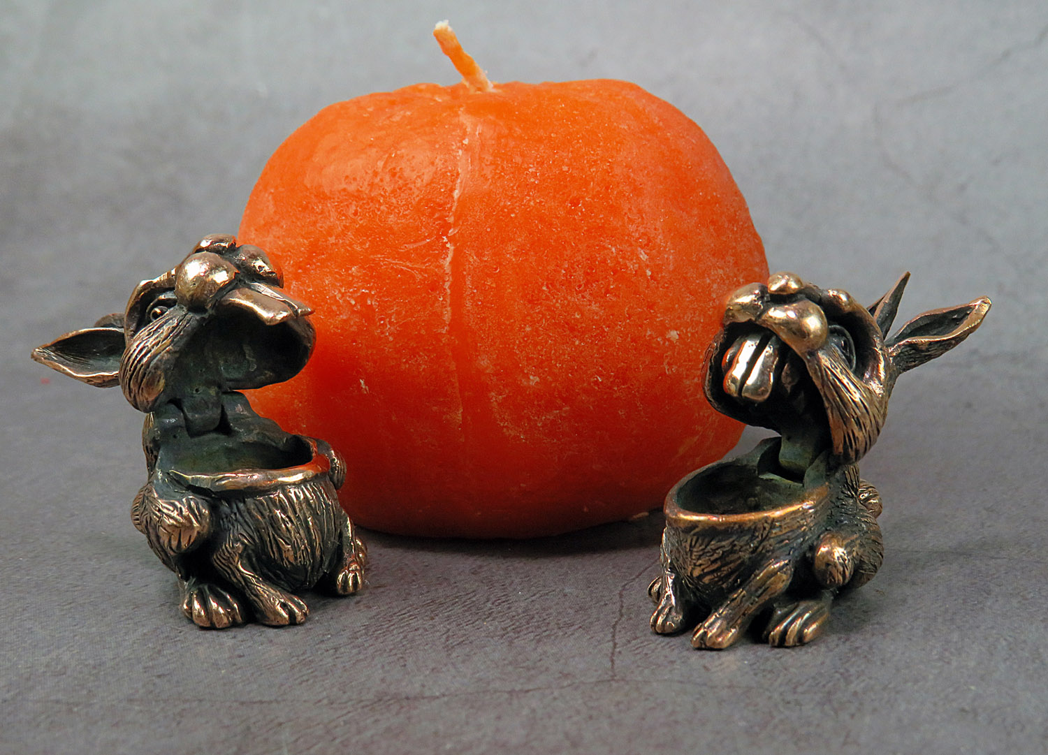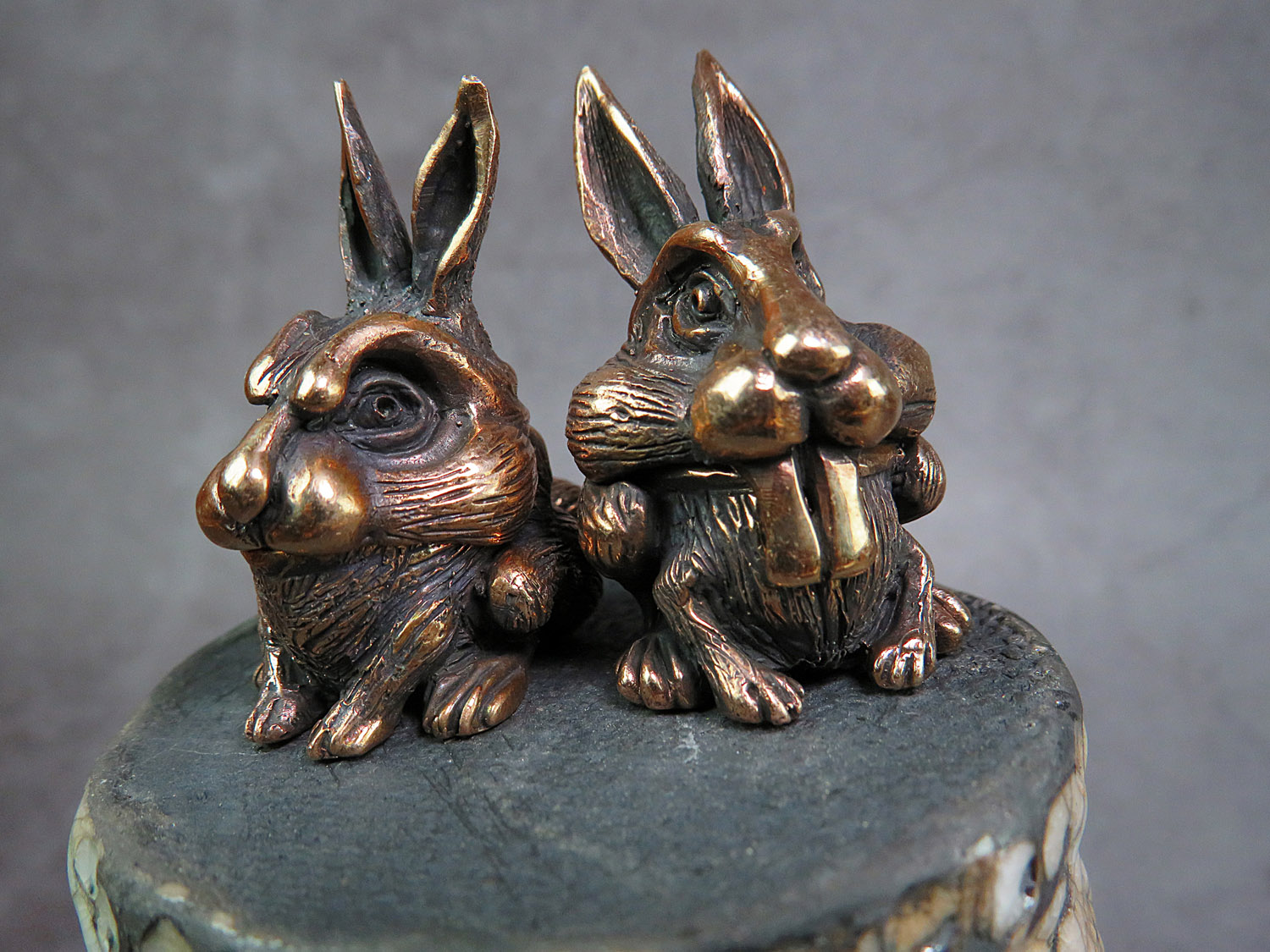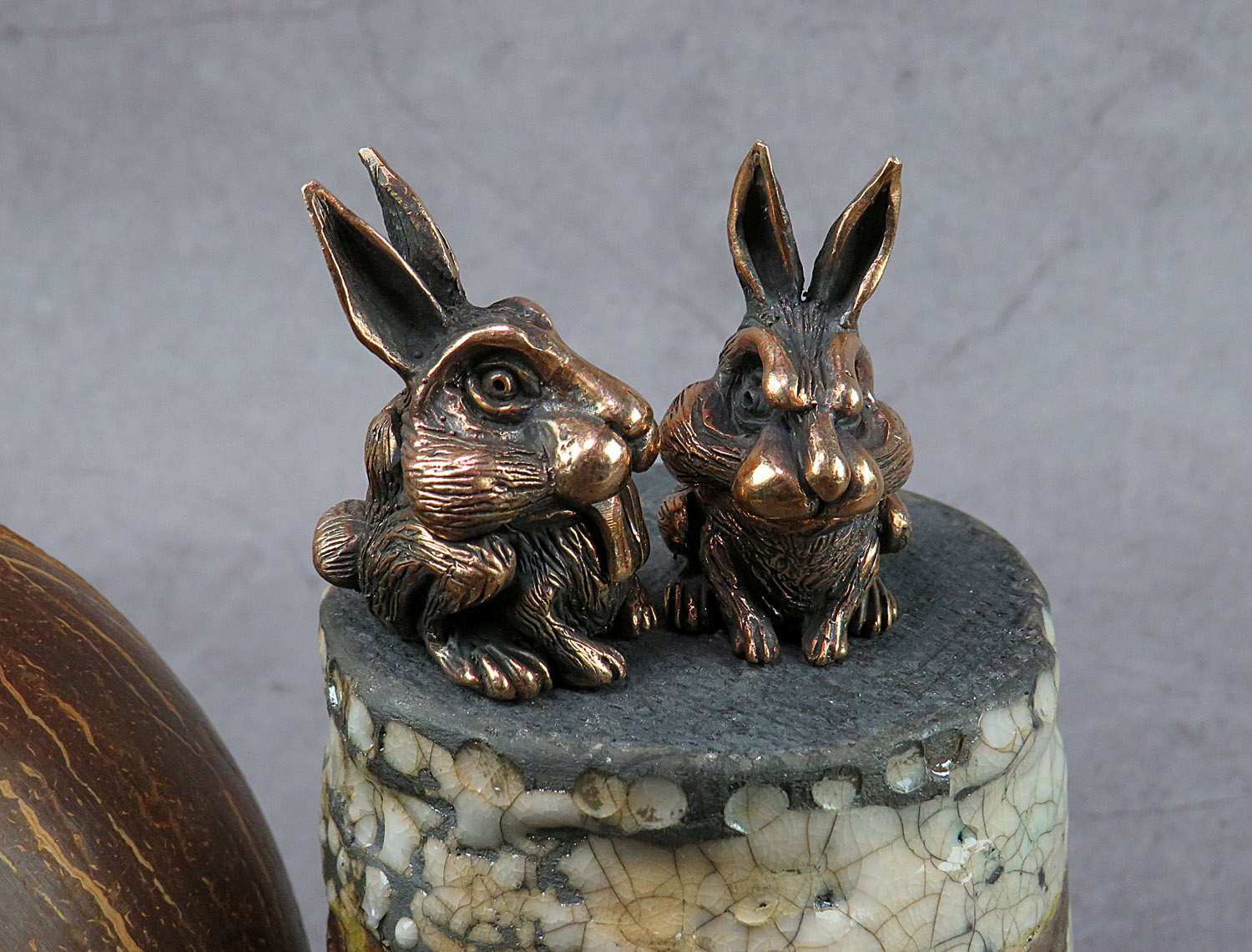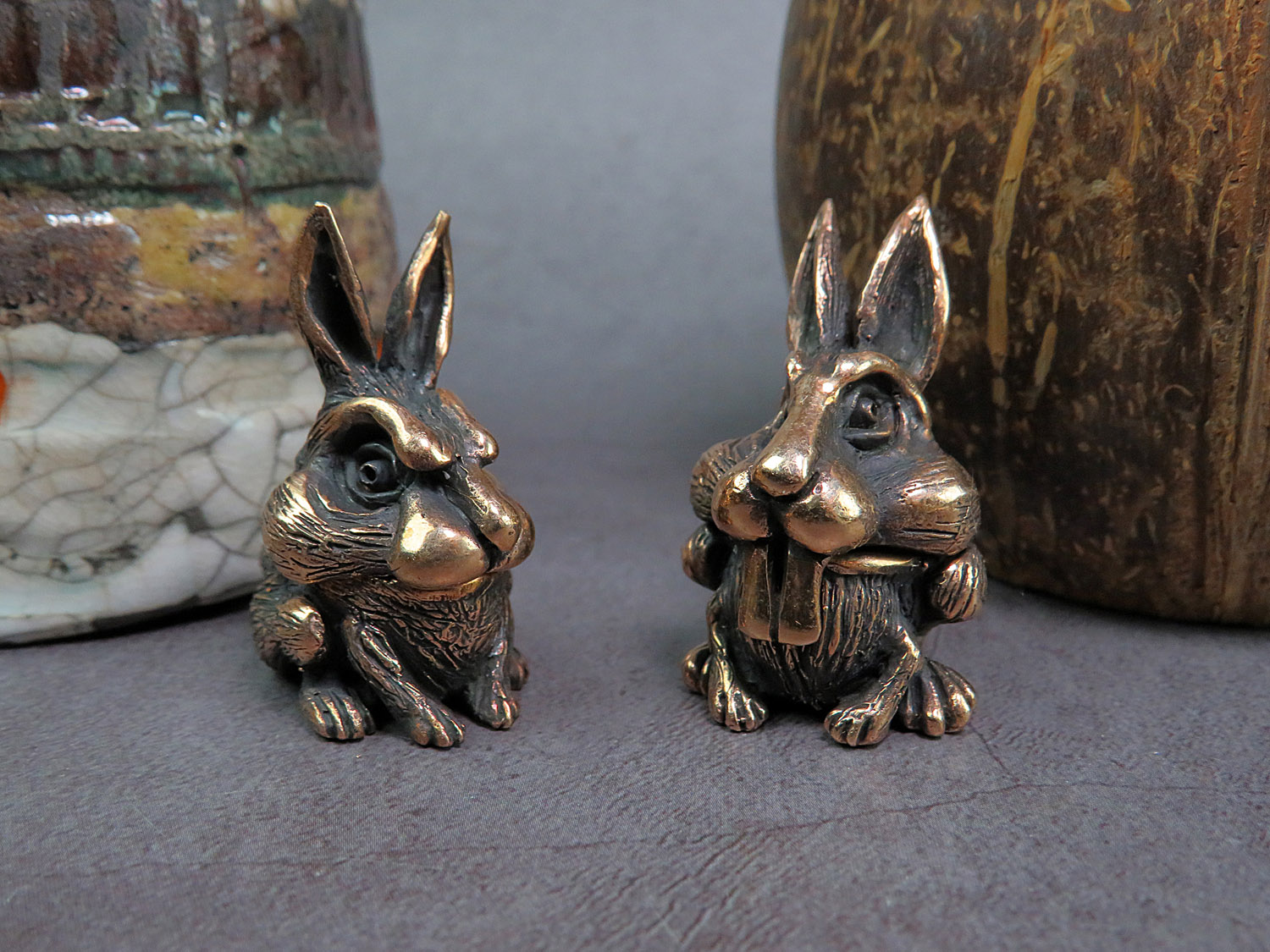 Funny little bronze rabbits, symbols of this year according to the Chinese lunar calendar. These figurines can be used as tabletop souvenirs, tiny candlesticks, miniature boxes, or fun feng shui miniatures that bring good luck.