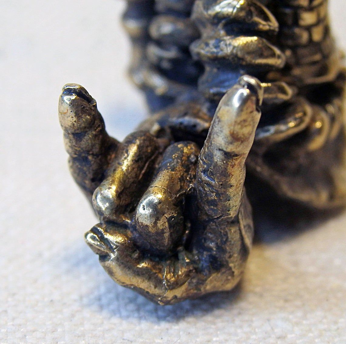 Fairy Rock-Snail, bronze snail with sign of the horns, "that rocks" gesture