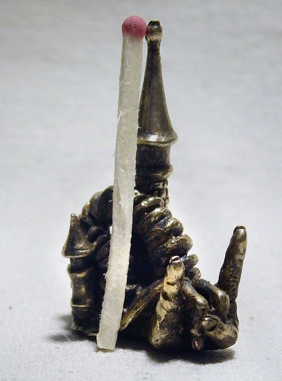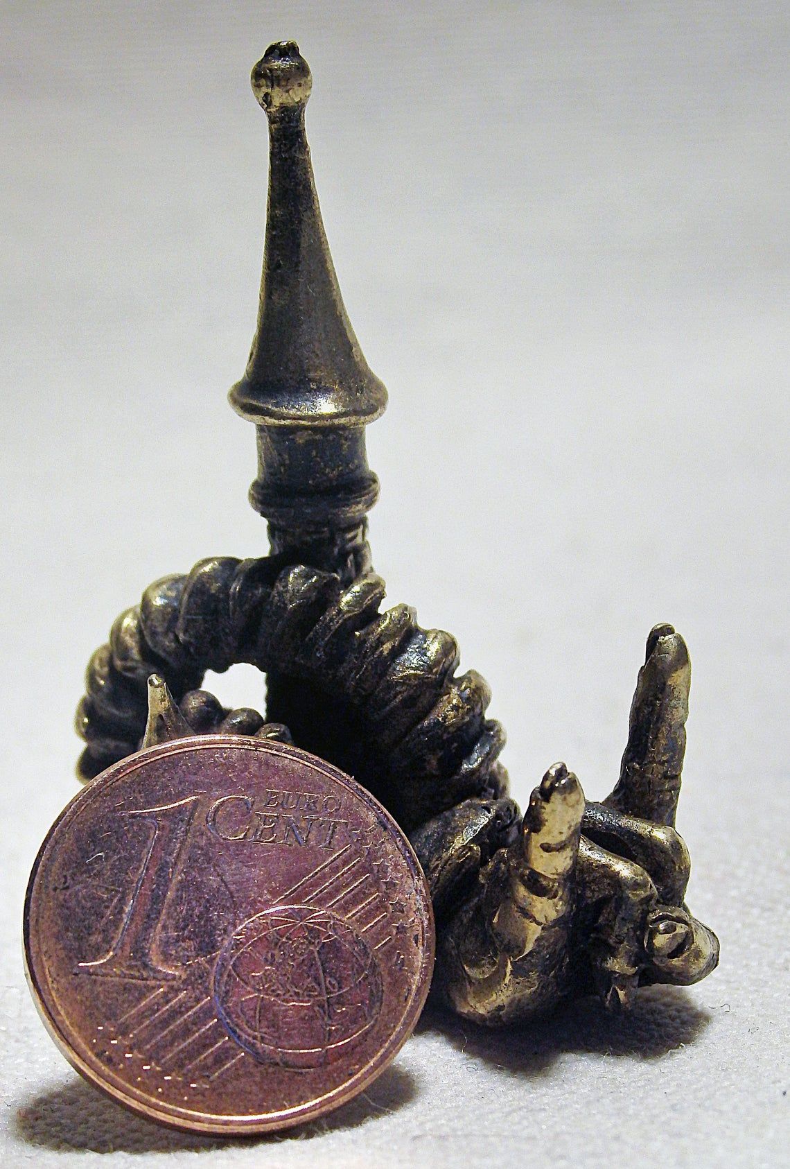 A miniature figurine of bronze. Another snail from the rock-family with horns in the form of a rock-gesture "Goat" and with graceful fairy turrets on the back.
