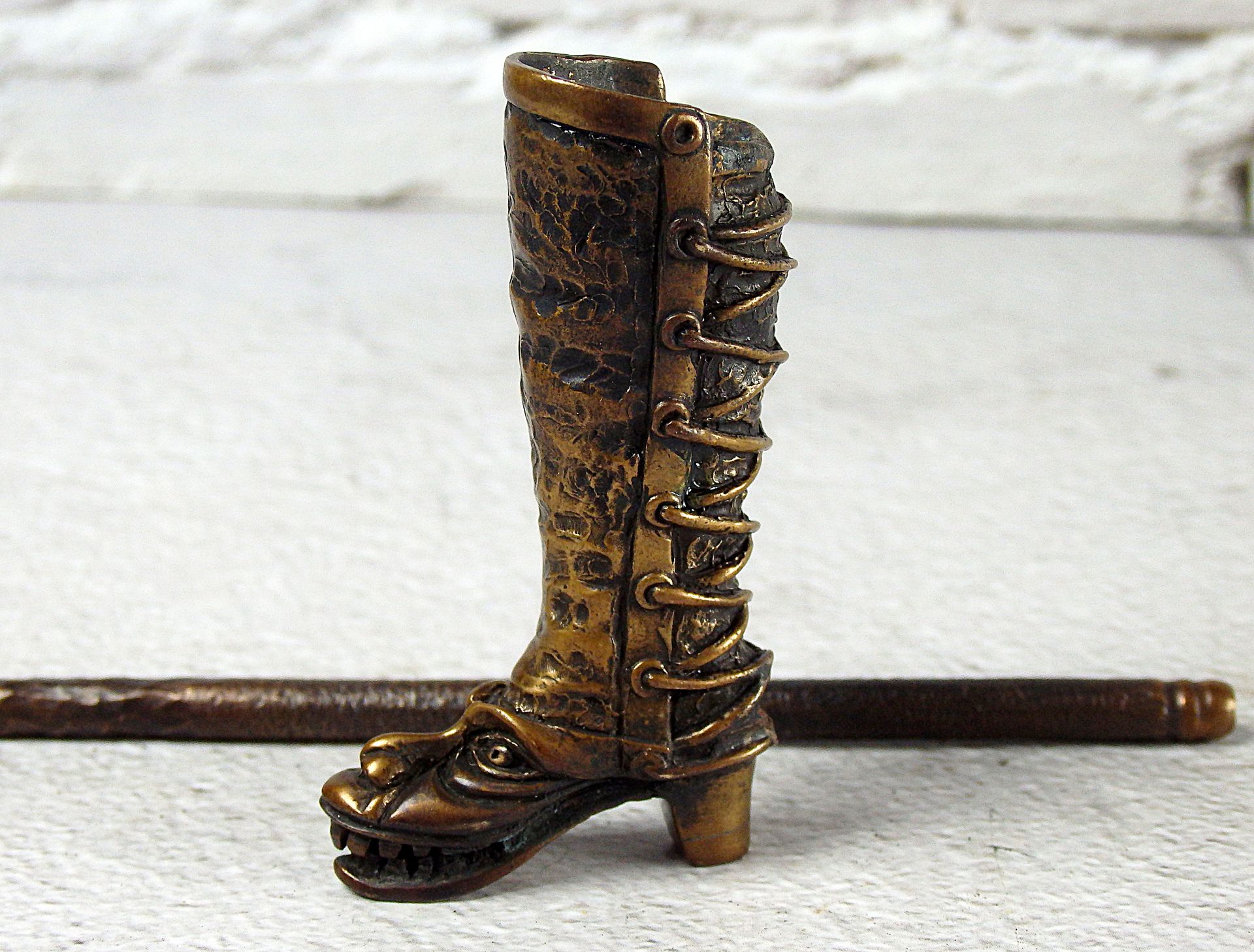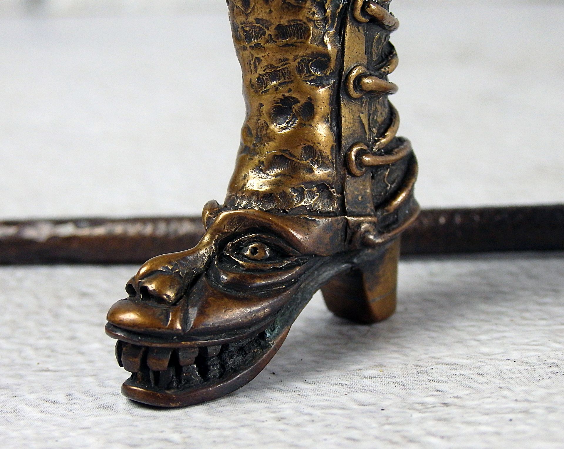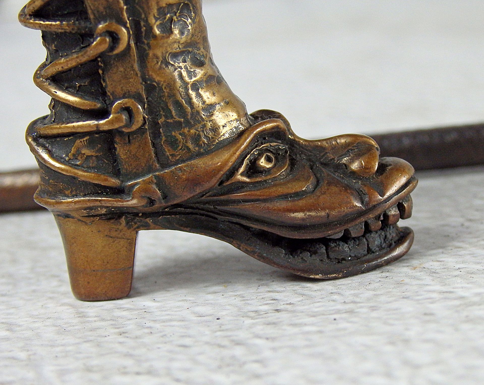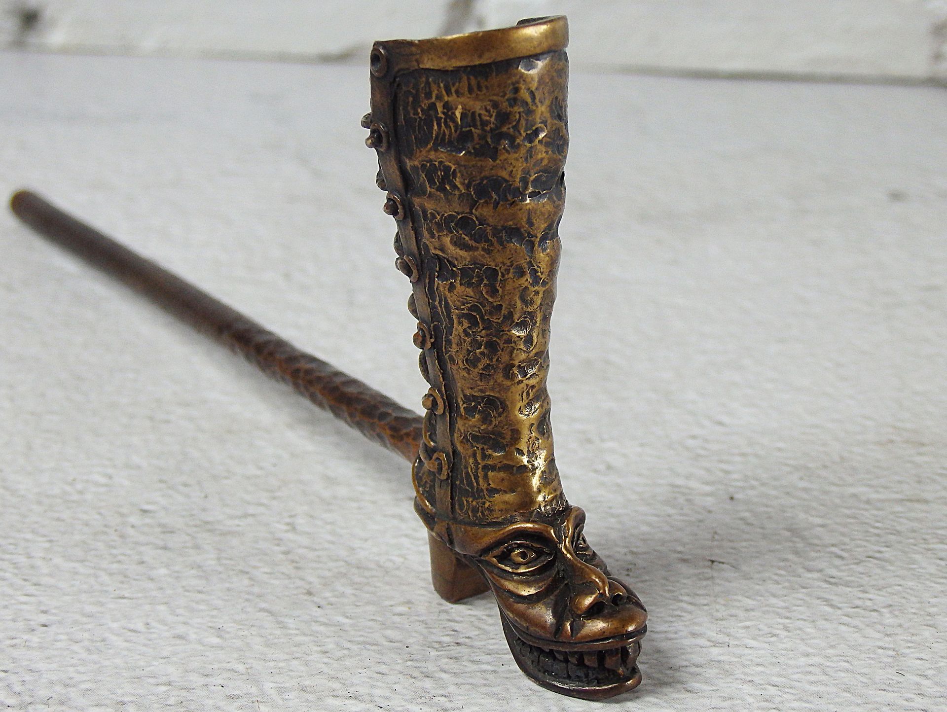 The original bronze smoking pipe in the shape of a boot with teeth. Please note - only part of the boot is used under the bowl.