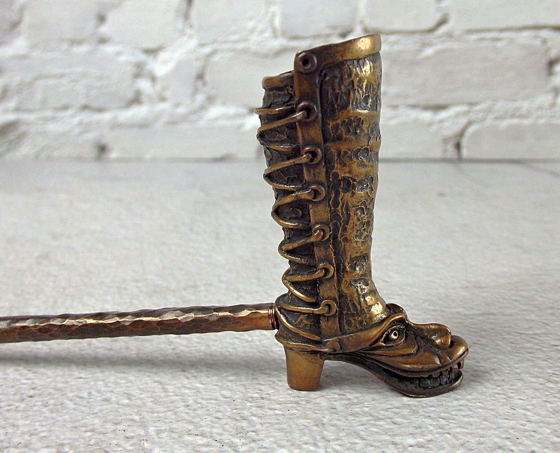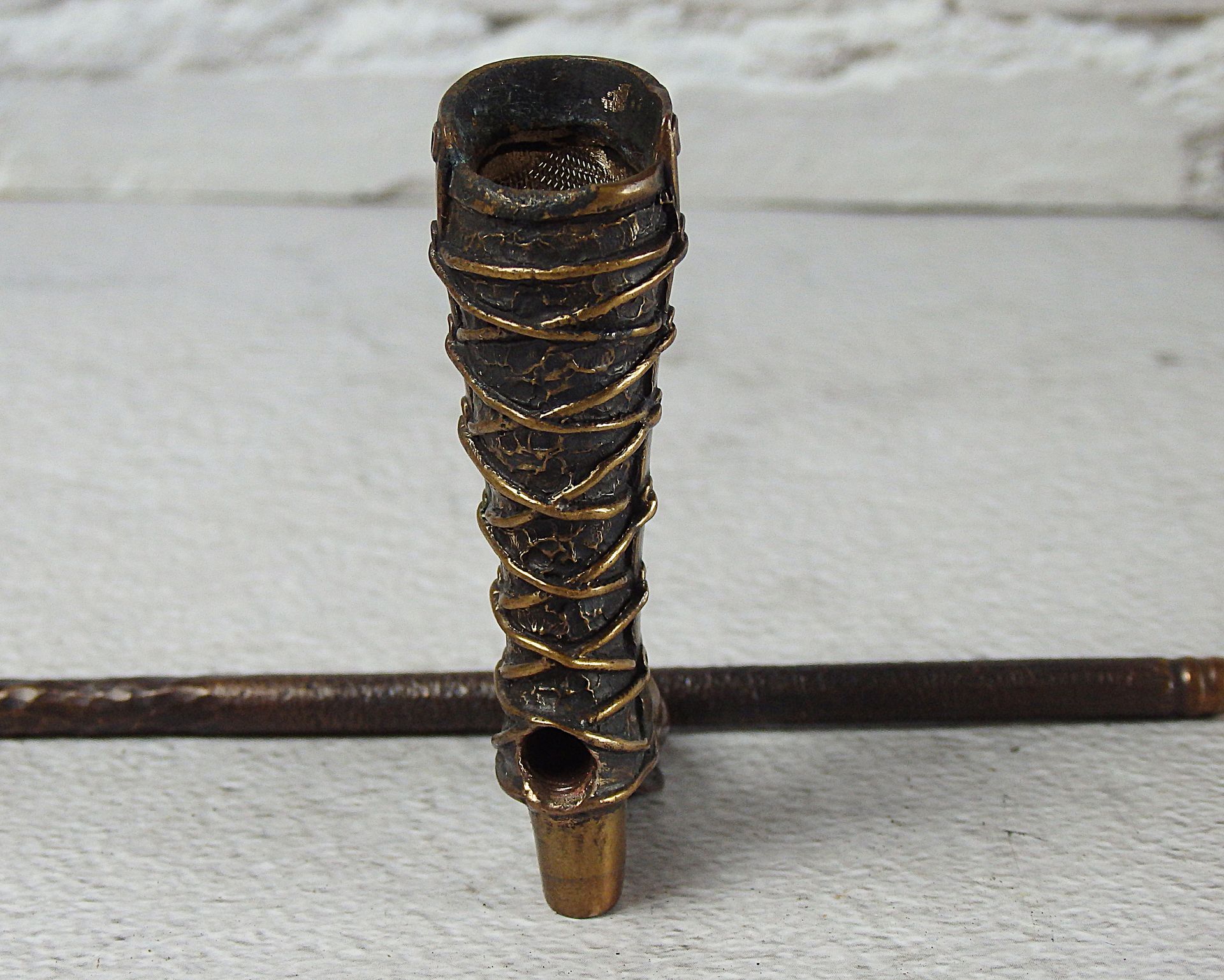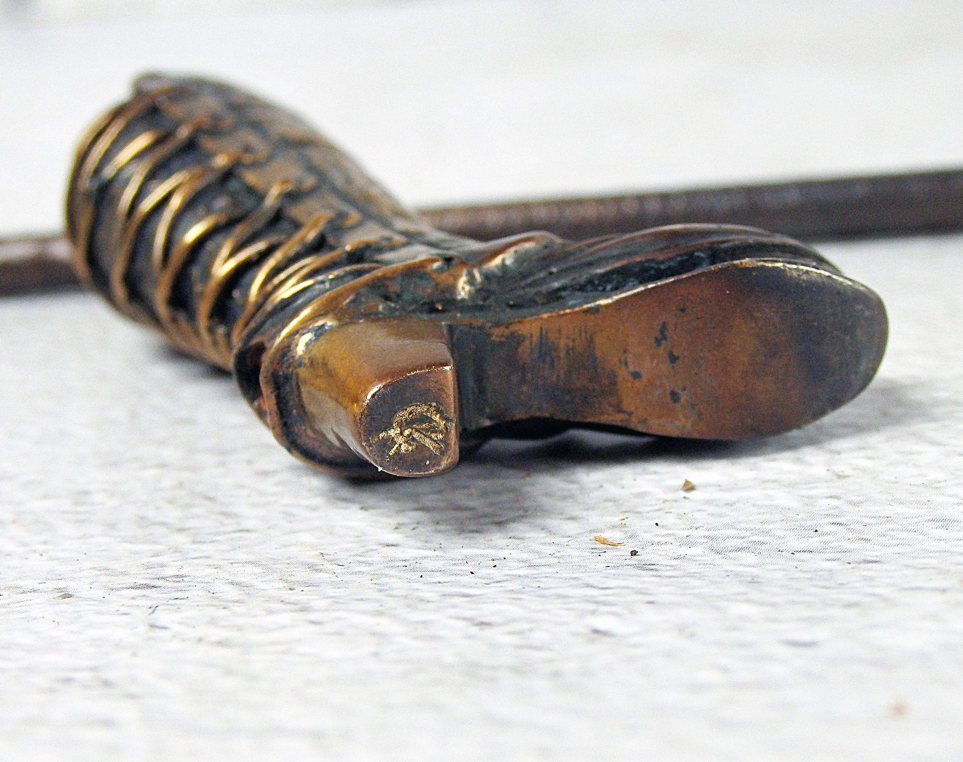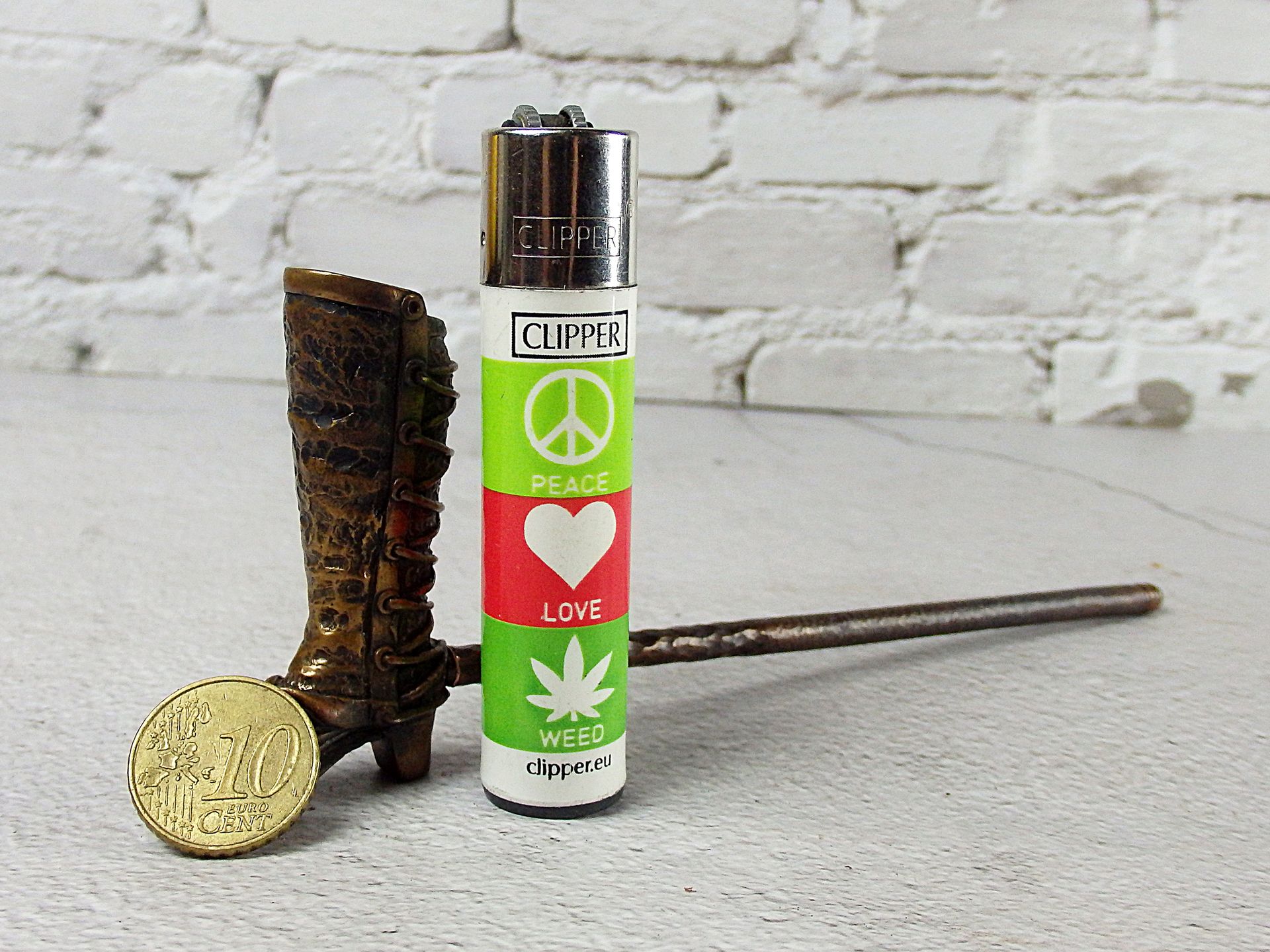 The original bronze smoking pipe in the shape of a boot with teeth. Please note - only part of the boot is used under the bowl.