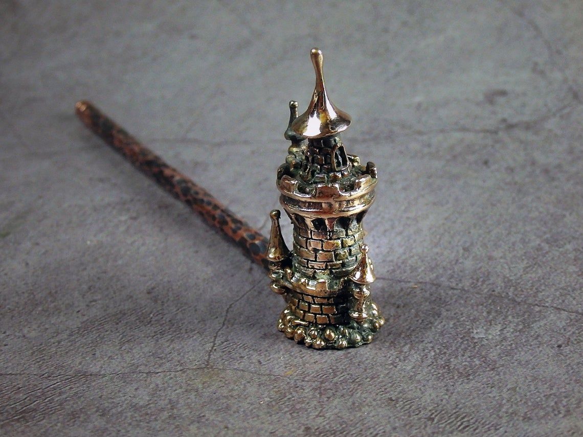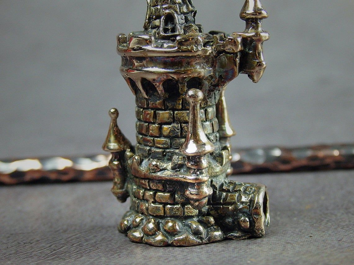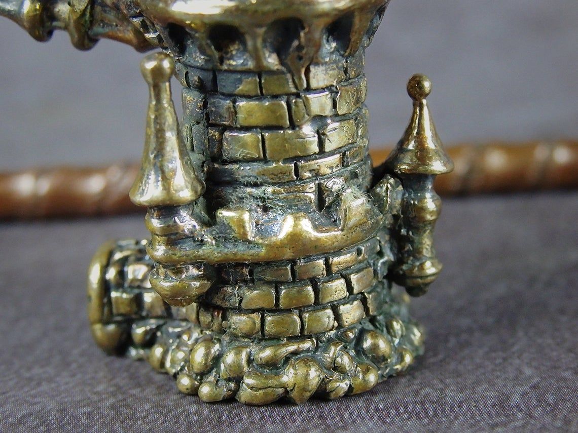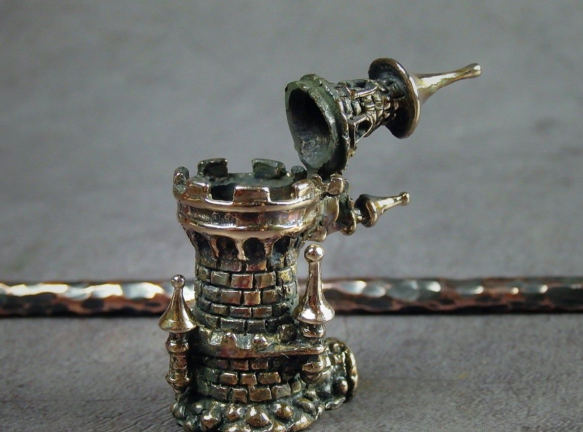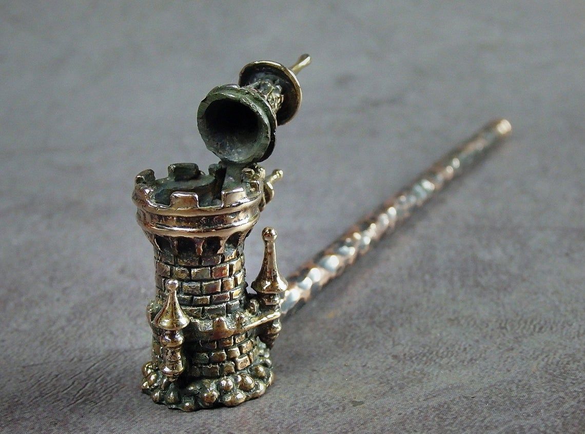 Handmade bronze smoking pipe in the shape of watchtower with roof - lid.
