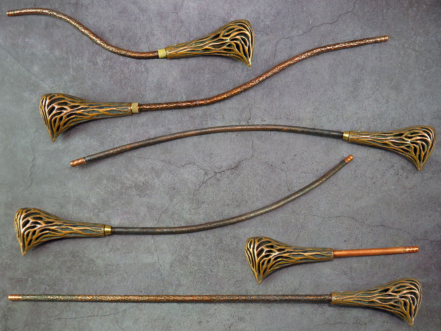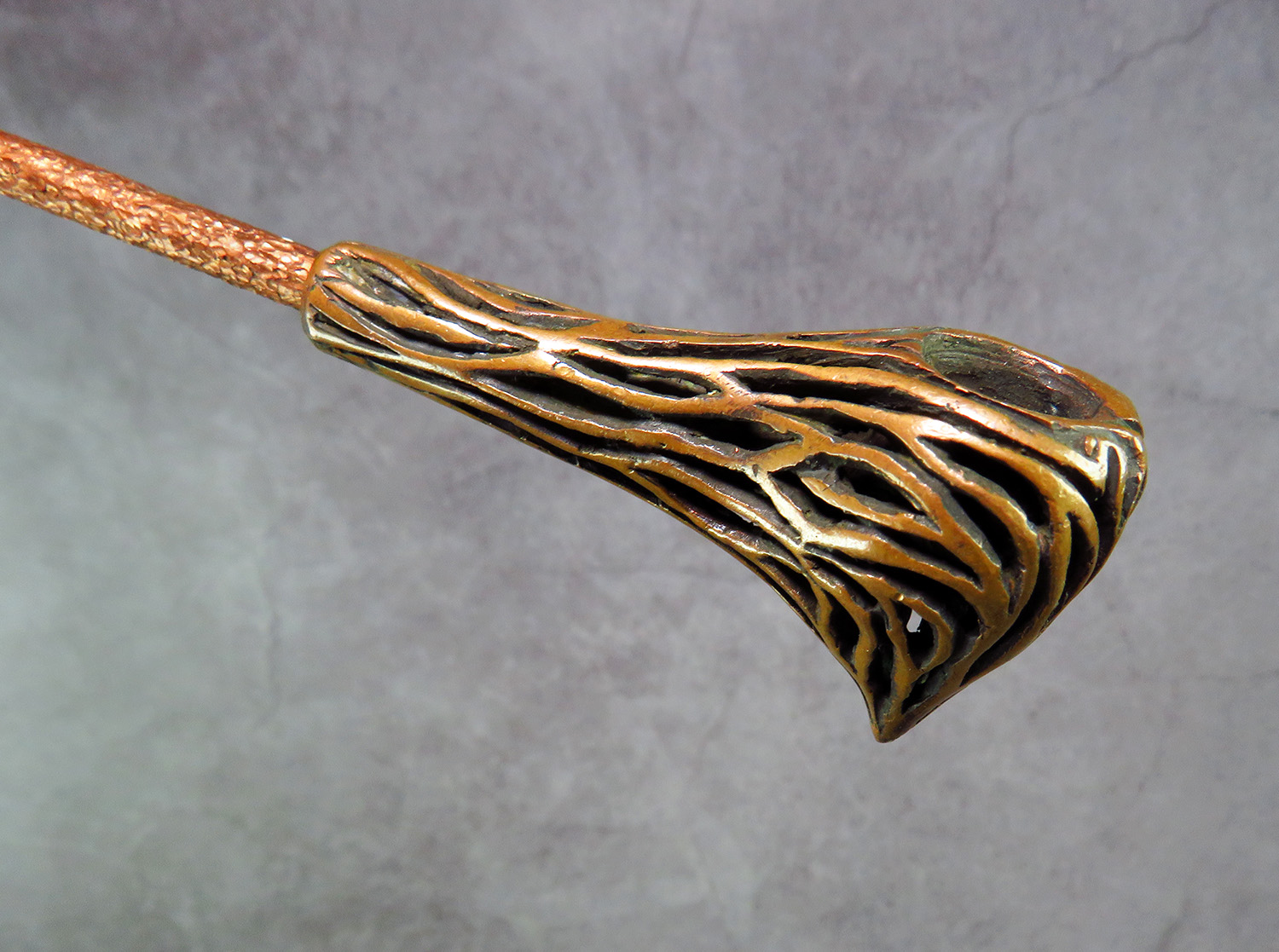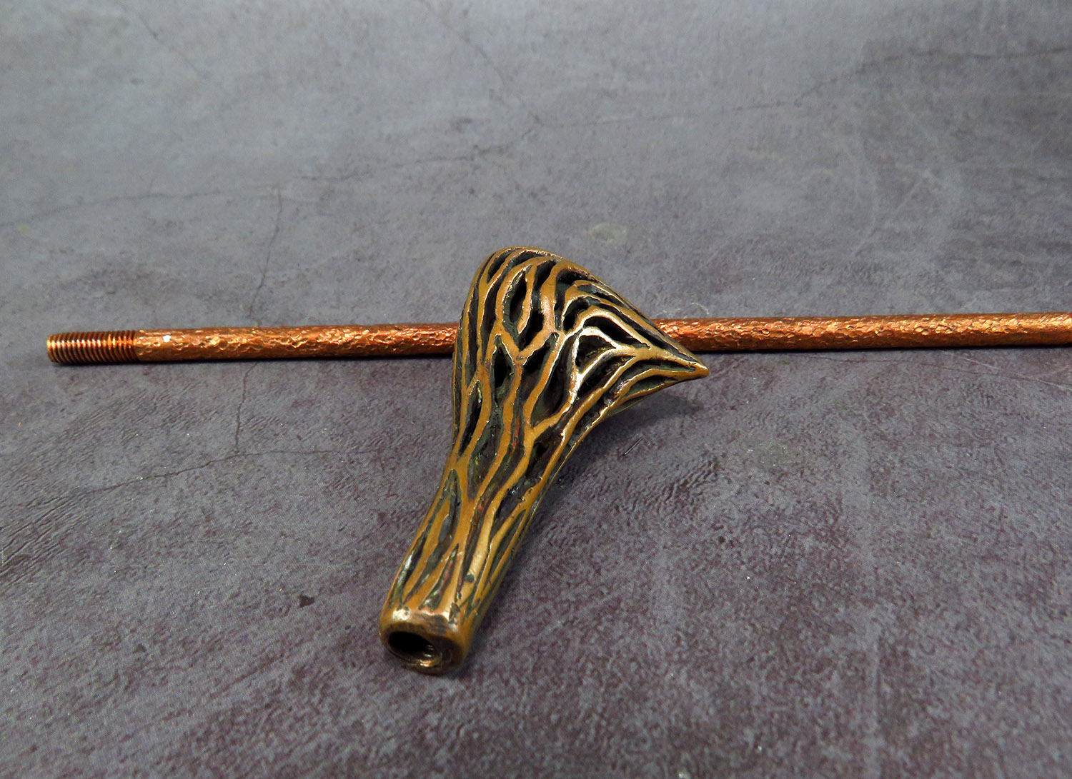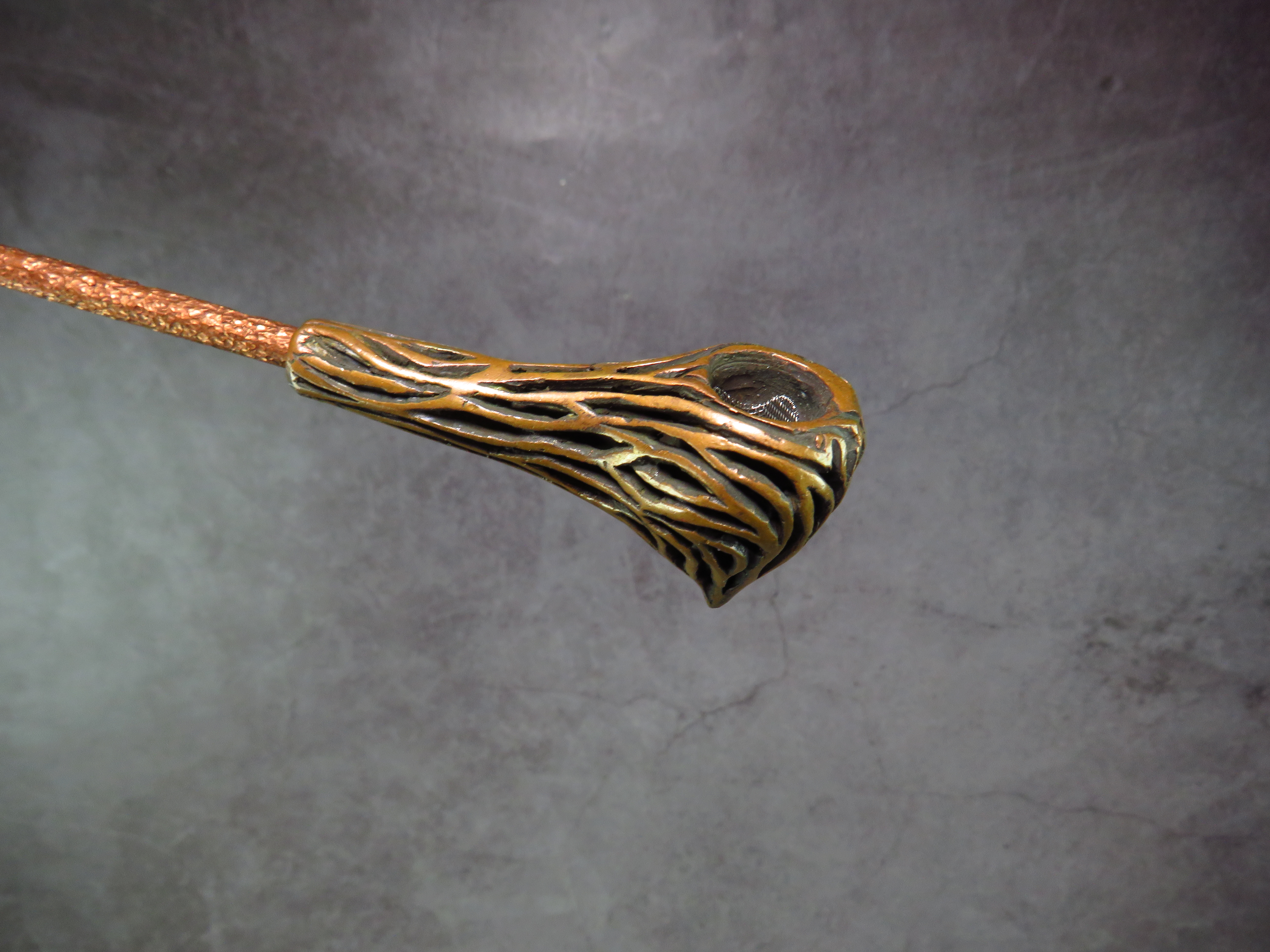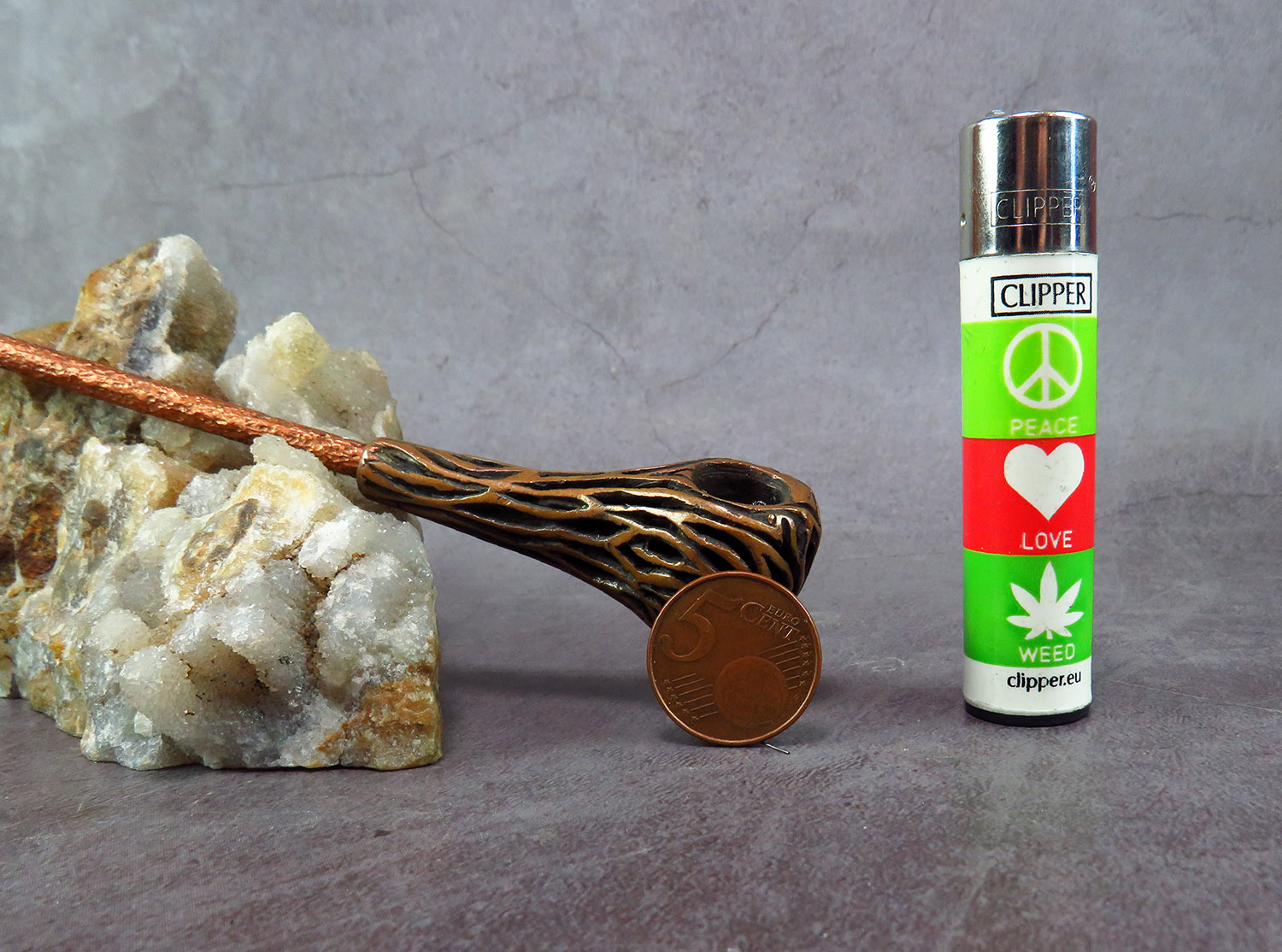 Bronze smoking pipe of an unusual shape with an openwork wooden texture. The mouthpiece is made of copper, it is screwed on, can have a length (from 3 to 30 cm) and a shape at the request of the buyer. Note! When choosing a mouthpiece, keep in mind that this pipe can stand on a plane only with straight mouthpiece.