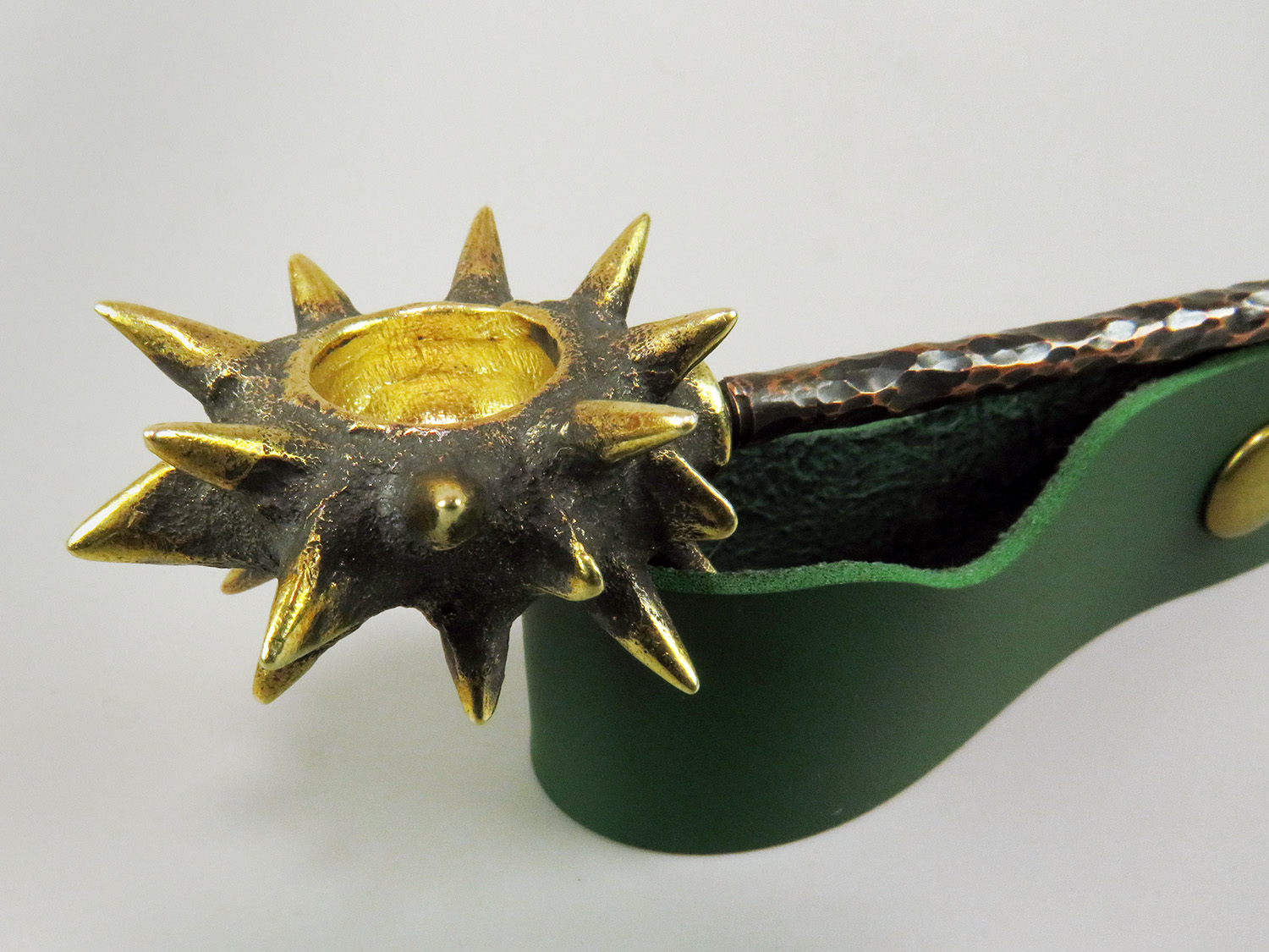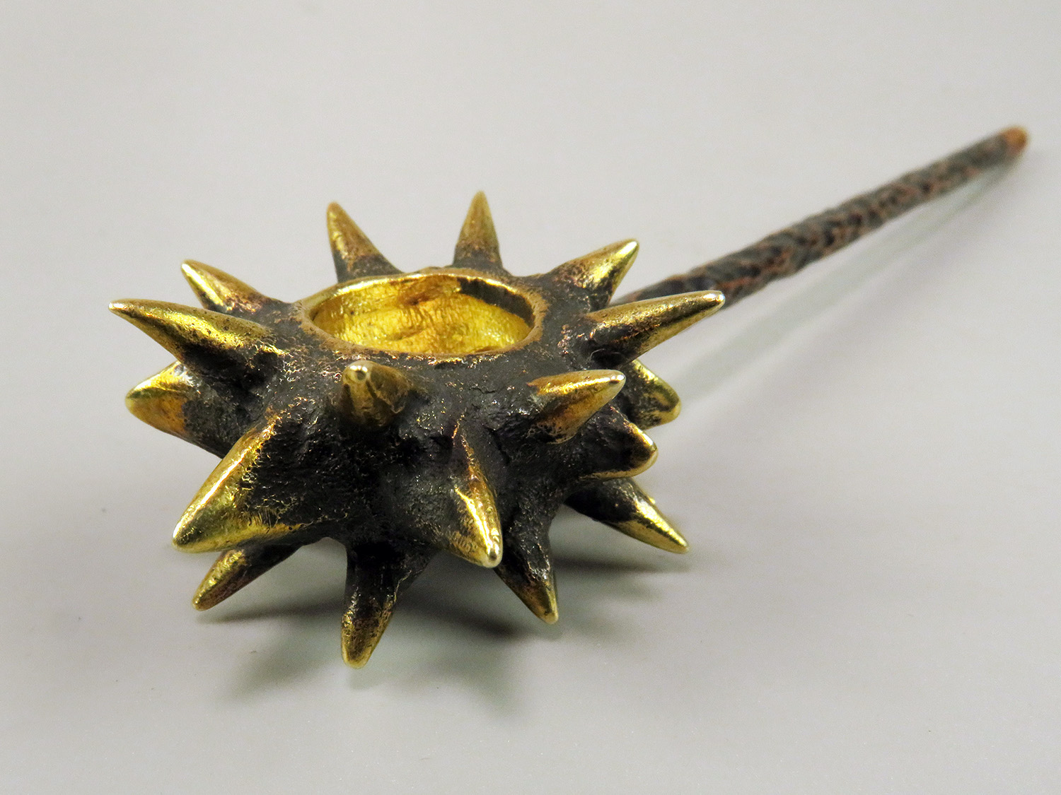 To make this item, a wax model was cut out by hand. Then, using the lost wax method, bronze parts were cast.