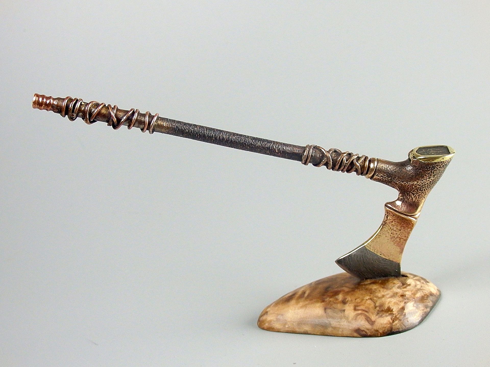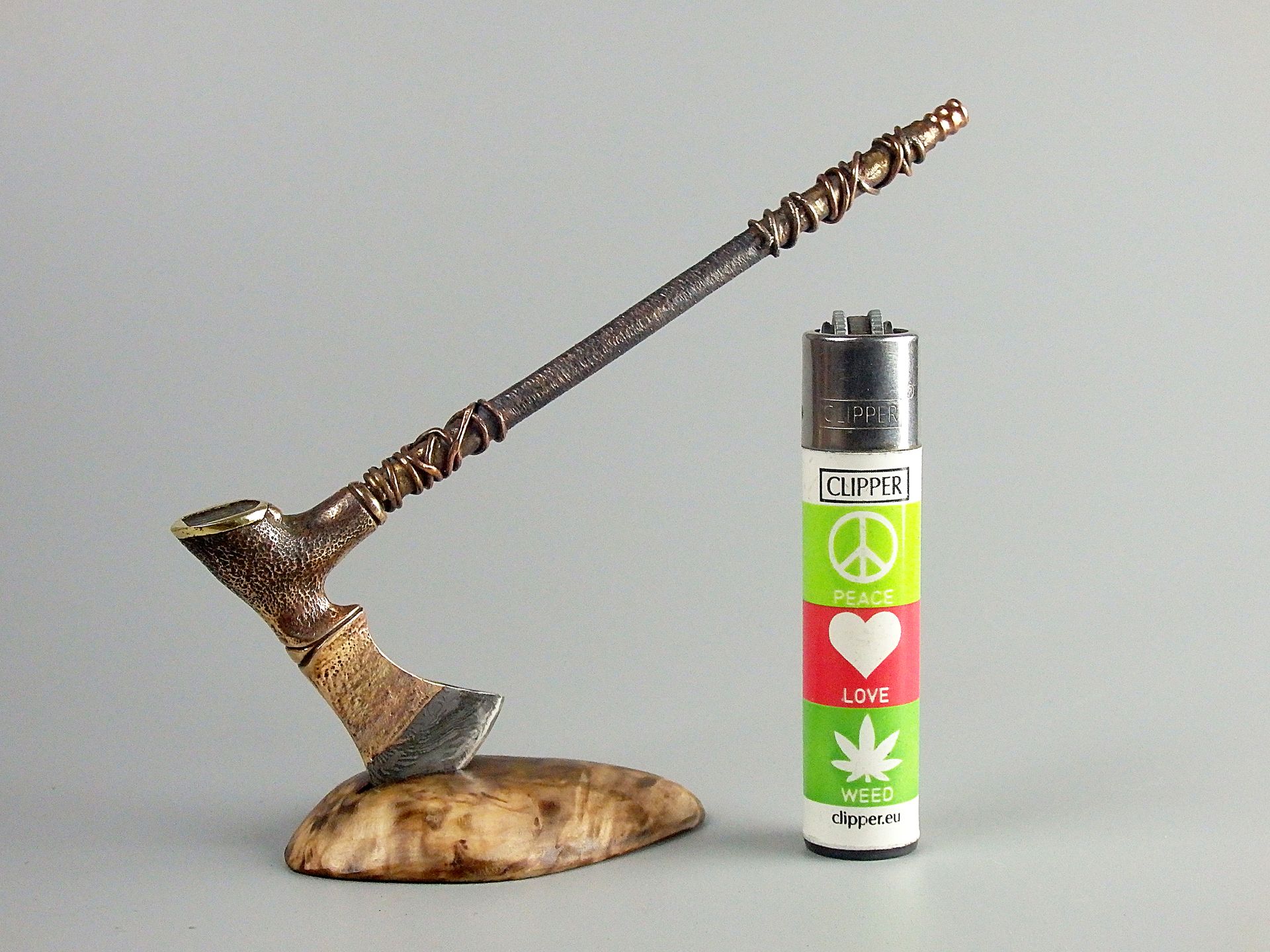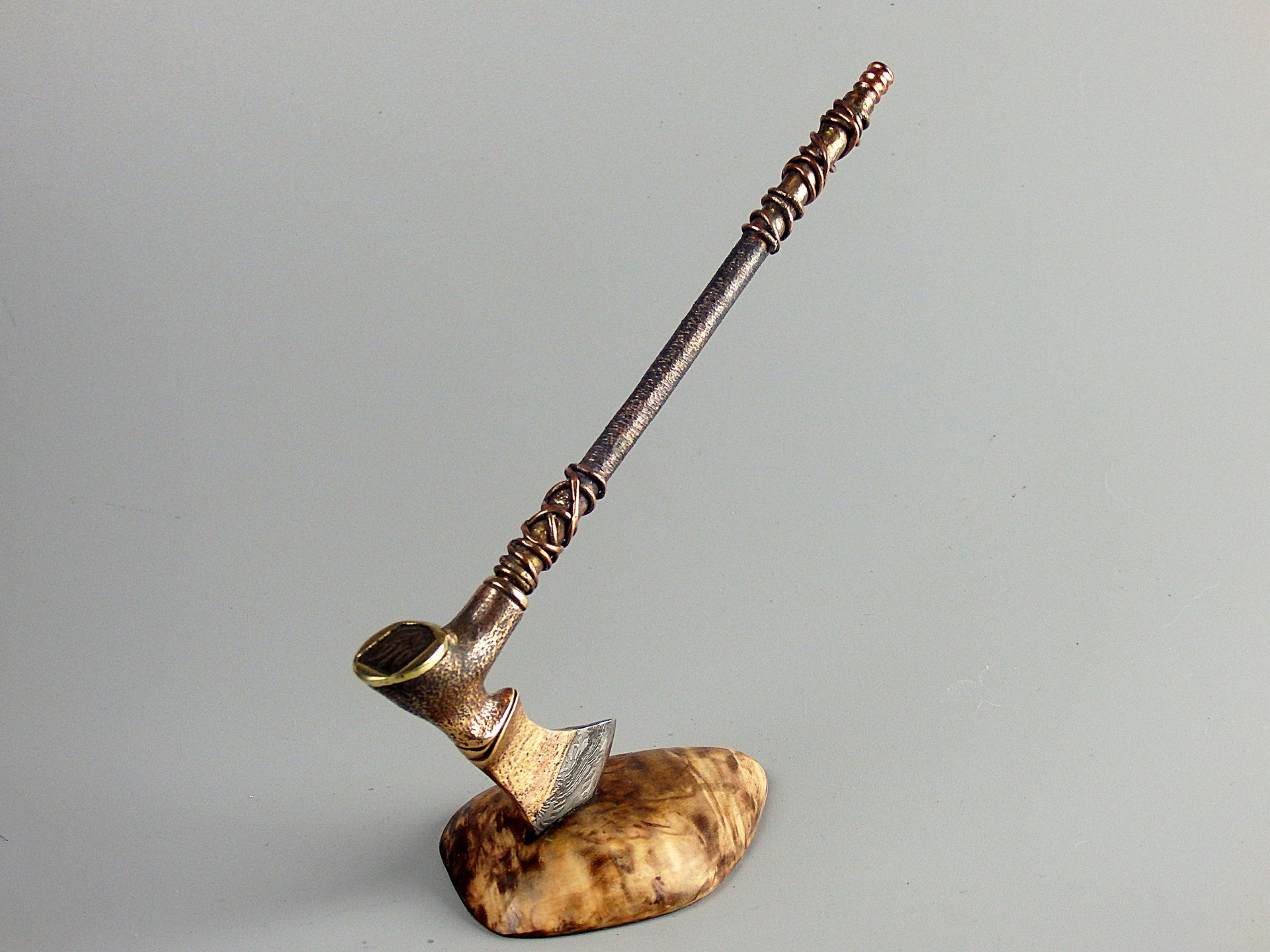 Small bronze pipe in the form of a medieval ax with a Ukrainian trident on the lid. The ax blade is made of Damascus steel and therefore requires careful handling (sharp edge). The stand is made of wood (birch burl). The mouthpiece is made of copper (with copper wire), it is screwed on, can have a length (from 7 to 20 cm) at the request of the buyer. The pipe is working, not decorative, the model is tested by the master.