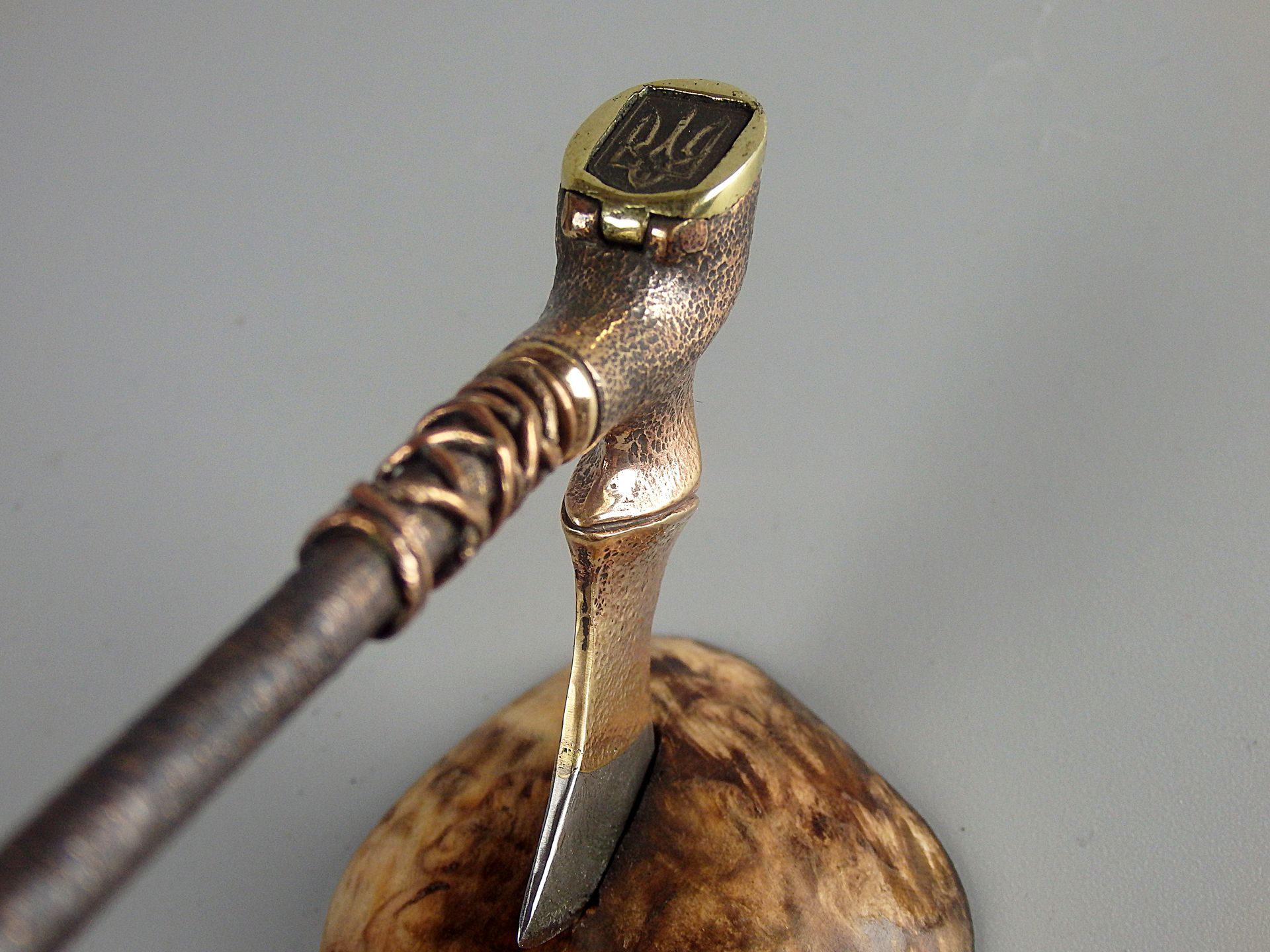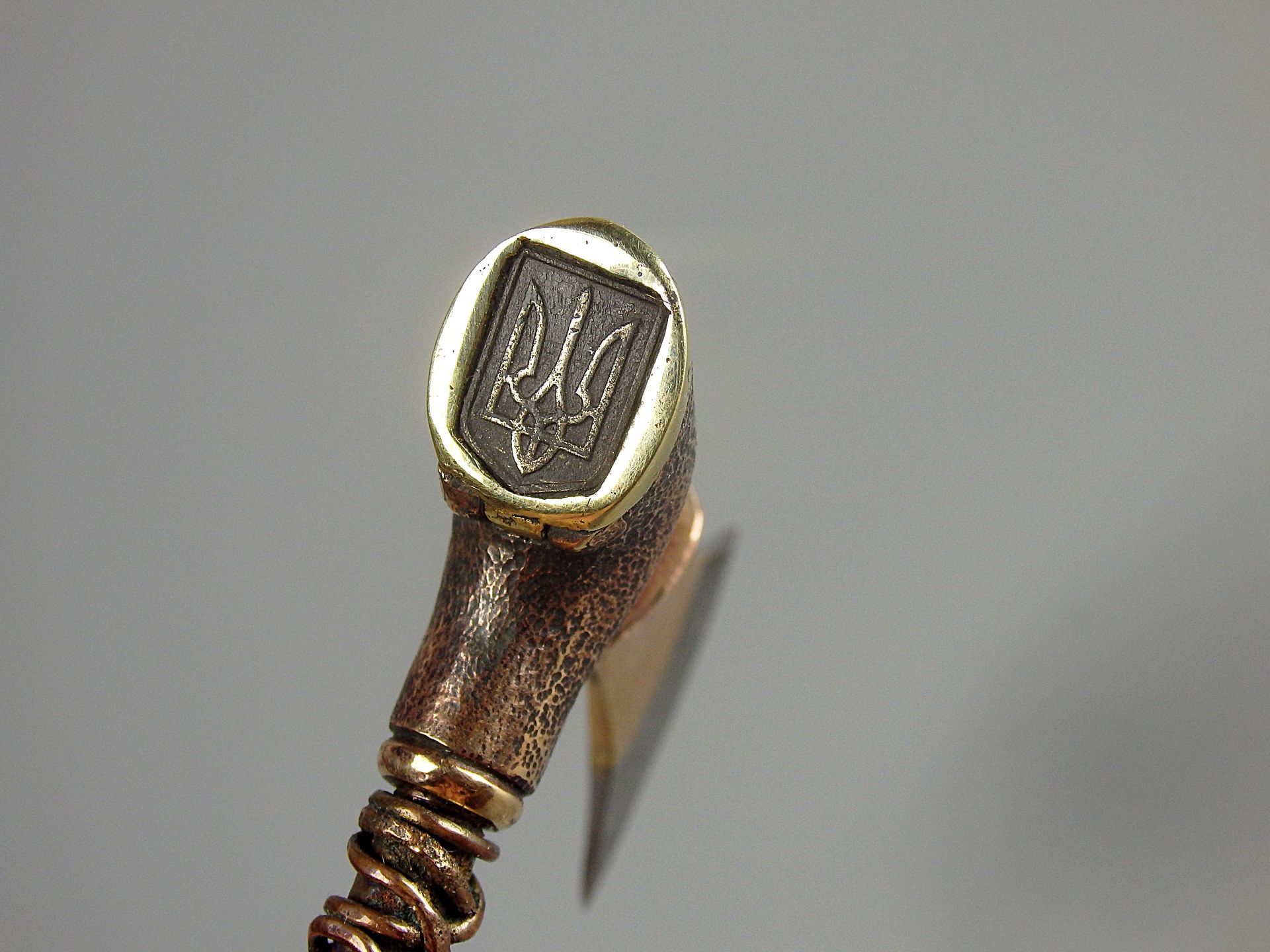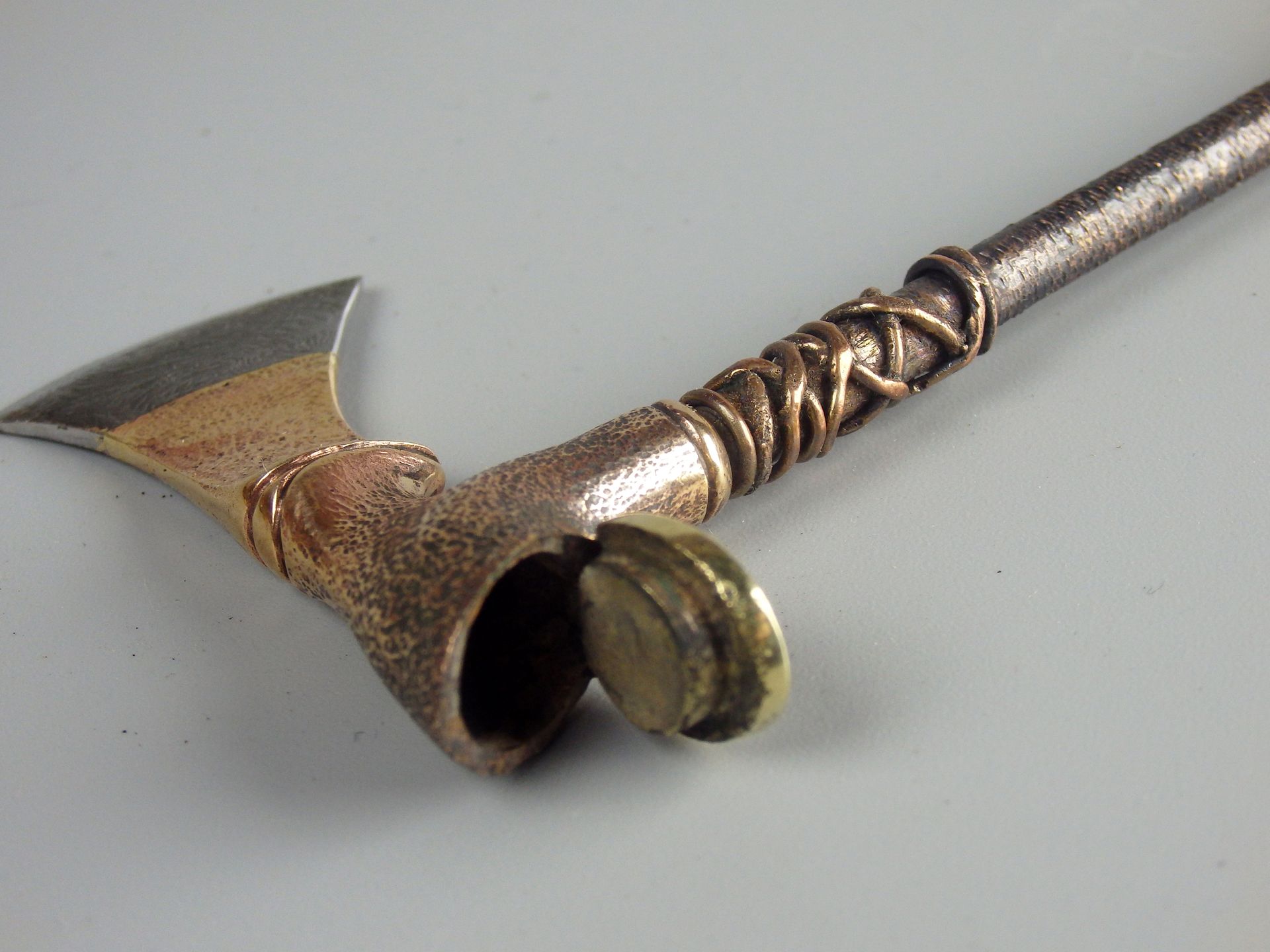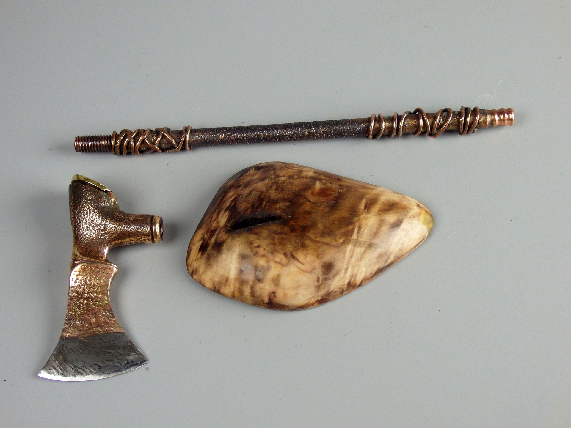 Small bronze pipe in the form of a medieval ax with a Ukrainian trident on the lid. The ax blade is made of Damascus steel and therefore requires careful handling (sharp edge). The stand is made of wood (birch burl). The mouthpiece is made of copper (with copper wire), it is screwed on, can have a length (from 7 to 20 cm) at the request of the buyer. The pipe is working, not decorative, the model is tested by the master.