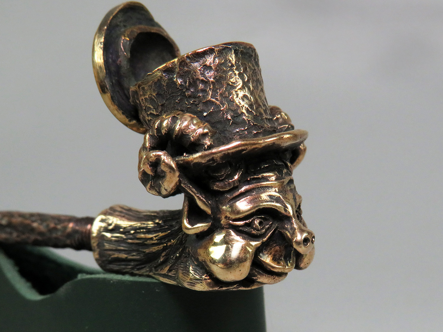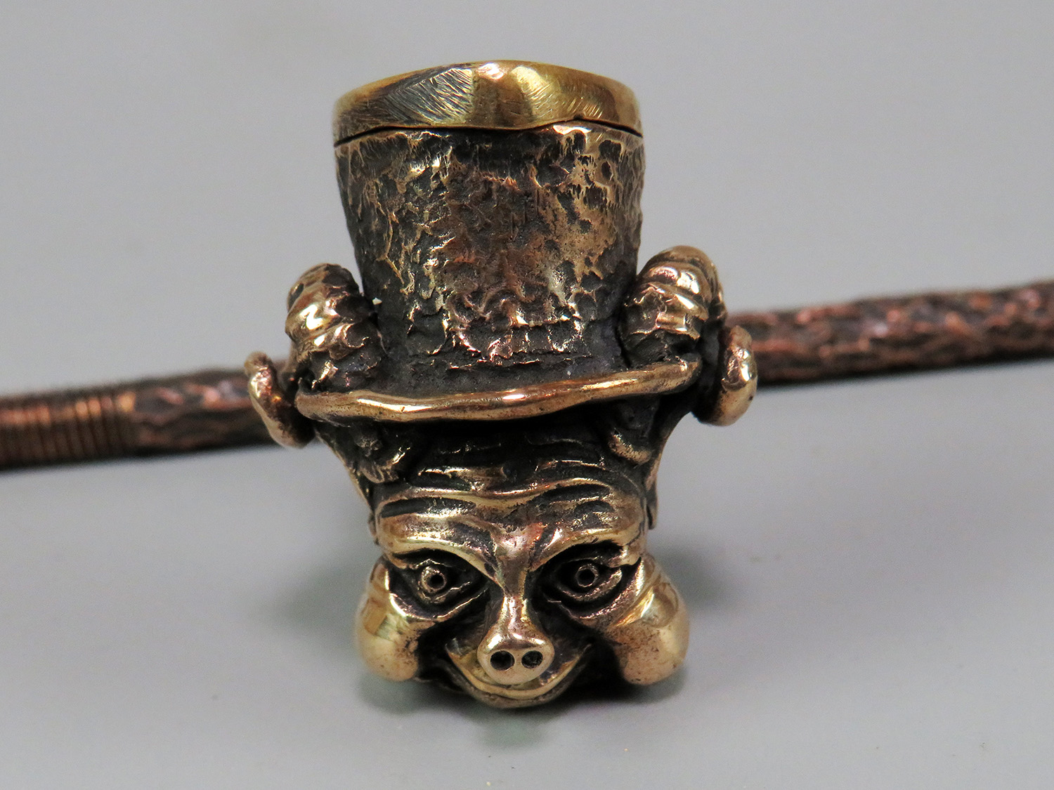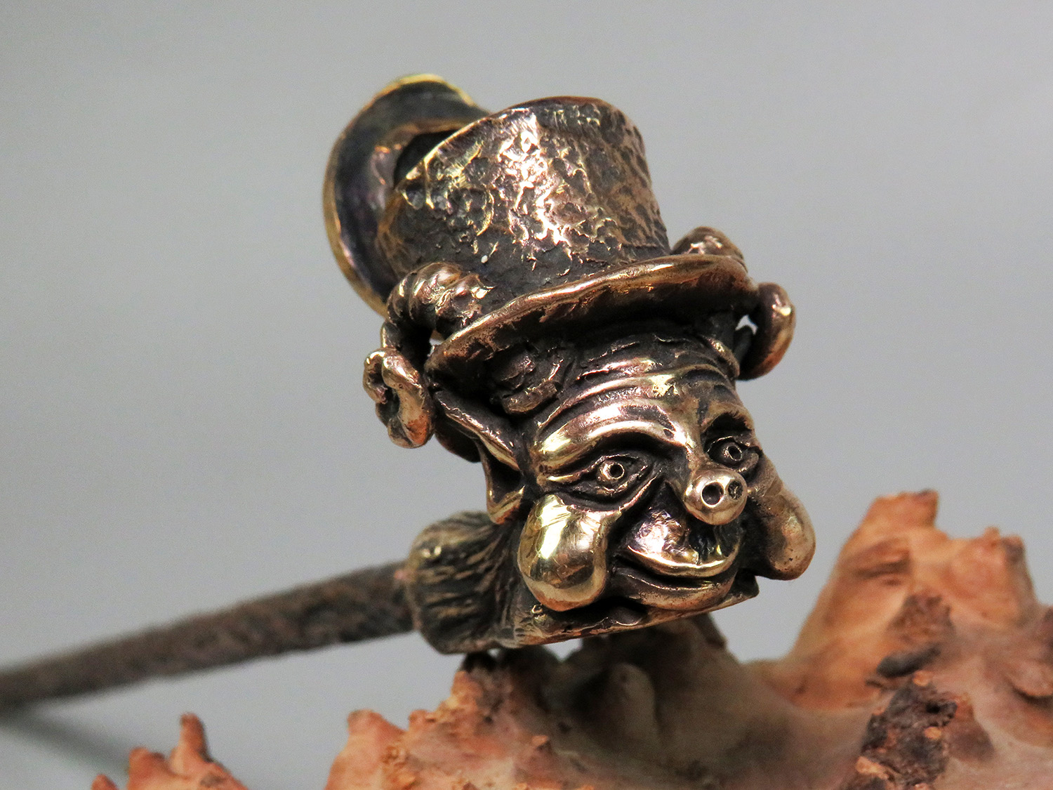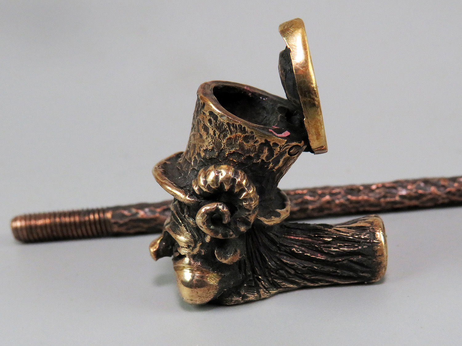 Bronze smoking pipe featuring a smiling Kobold — a character from German and Scandinavian mythology. This urbanized imp has donned a top hat and fled the rural backcountry for the industrial city, yet he never misses a chance to play tricks on unsuspecting folk.