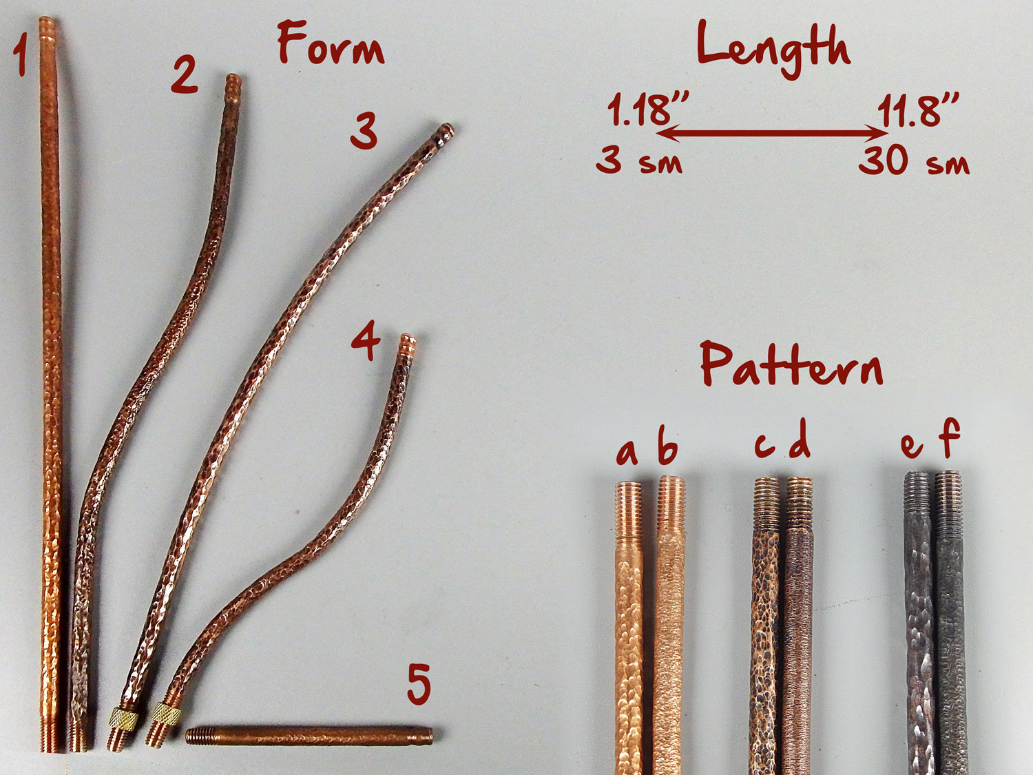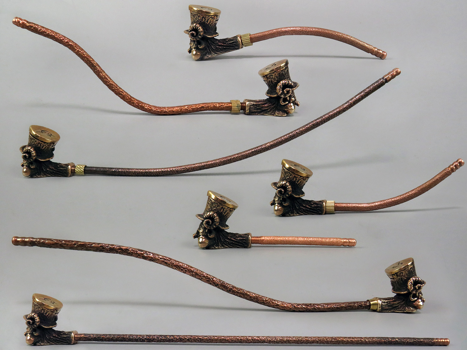 The mouthpiece is made of copper, it is screwed on, can have a length (from 3 to 30 cm) and a shape at the request of the buyer. Note that with curved mouthpiece, this pipe will not stand stable on the table (may fall).