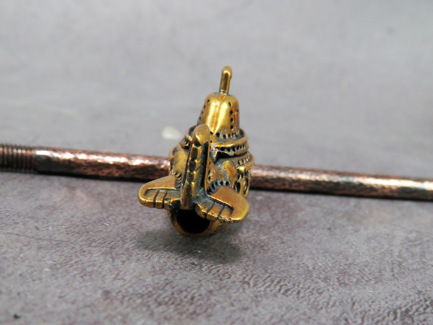 To make this item, a wax model was cut out by hand. Then, using the lost wax method, bronze parts were cast.
