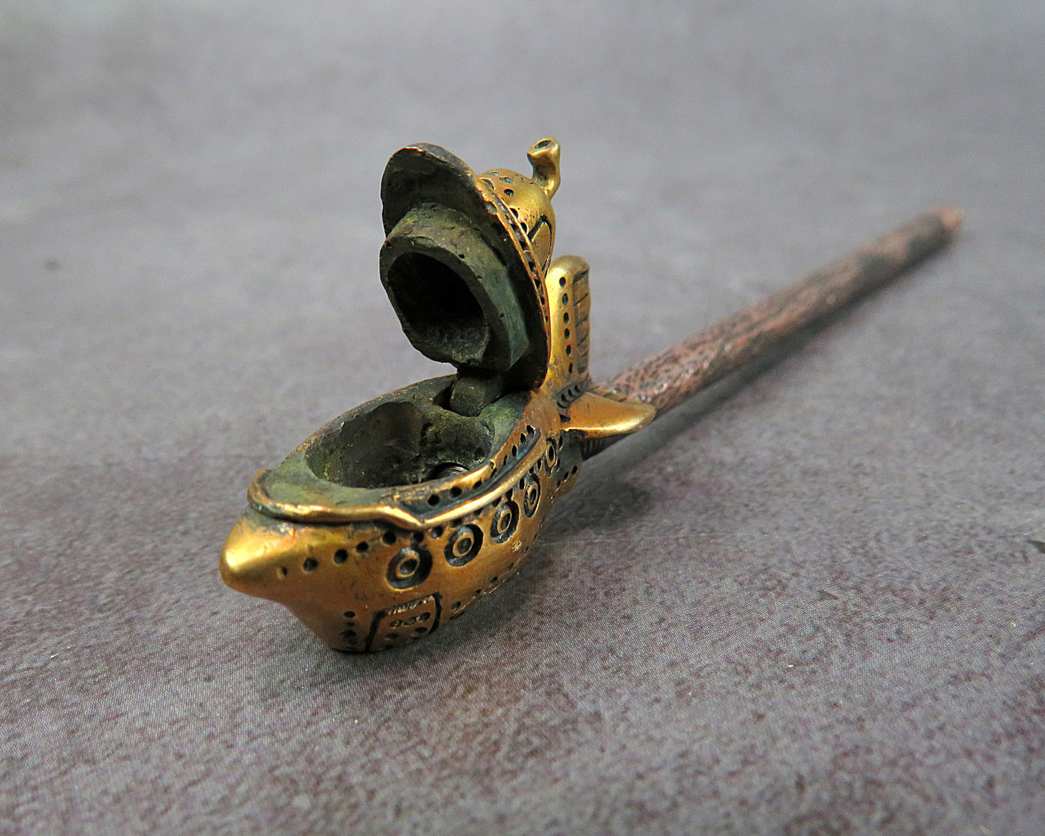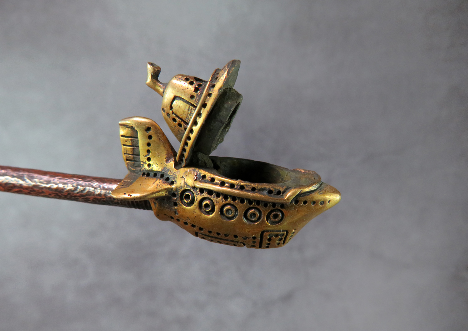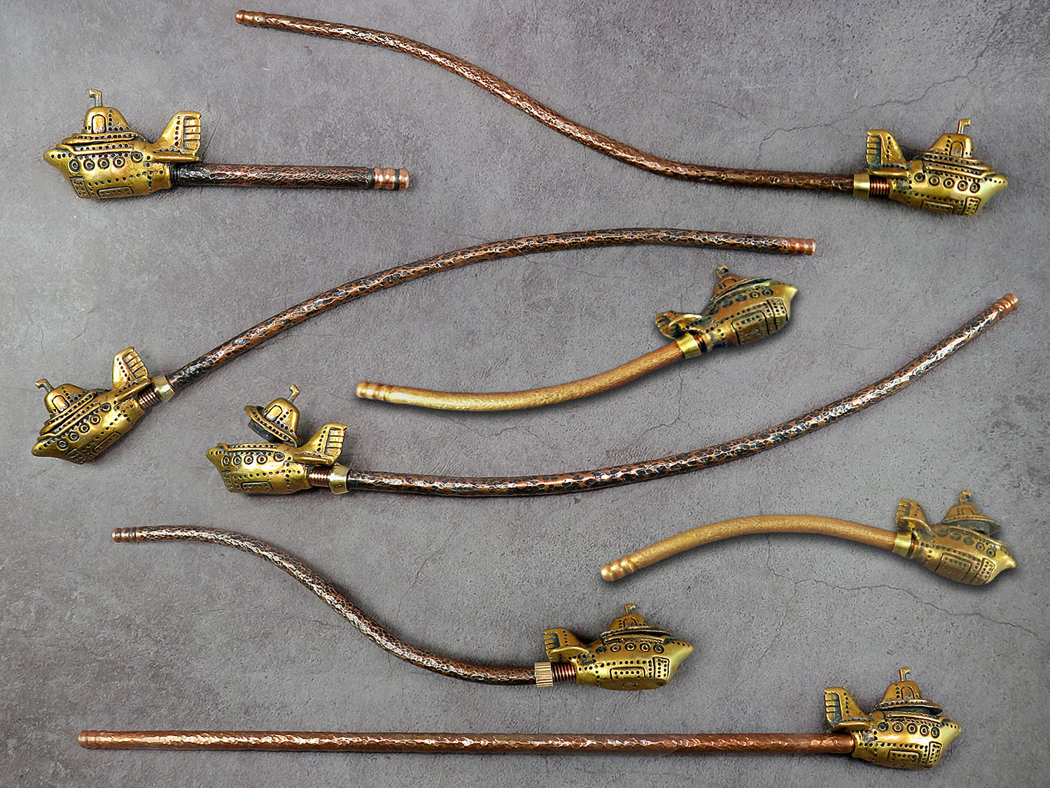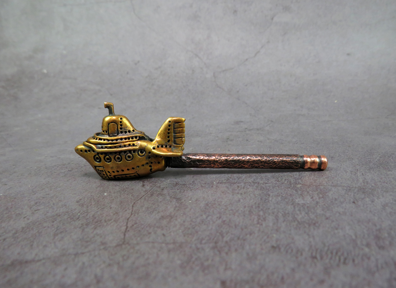 This cute little bronze pipe shaped like a submarine will make a great gift for hippies, flower children, baby boomers, and fans of 60s rock music. The mouthpiece is made of copper, it is screwed on, can have a length (from 3 to 30 cm) and a shape at the request of the buyer. Note! When choosing a mouthpiece, keep in mind that this pipe can stand on a plane only with straight mouthpiece.