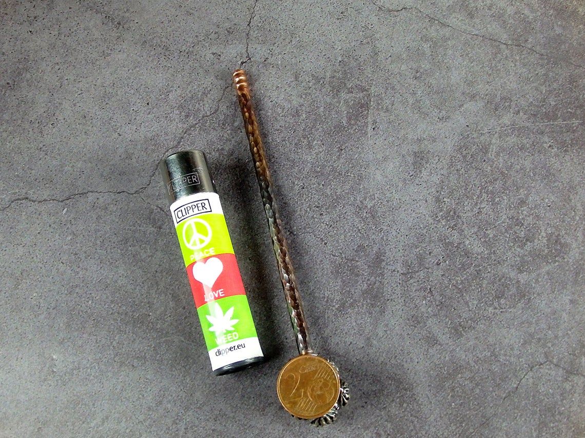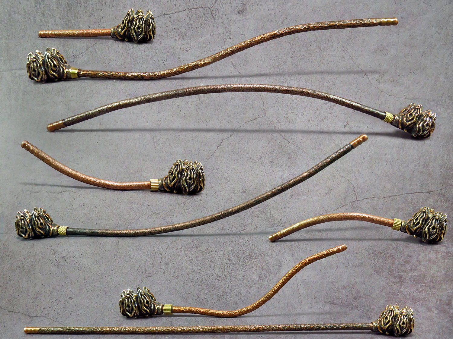 The mouthpiece is made of copper, it is screwed on, can have a length (from 3 to 30 cm) and a shape at the request of the buyer. The pipe is working, not decorative, the model is tested by the master.